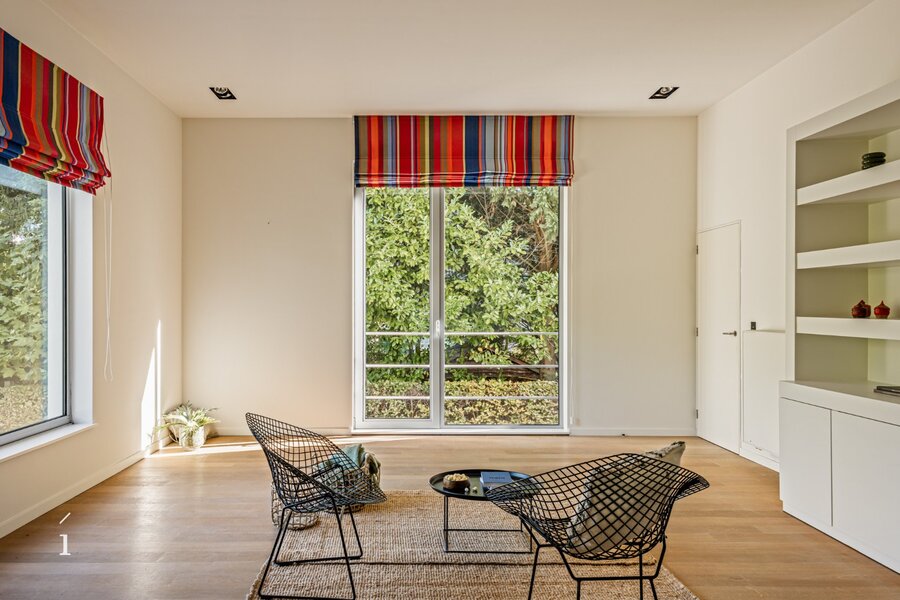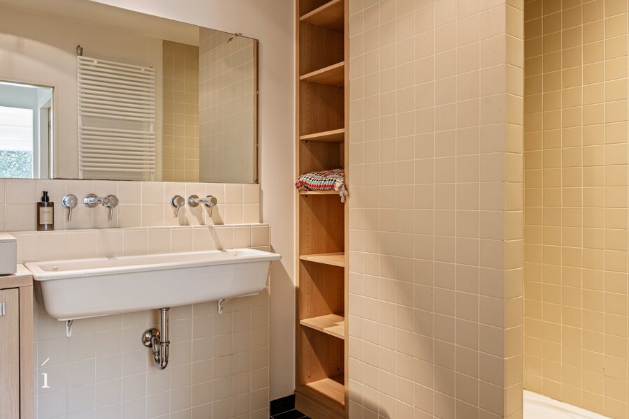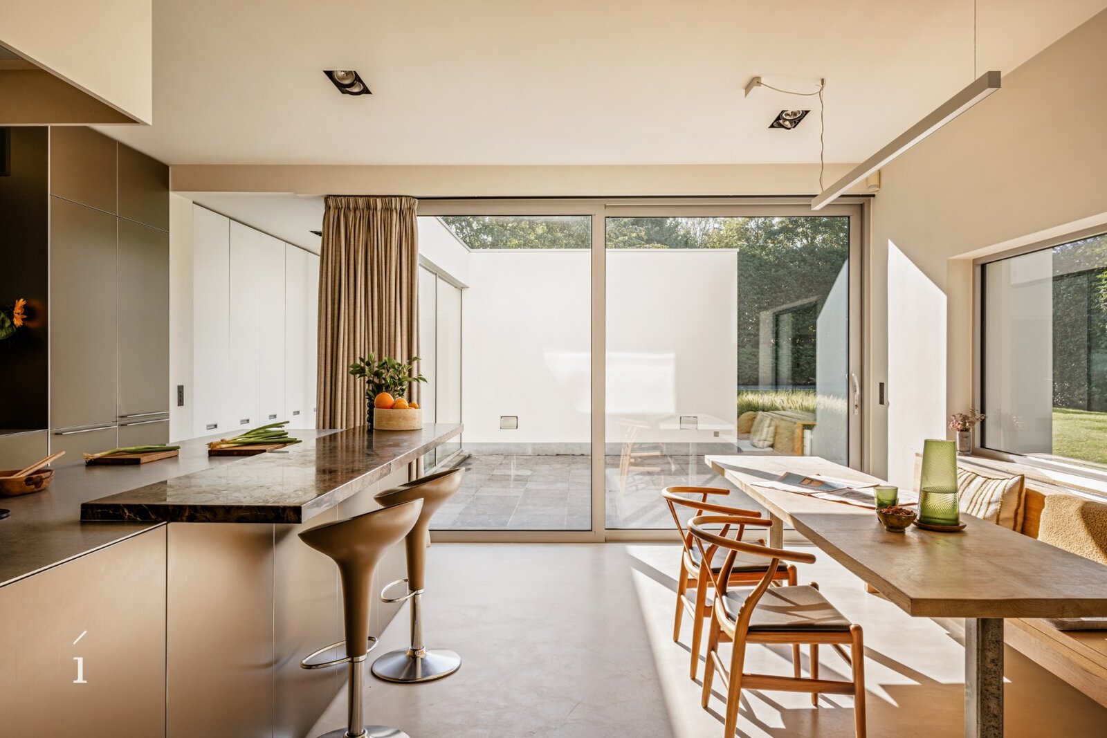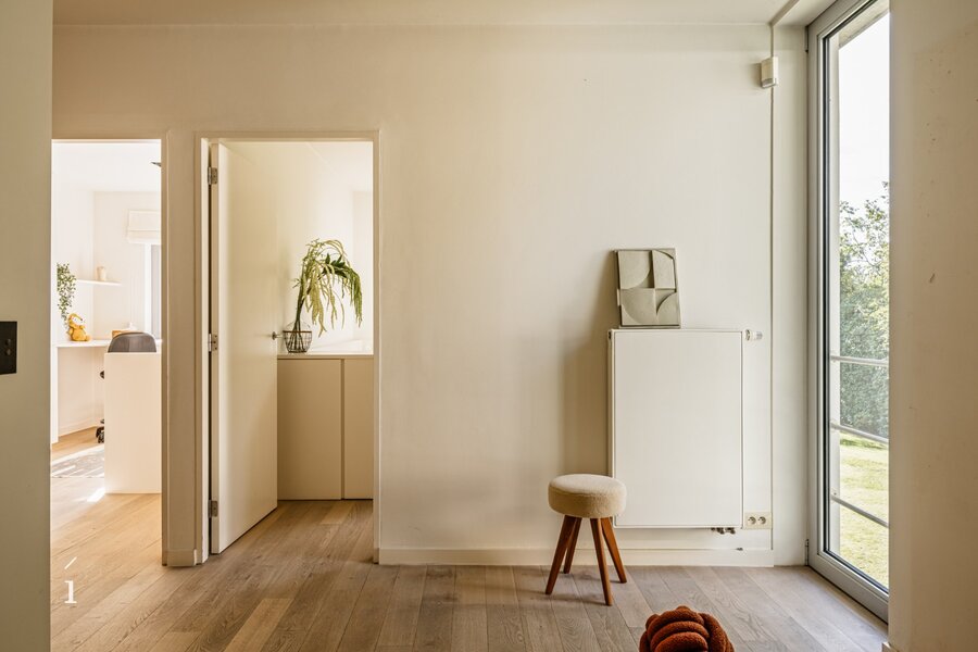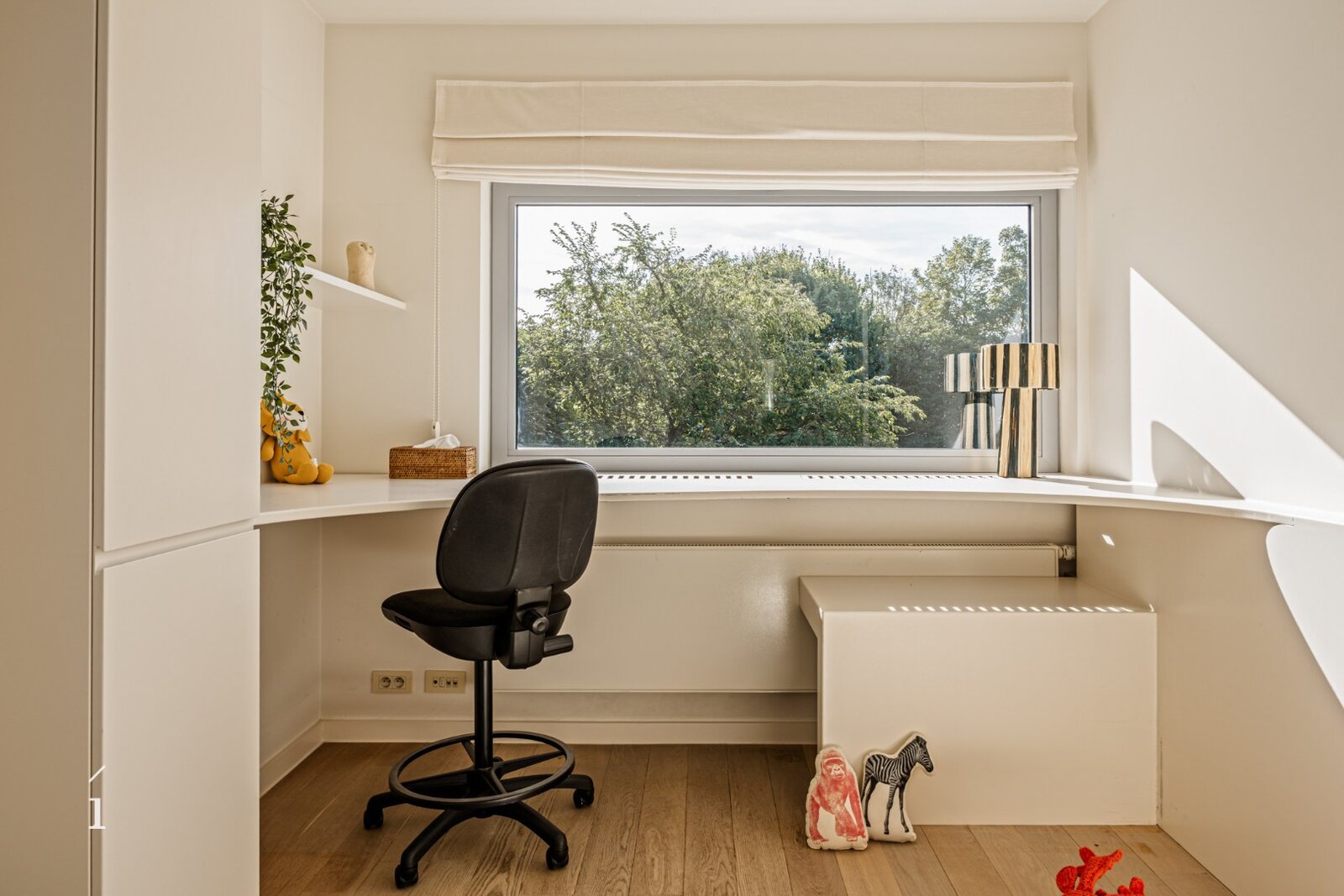 De aparte ingang met mudroom, extra vestiaire en toilet benadrukt het praktische comfort van deze woning. De keuken is een absolute blikvanger: een Bulthaup-keuken in champagnekleur, volledig uitgerust met hoogwaardige toestellen en een uitnodigende eetplaats. Via de keuken bereikt u een zonnig, intiem terras – perfect voor een ontbijt in de ochtendzon of een sfeervol aperitiefmoment.