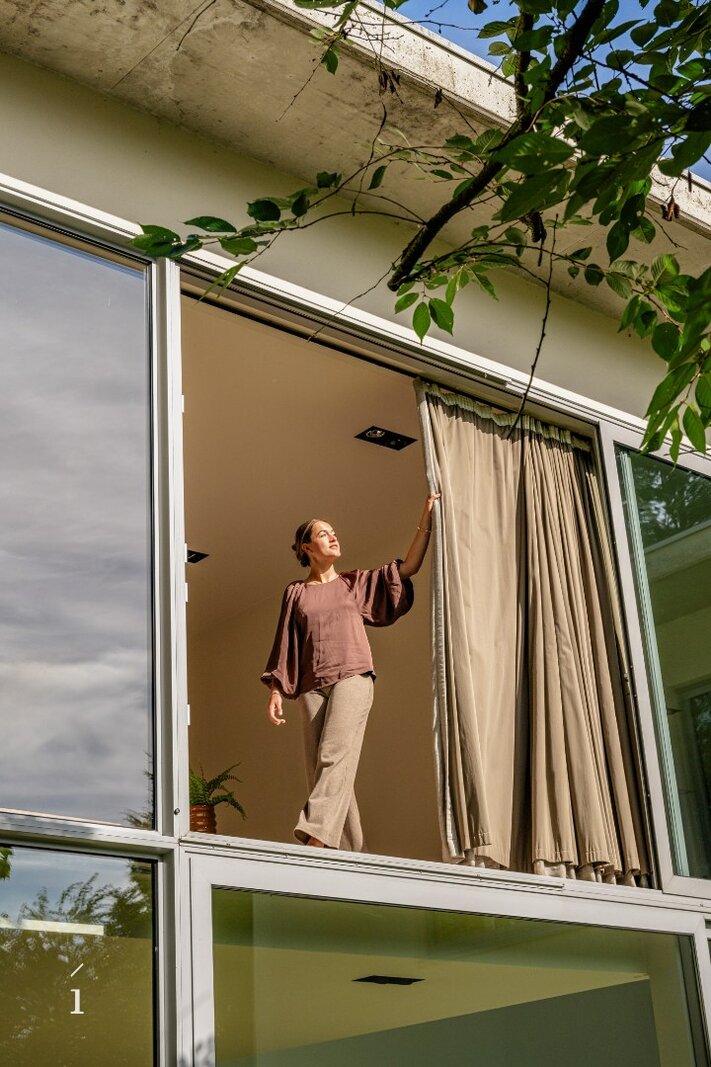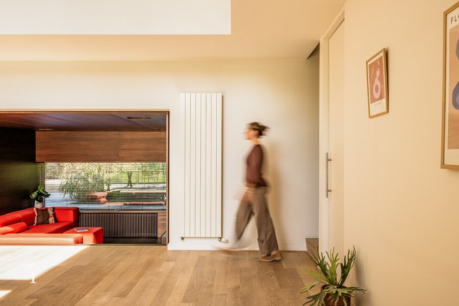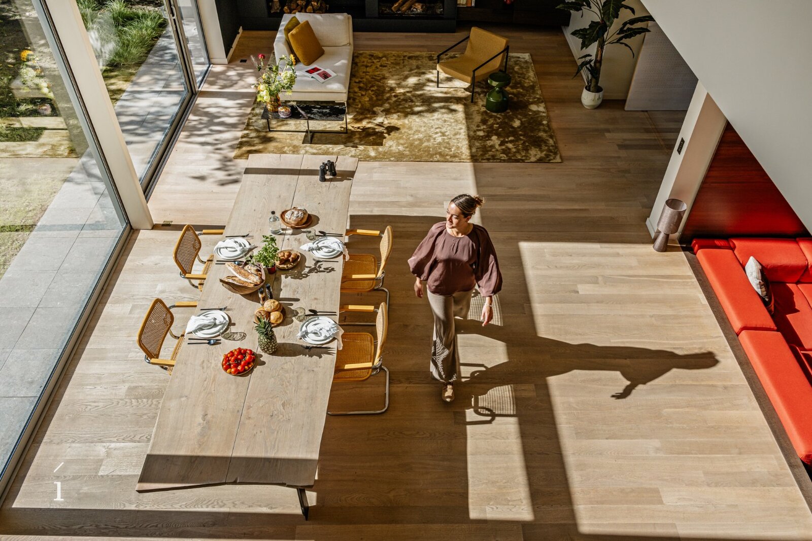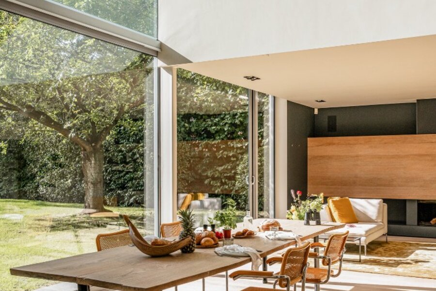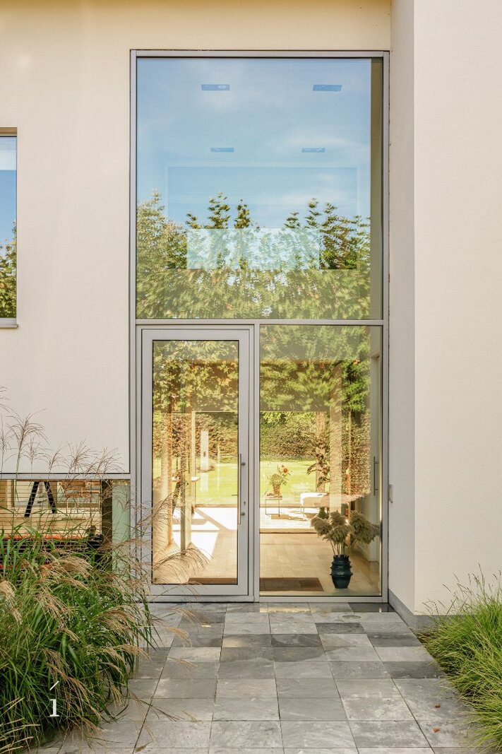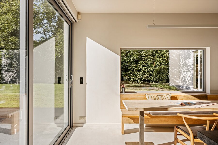 De aparte ingang met mudroom, extra vestiaire en toilet benadrukt het praktische comfort van deze woning. De keuken is een absolute blikvanger: een Bulthaup-keuken in champagnekleur, volledig uitgerust met hoogwaardige toestellen en een uitnodigende eetplaats. Via de keuken bereikt u een zonnig, intiem terras – perfect voor een ontbijt in de ochtendzon of een sfeervol aperitiefmoment.