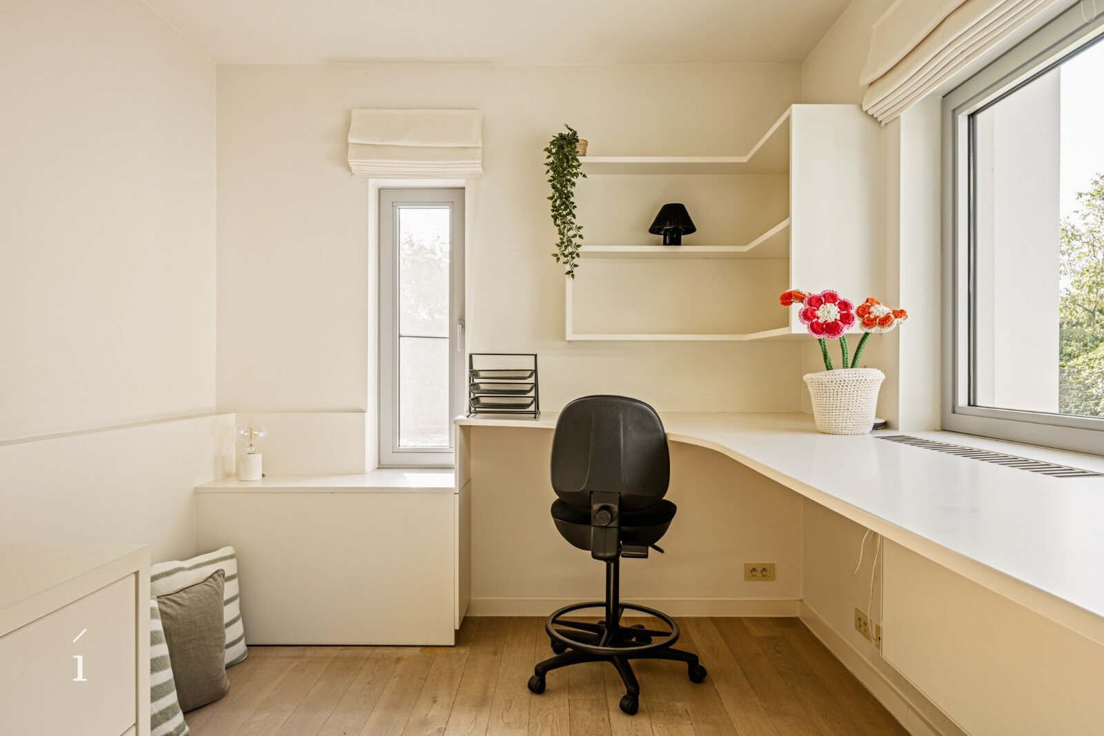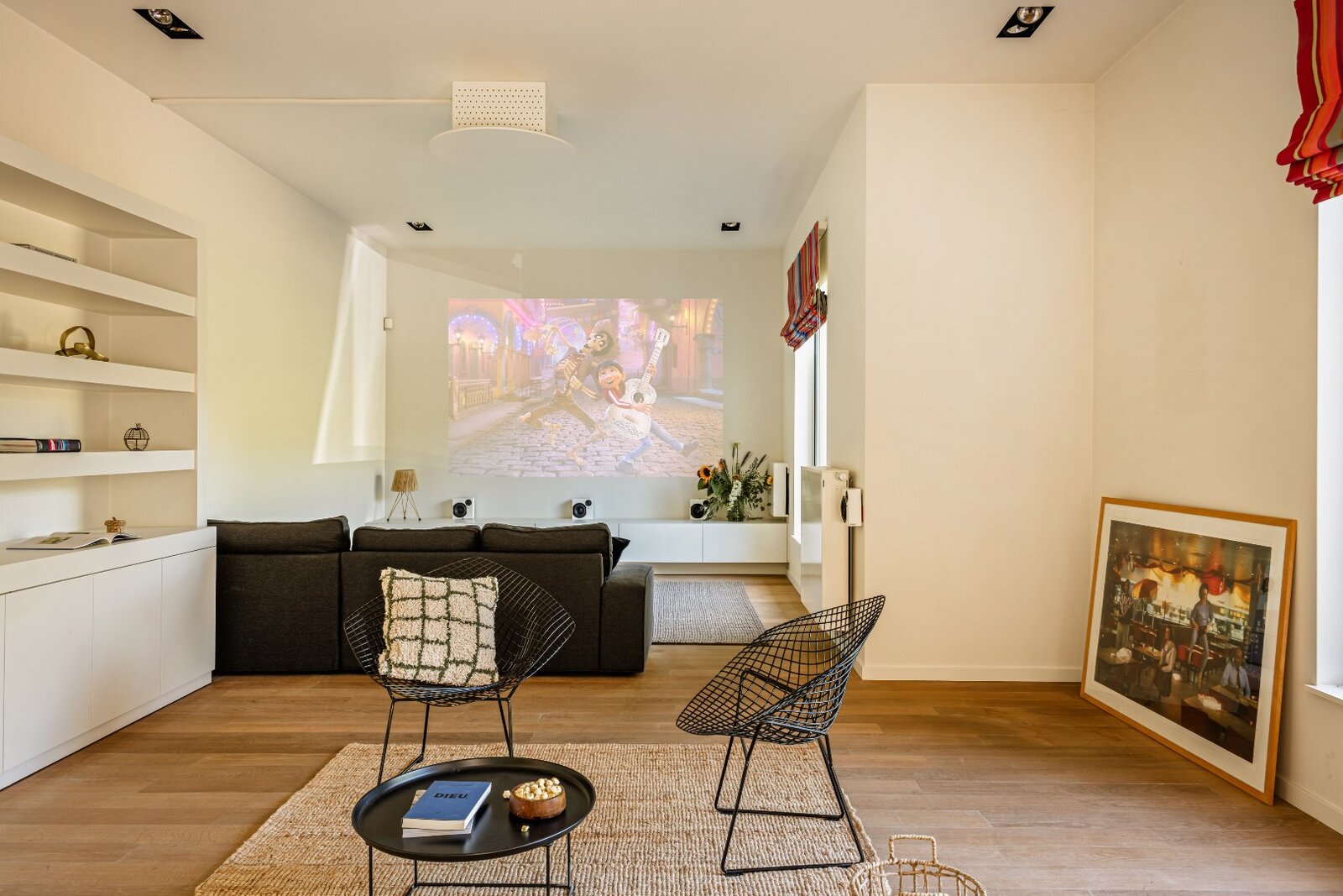 Op de eerste verdieping bevindt zich een imposante ontspannings- of vergaderruimte met hoge plafonds, momenteel ingericht als homecinema. De ouderlijke suite is royaal voorzien en bestaat uit een slaapkamer, een luxueuze badkamer met bad en douche, en een op maat gemaakte dressing. Daarnaast zijn er drie volwaardige kinderkamers, elk met ingebouwde kasten en bureaus, die samen een douchekamer delen. De nachthal met zicht op de vide versterkt het licht- en ruimtegevoel.