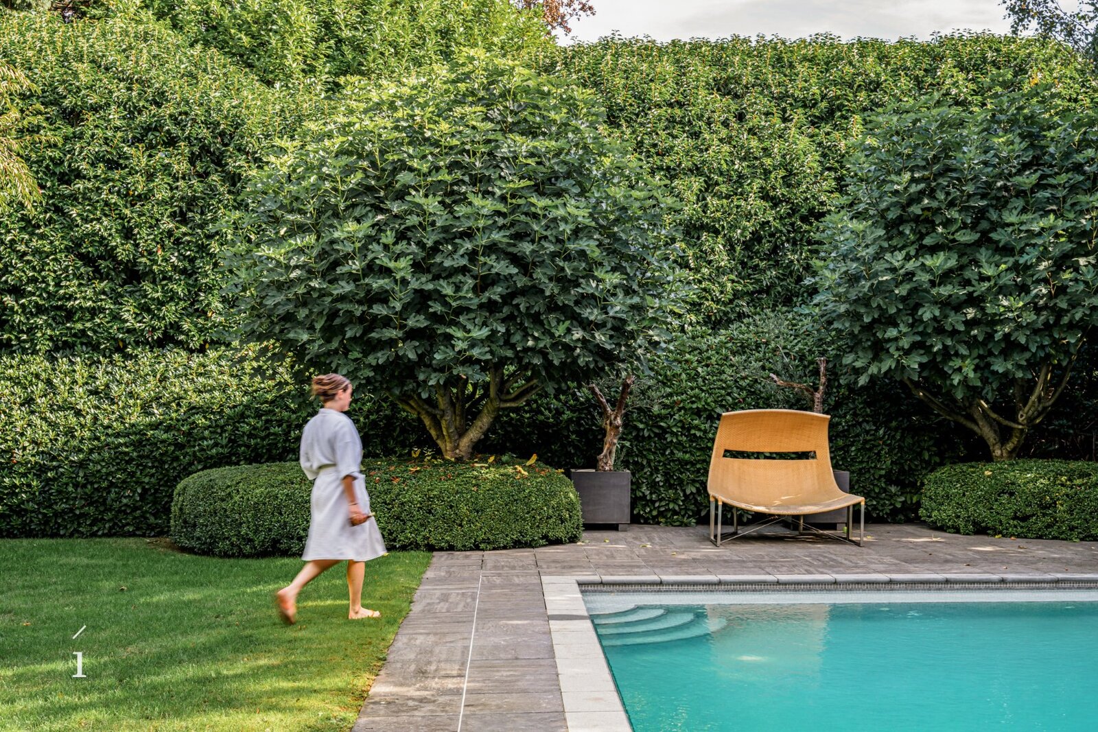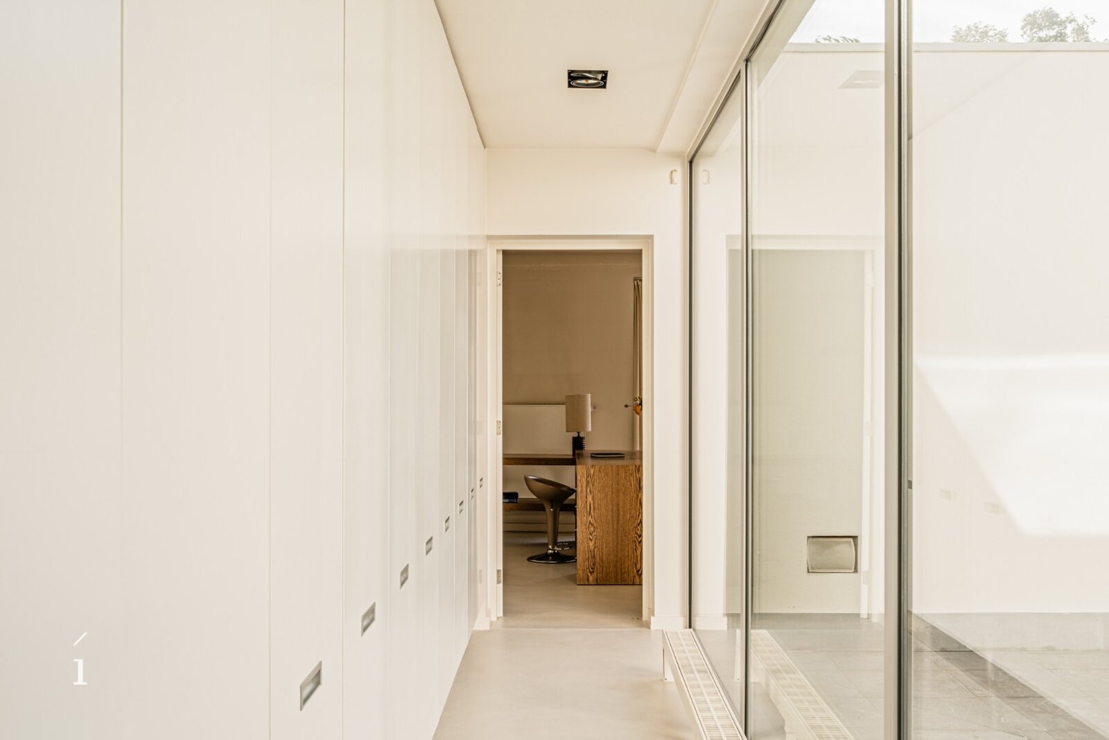 Een lichtrijke gang met maatkasten leidt naar een polyvalente ruimte met toegang tot het poolhouse. Deze veelzijdige ruimte biedt talloze mogelijkheden: van hobby- of ontspanningsruimte tot kantoor, gastenverblijf of nanny-verblijf.