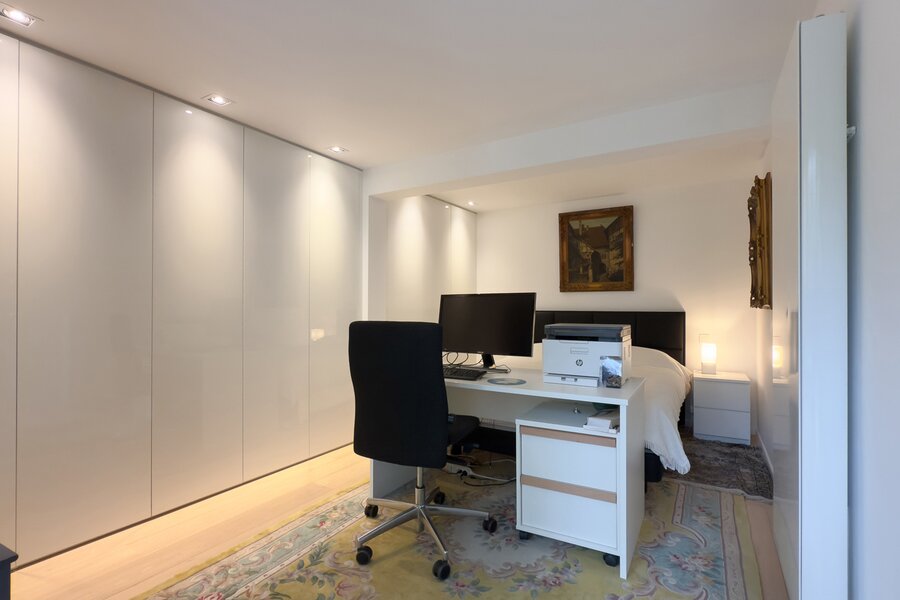 L’appartement comprend deux chambres, dont une suite parentale généreuse avec placards intégrés et accès direct à la terrasse arrière. La deuxième chambre est confortable et fonctionnelle. Deux salles de bains élégantes complètent l’ensemble : une avec baignoire et une avec douche.
