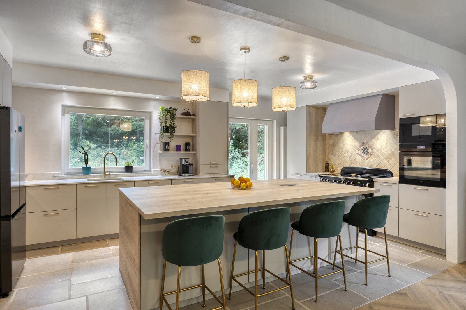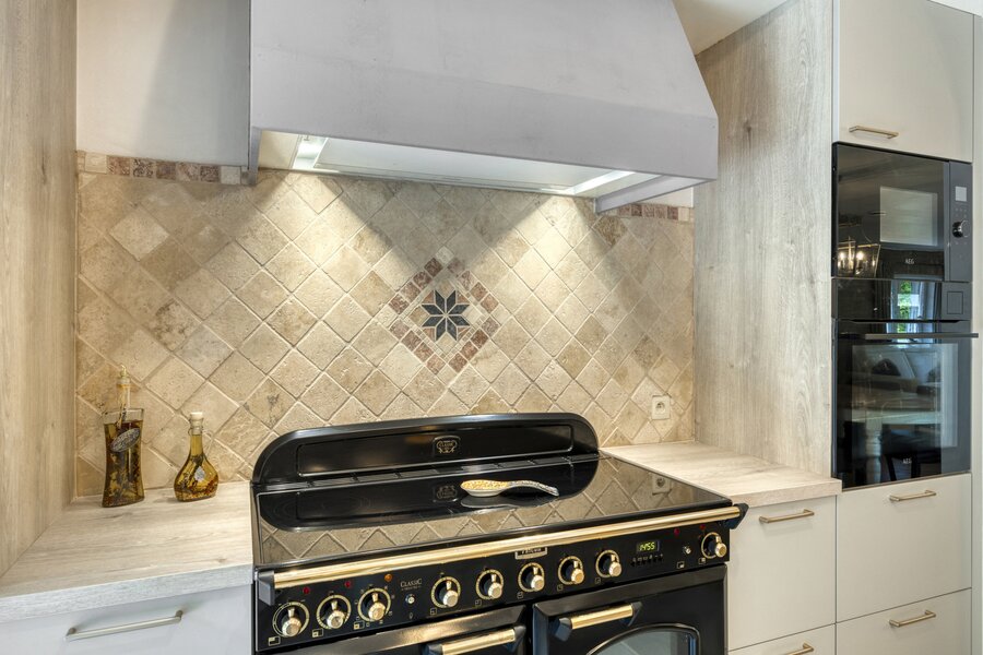 Cuisine ouverte haut de gamme avec cuisinière Falcon (2 fours, plaque à induction, grill, chauffe-assiettes), double réfrigérateur et four combiné vapeur