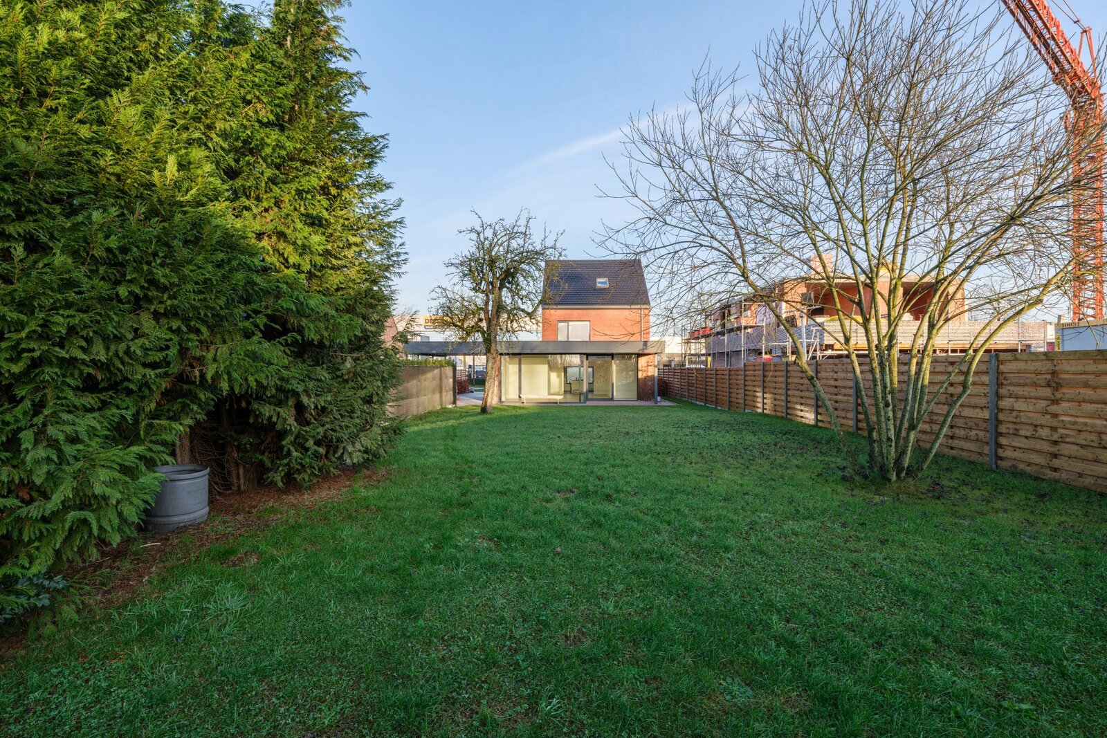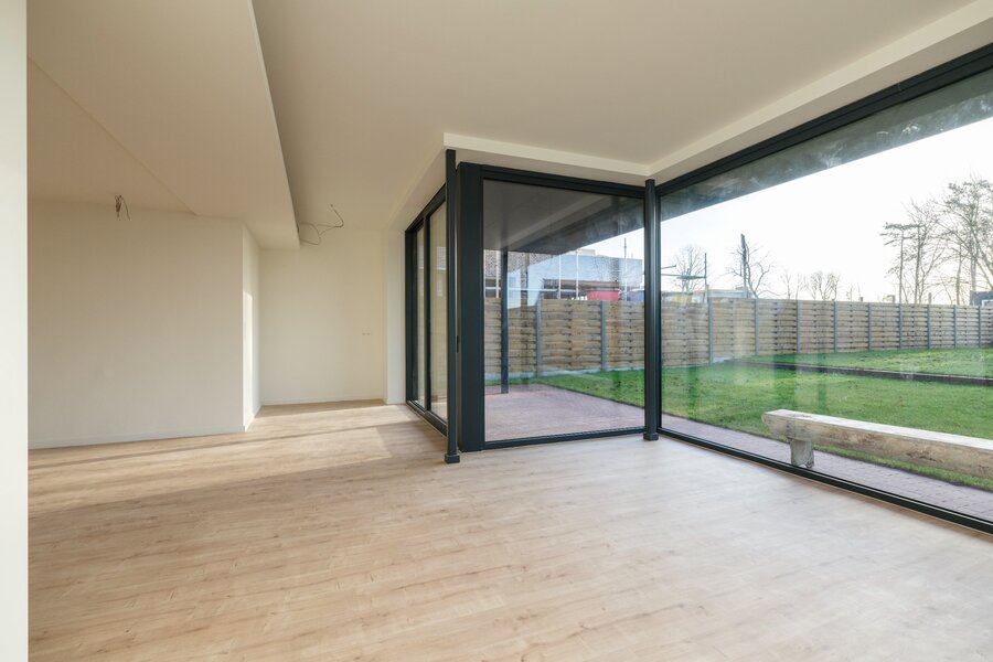 De tuin is georiënteerd naar het zuiden en ingericht met een overdekt terras. Vooraan het pand is een carport aanwezig die plaats verleent aan een wagen. Voorzieningen voor een laadpaal zijn reeds aanwezig.