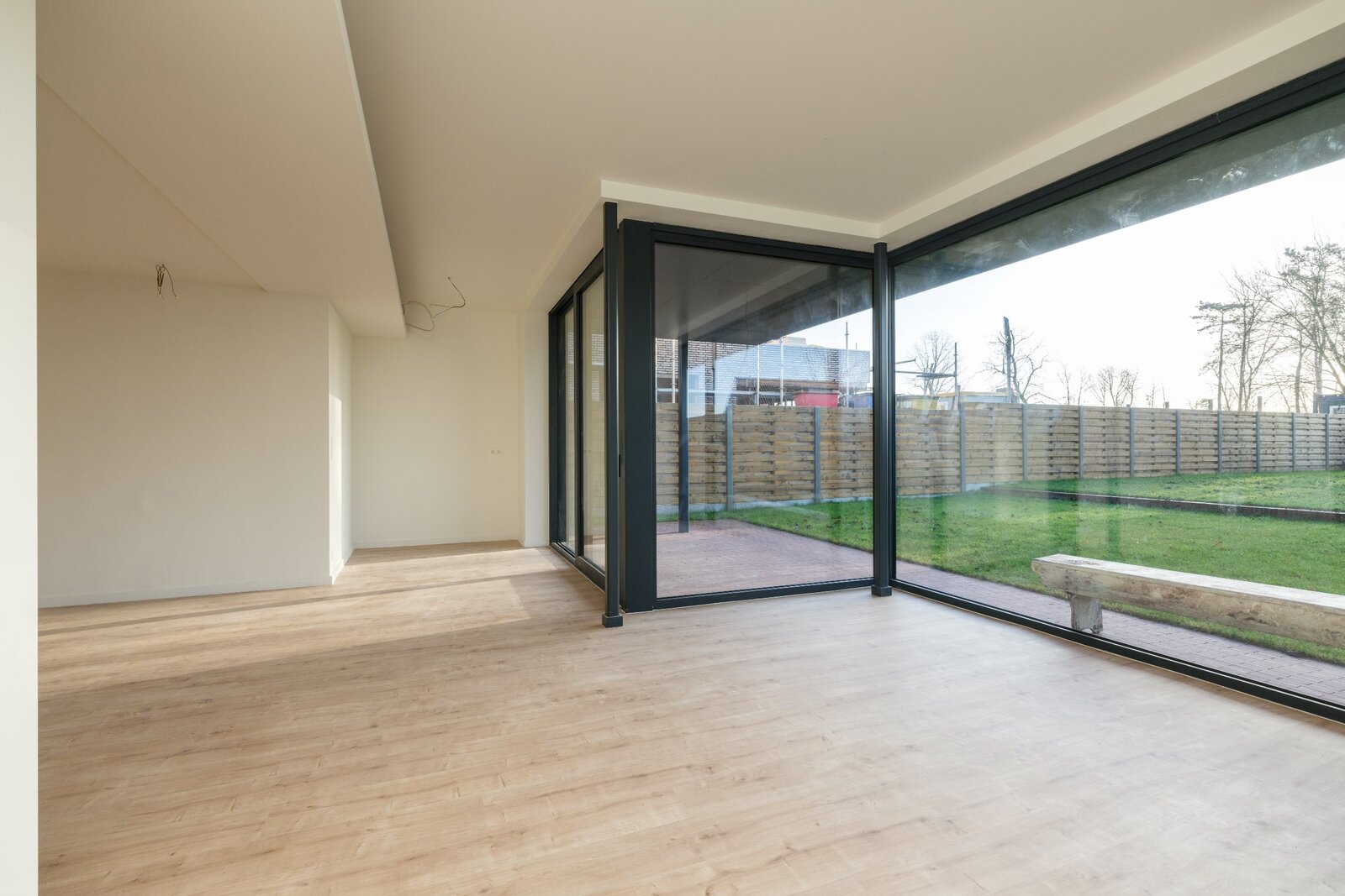 Via de inkomhal met gastentoilet, betreed men de woonkamer, dewelke dankzij grote glaspartijen een mooi uitzicht heeft op de tuin en zorgt voor mooi daglicht in de leefruimtes.