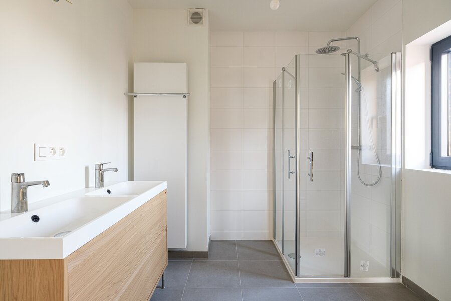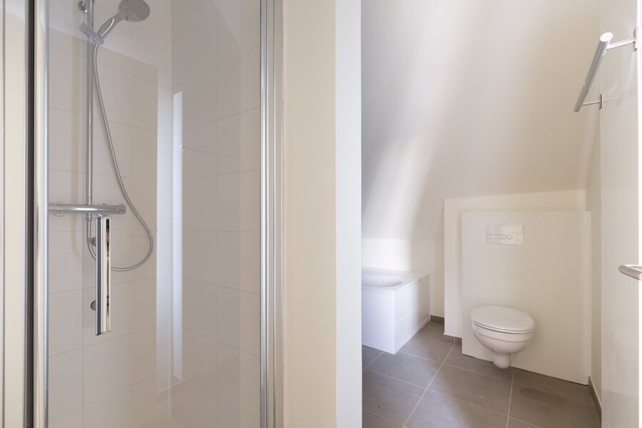 Op deze verdieping situeert zich de 3de slaapkamer en de 2de badkamer met een douche, een dubbel wasmeubel, een ligbad en een toilet. De technische ruimte grenst aan de badkamer.