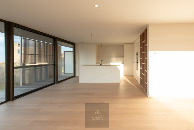 Dans un emplacement extrêmement exceptionnel et privilégié, au bout de l'avenue Huldelaan et à l'angle de l'avenue Cottagelaan à Oostduinkerke, se trouve cet appartement neuf exclusif qui allie calme, intimité et vue imprenable sur la mer et les dunes, à quelques pas des centres d'Oostduinkerke et de Nieuwpoort-Bad. L'appartement dispose d'une surface habitable nette de 138,27 m² et est complété par de spacieuses terrasses à l'avant et à l'arrière d'une superficie totale de 38,26 m². Depuis le grand salon spacieux et lumineux, vous pouvez profiter d'une vue panoramique magnifique et exclusive sur la mer et les dunes.
