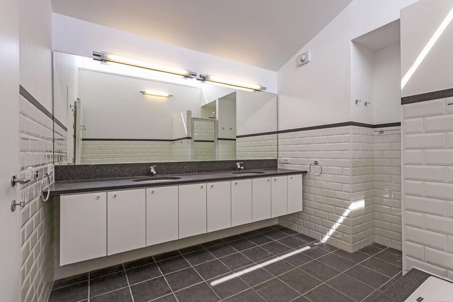 Een eerste master-slaapkamer met dressingruimte, aangrenzend een zeer ruime badkamer met ligbad, douche en dubbele wastafel, geeft via een dubbel openslaande deur uit op het terras. Een tweede ruime slaapkamer heeft ensuite een eigen badkamer.