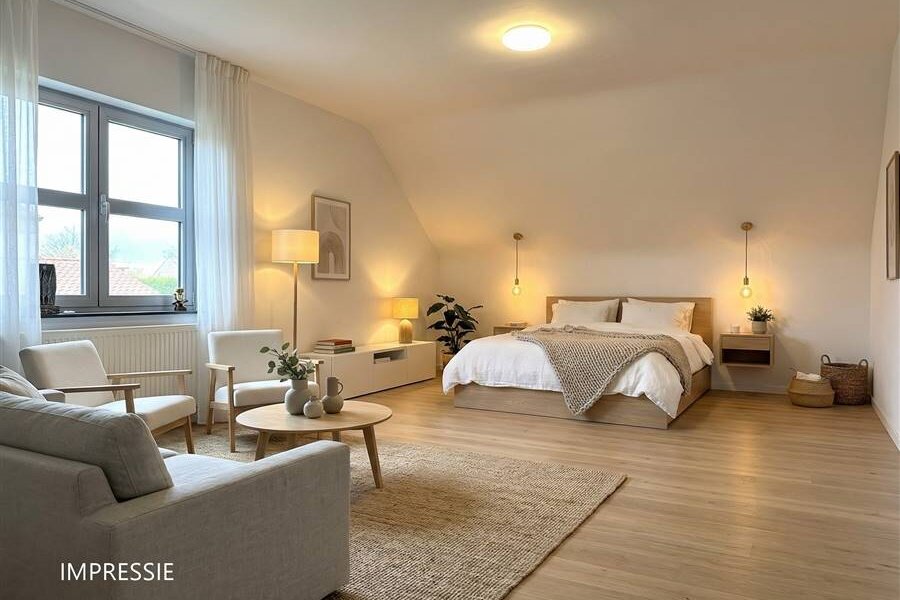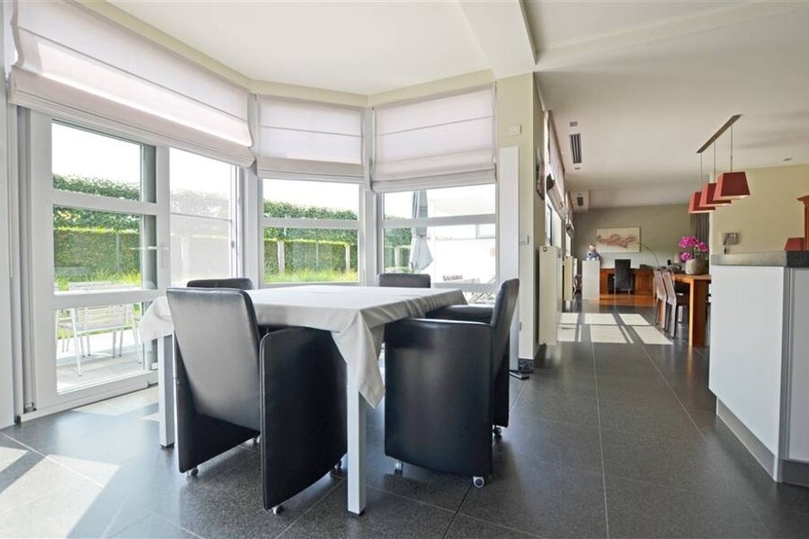 De indeling is als volgt: een ruime inkomhal met gastentoilet die leidt naar de leefruimte. Deze is een open aaneenschakeling van een knusse zithoek, ruime eetplaats en een leefkeuken met eethoek. Door de grote raampartijen geniet deze leefruimte optimaal van natuurlijk daglicht.