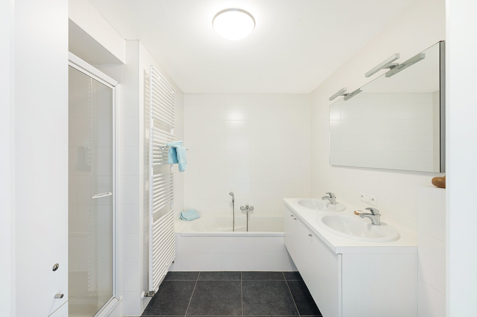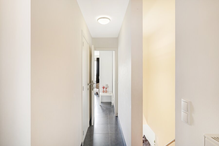Op de verdieping: 3 ruime slaapkamers, waarvan 1 met toegang tot het ruime zuidgerichte terras, een badkamer met ligbad, douche en dubbele wastafel, en nog een aparte douchekamer.