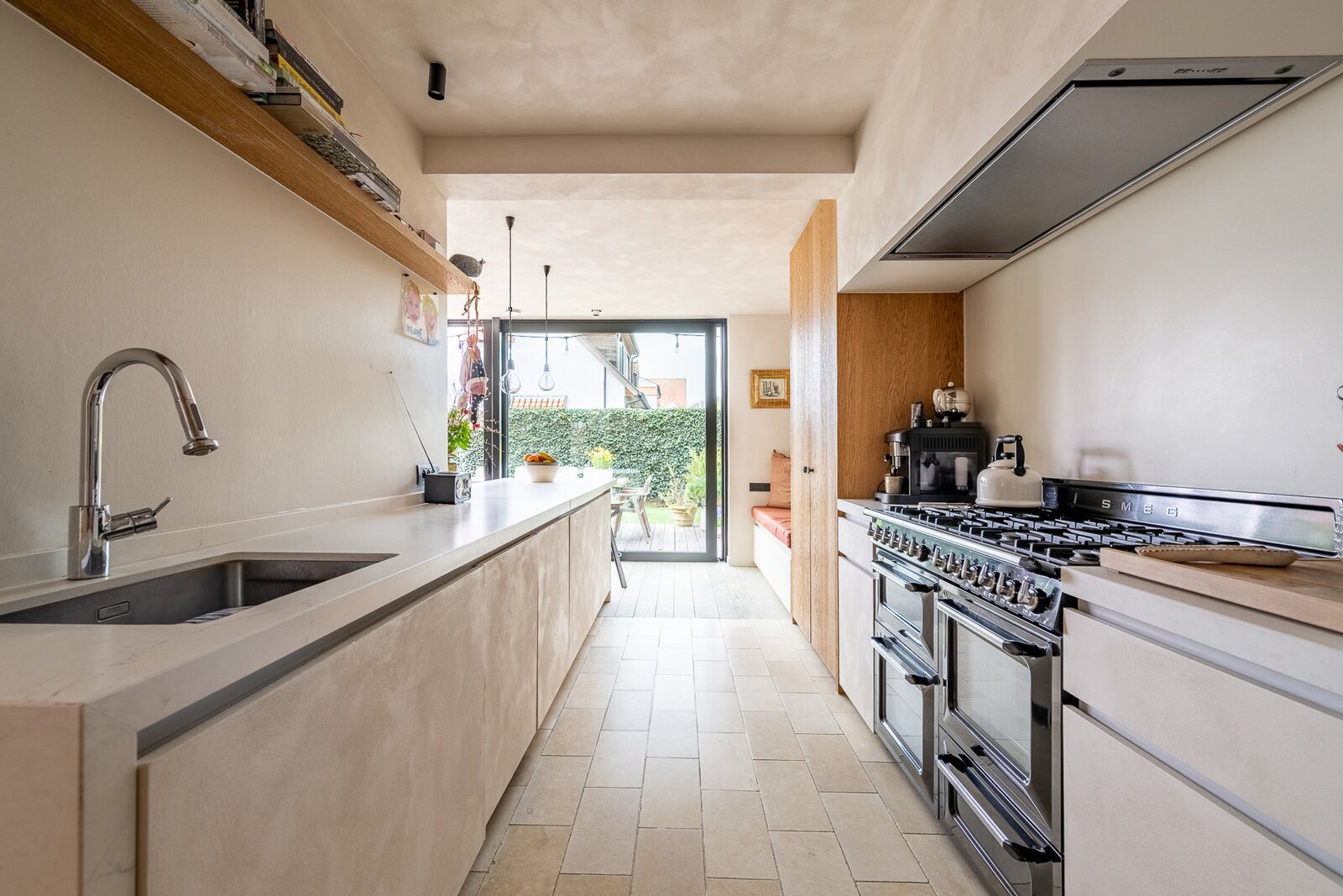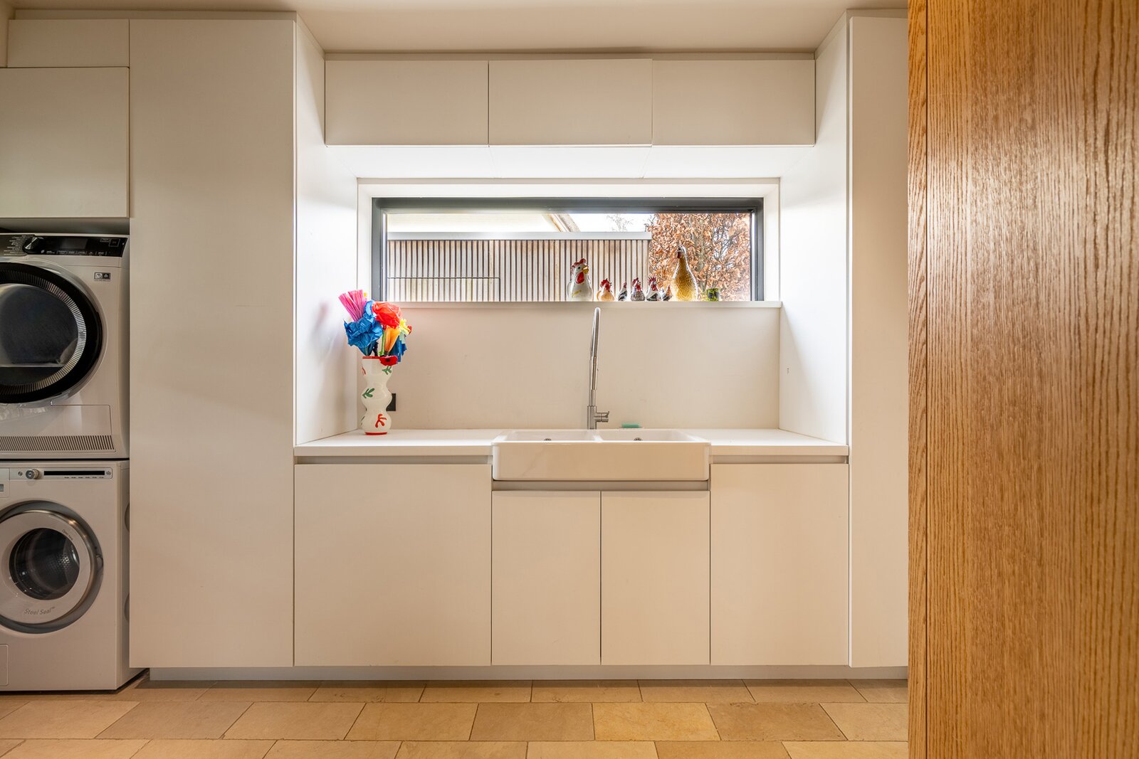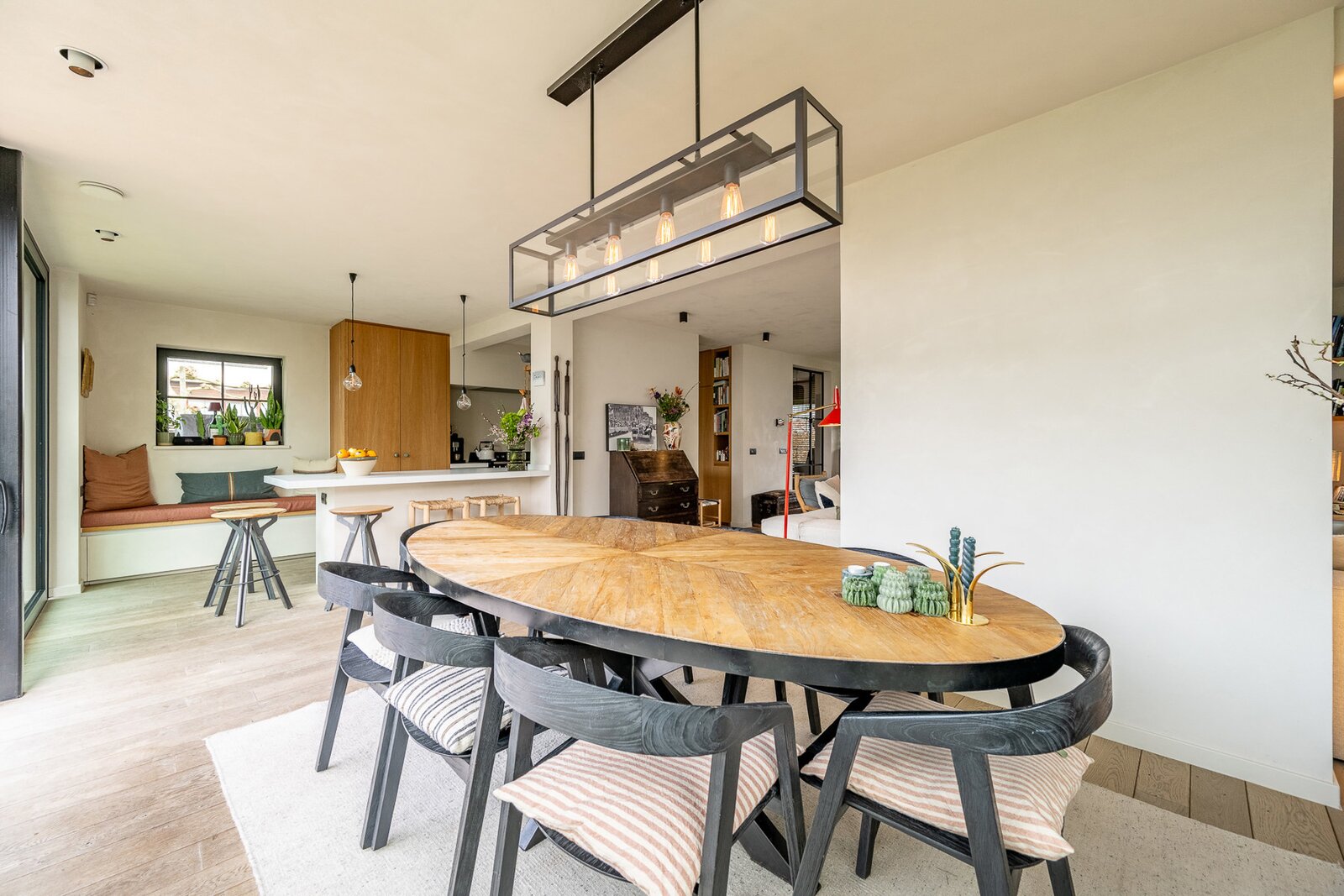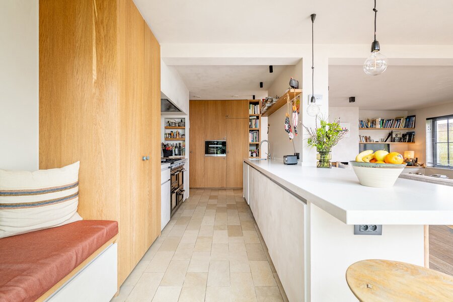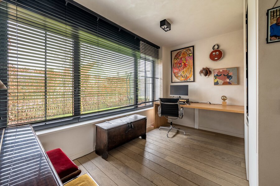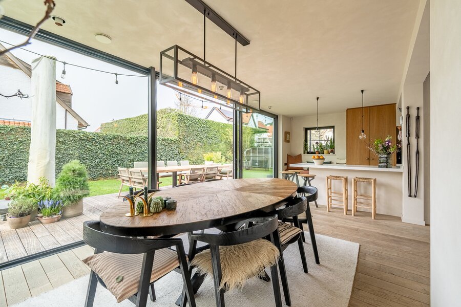 Dans le prolongement se trouve une spacieuse cuisine directement reliée à la salle à manger, qui s’ouvre sur une agréable terrasse orientée ouest, permettant de profiter pleinement du soleil de l’après-midi et de la soirée. Le rez-de-chaussée comprend également un bureau pratique, idéal pour le télétravail.