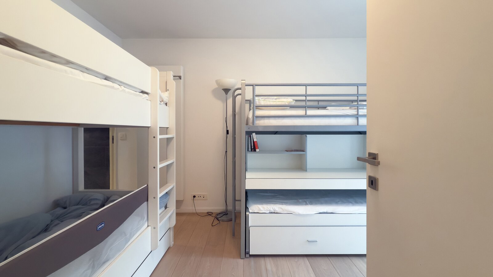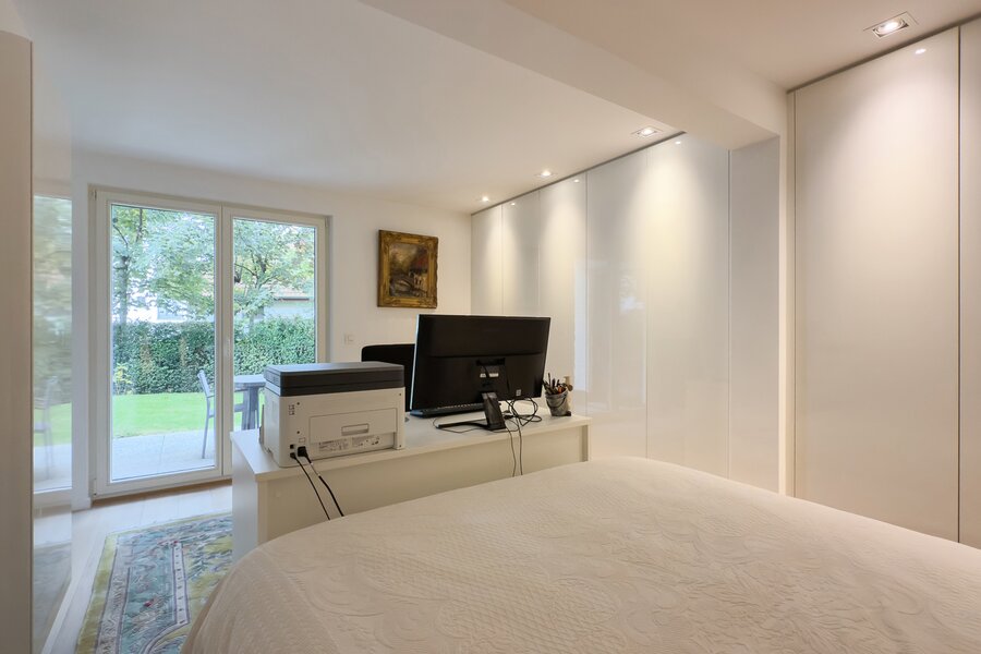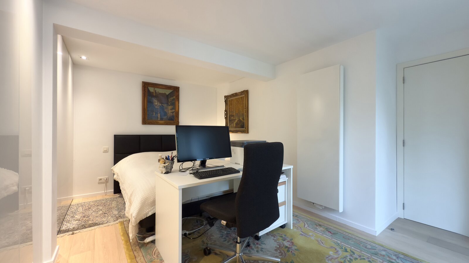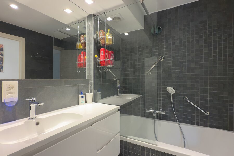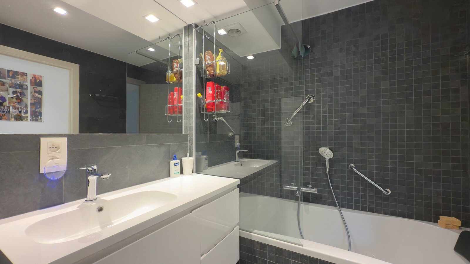 L’appartement comprend deux chambres, dont une suite parentale généreuse avec placards intégrés et accès direct à la terrasse arrière. La deuxième chambre est confortable et fonctionnelle. Deux salles de bains élégantes complètent l’ensemble : une avec baignoire et une avec douche.