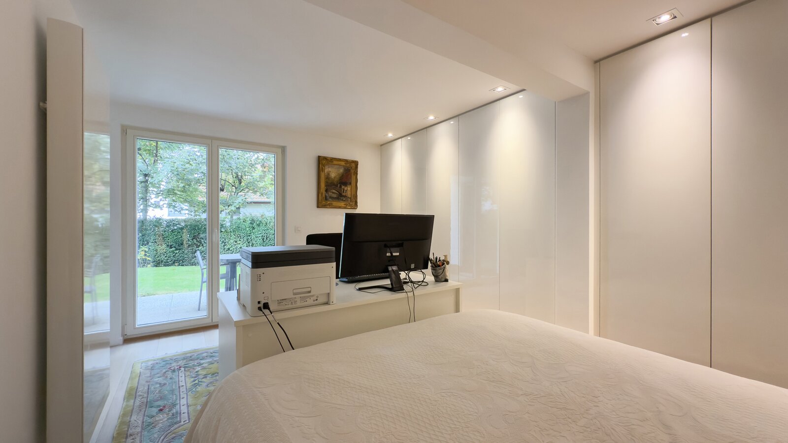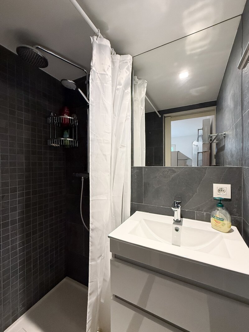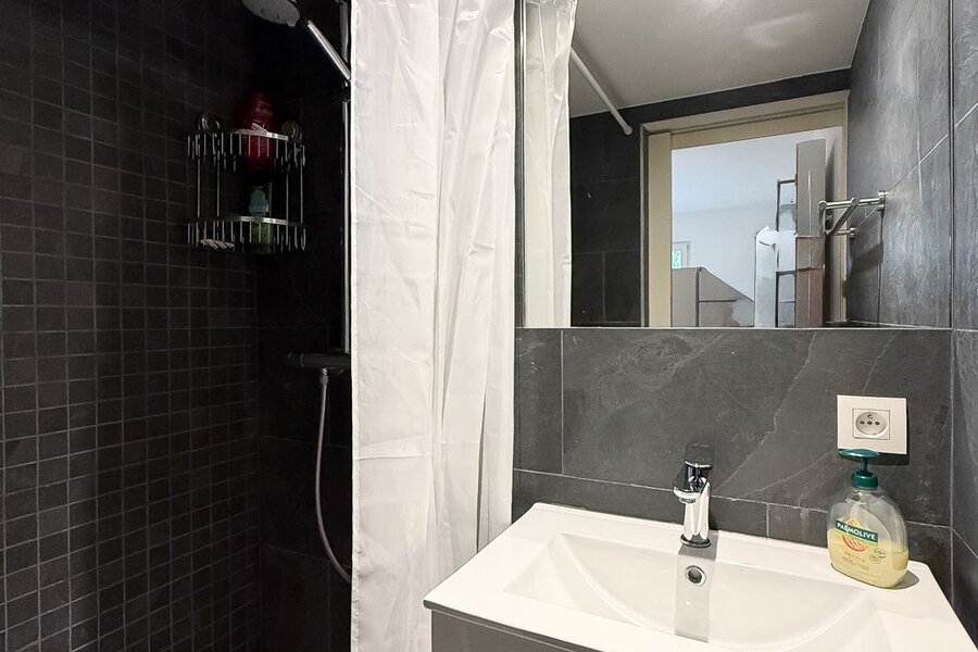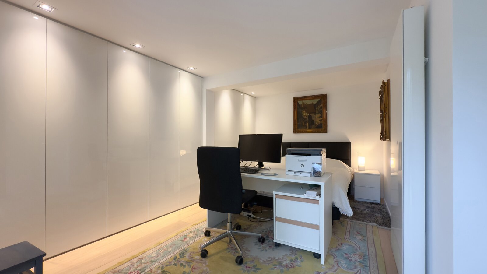 L’appartement comprend deux chambres, dont une suite parentale généreuse avec placards intégrés et accès direct à la terrasse arrière. La deuxième chambre est confortable et fonctionnelle. Deux salles de bains élégantes complètent l’ensemble : une avec baignoire et une avec douche.