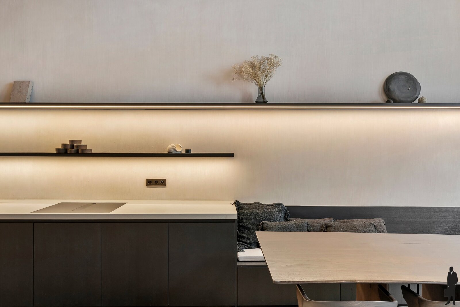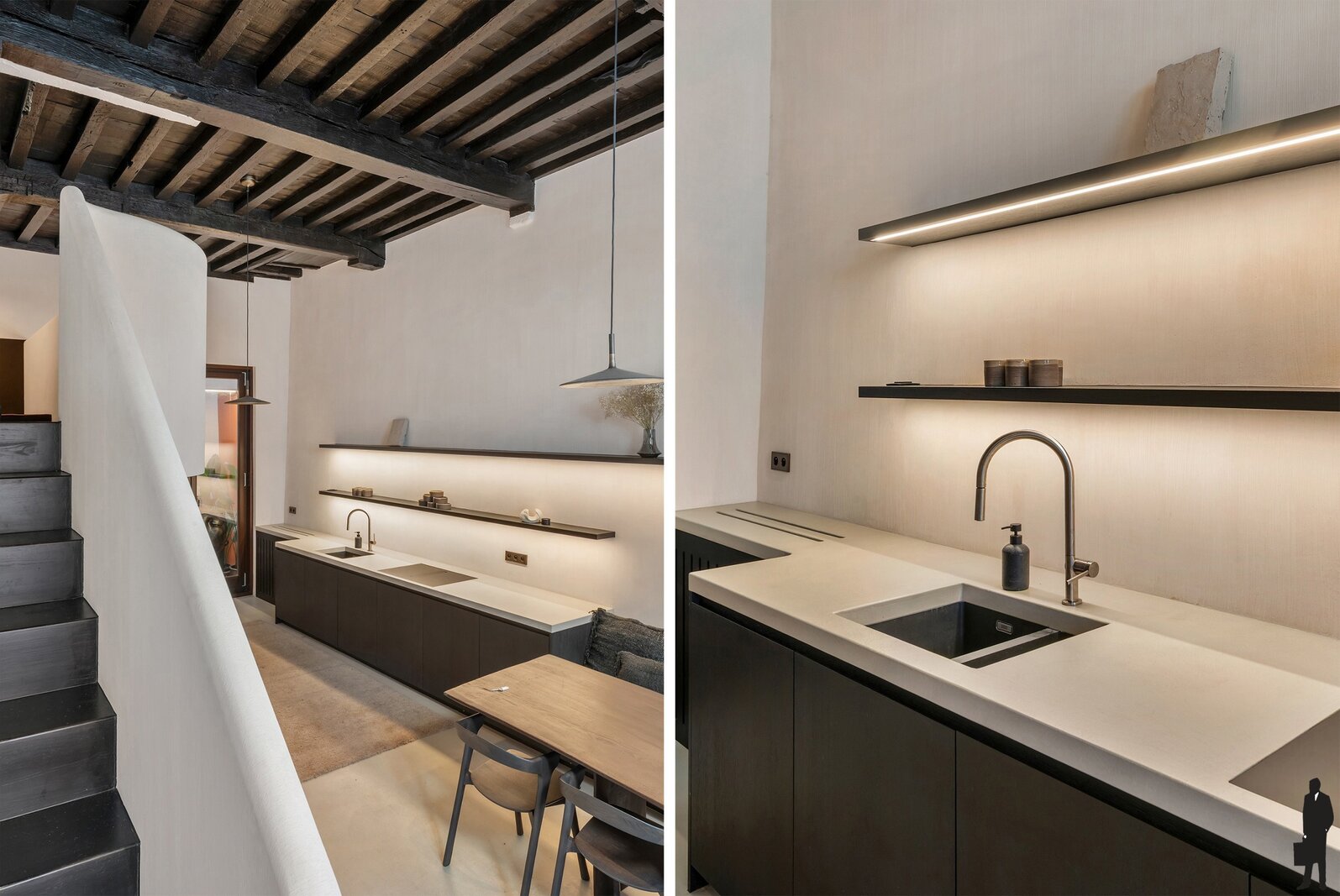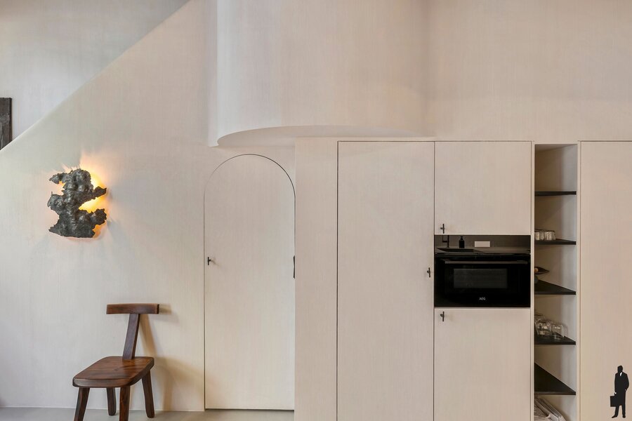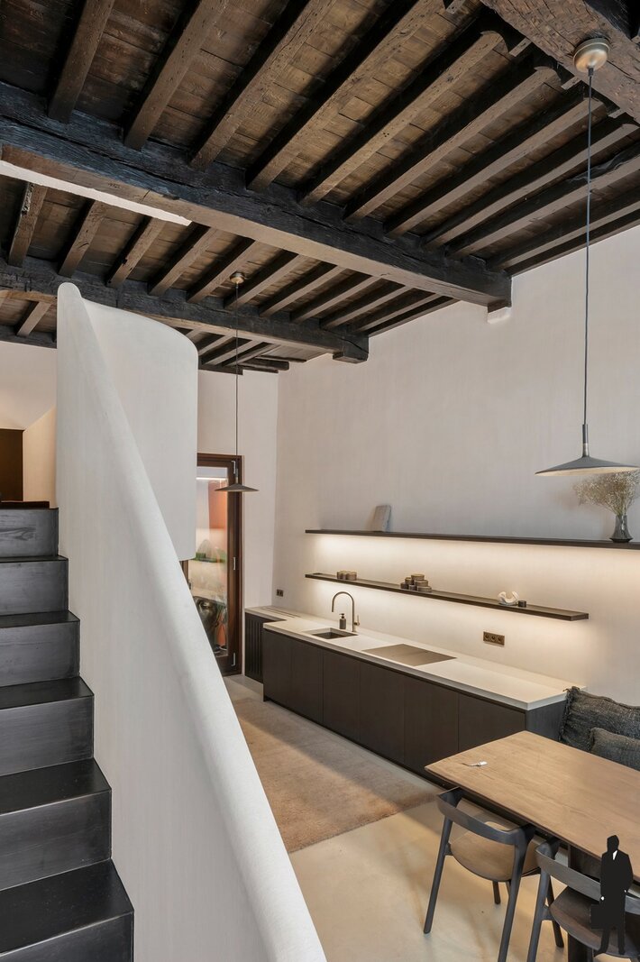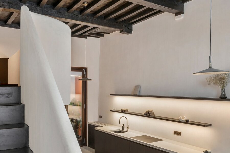 Het gelijkvloers verwelkomt je in een warme leefkeuken en eetruimte, afgewerkt met kalkverf en verrijkt met een combinatie van originele elementen en nieuwe massiefhouten accenten. Op de tussenverdieping werd optimaal gebruikgemaakt van de ruimte door maatwerkkasten die perfect aansluiten bij het statige karakter van het huis. Op de eerste verdieping wacht een elegant salon, rijk aan sfeer en licht.