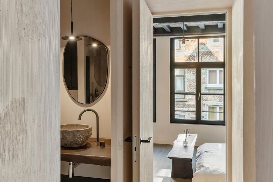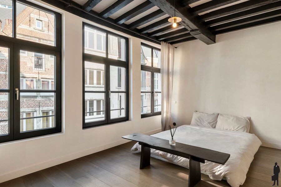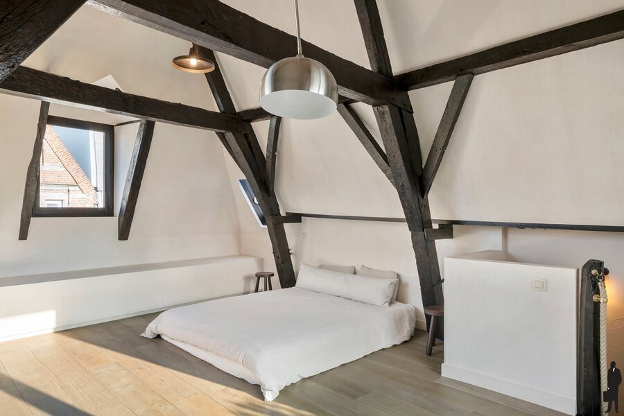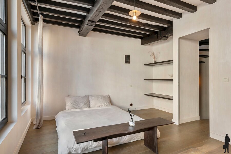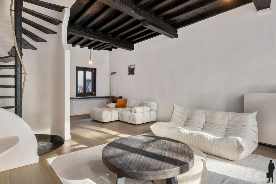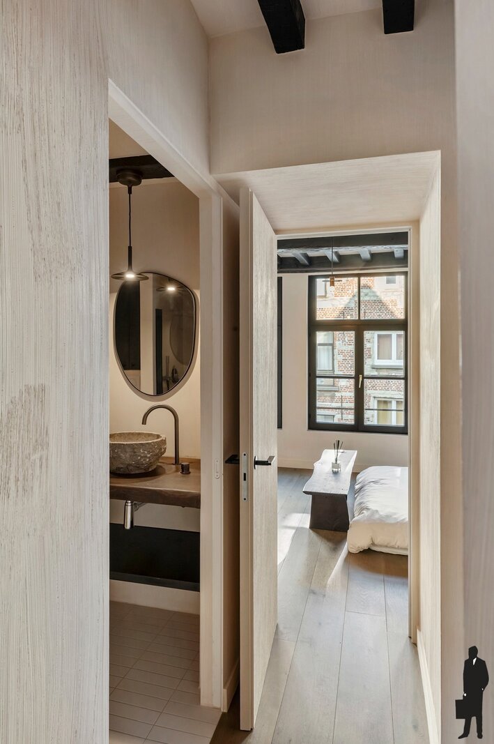 De tweede verdieping biedt een royale master bedroom, een stijlvol ontworpen badkamer en een ruime dressing, volledig ingericht met maatkasten. Onder het dak vind je nog een intieme slaapkamer met aansluitend een zonnig dakterras en een open haard, een uitzonderlijke en gezellige luxe midden in de stad.