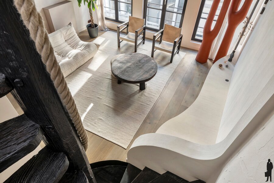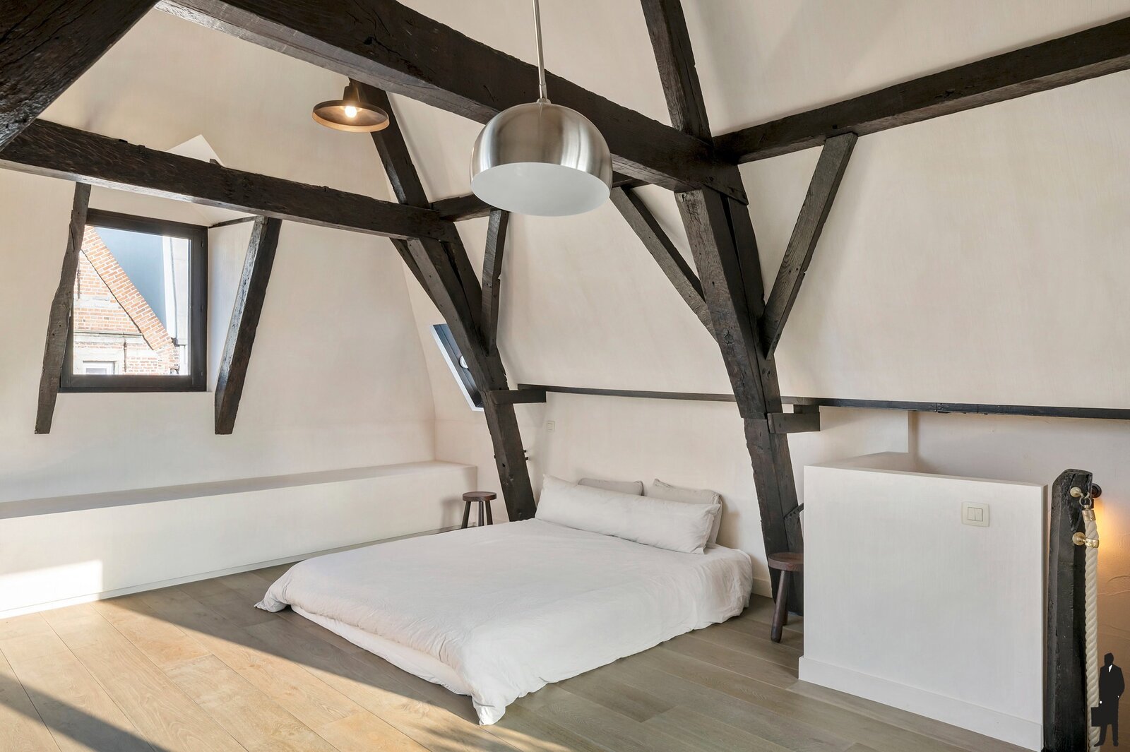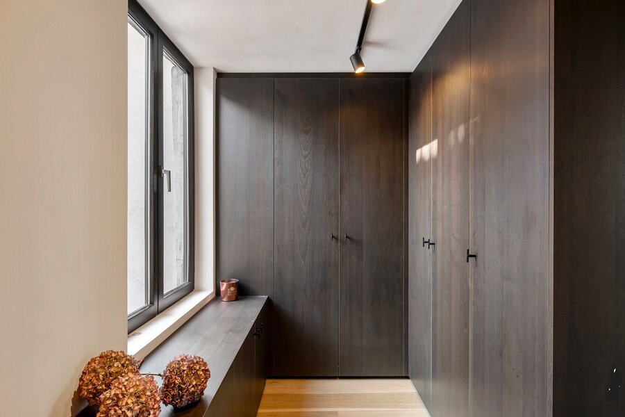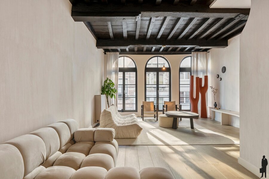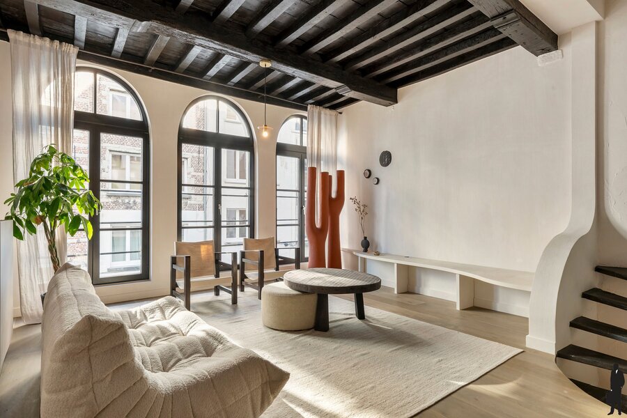 De tweede verdieping biedt een royale master bedroom, een stijlvol ontworpen badkamer en een ruime dressing, volledig ingericht met maatkasten. Onder het dak vind je nog een intieme slaapkamer met aansluitend een zonnig dakterras en een open haard, een uitzonderlijke en gezellige luxe midden in de stad.