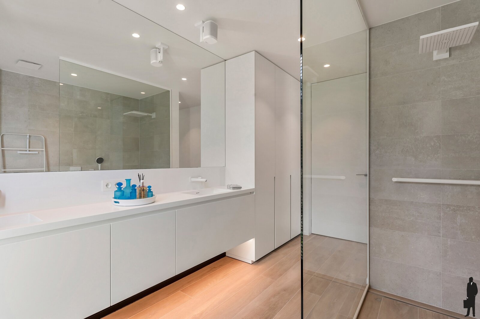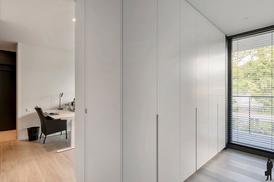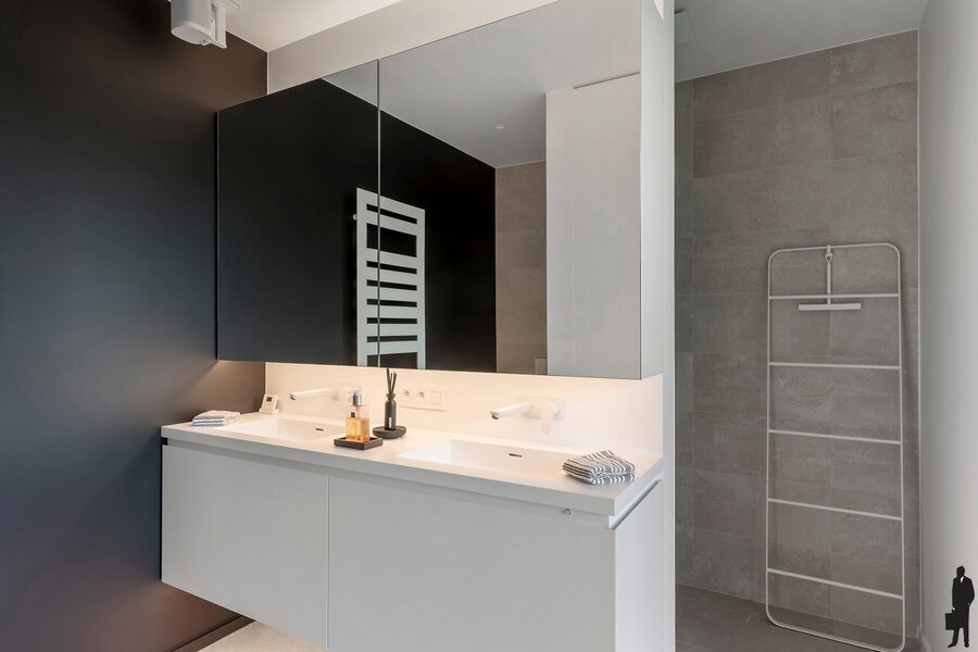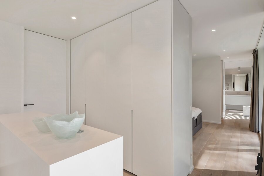 Op het gelijkvloers vind je een dubbele garage met directe toegang tot de centrale inkomhal en lift die rechtstreeks naar het appartement leidt. Voorzien van vloerverwarming en laadcontact voor een elektrische wagen. Ultiem comfort gegarandeerd.