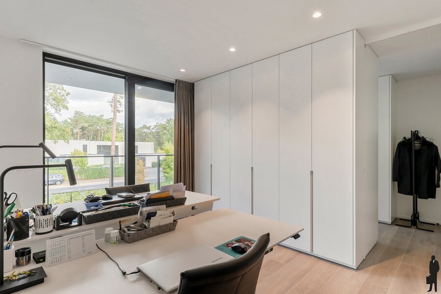 Op het verdiep bevindt zich een ruime leefruimte met grote raampartijen die overvloedig licht binnenlaten en een prachtig uitzicht op het groen bieden. De woonkamer met aparte tv-hoek sluit naadloos aan op de open keuken met kookeiland en eetruimte.