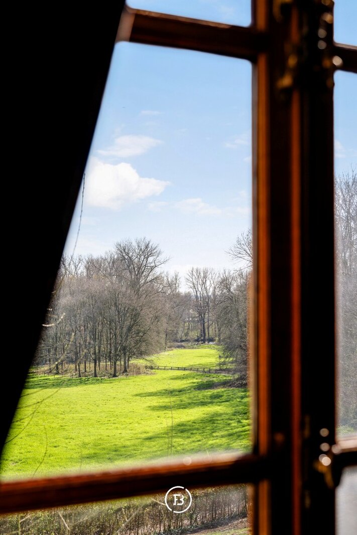 Par une majestueuse allée qui serpente élégamment à travers le domaine, vous accédez au château, posé sur une légère élévation. Cette situation unique offre une vue panoramique à couper le souffle sur le parc environnant, composé de vastes prairies, de forêts anciennes et de deux étangs pittoresques, aménagés dans un style paysager raffiné.
