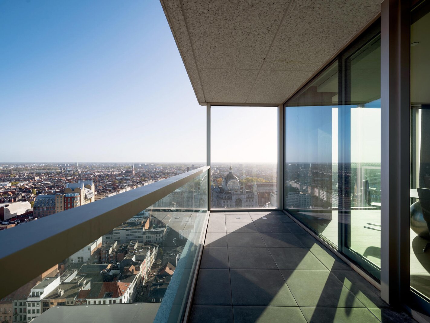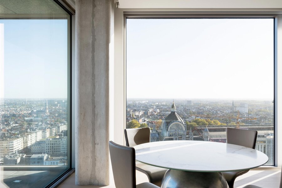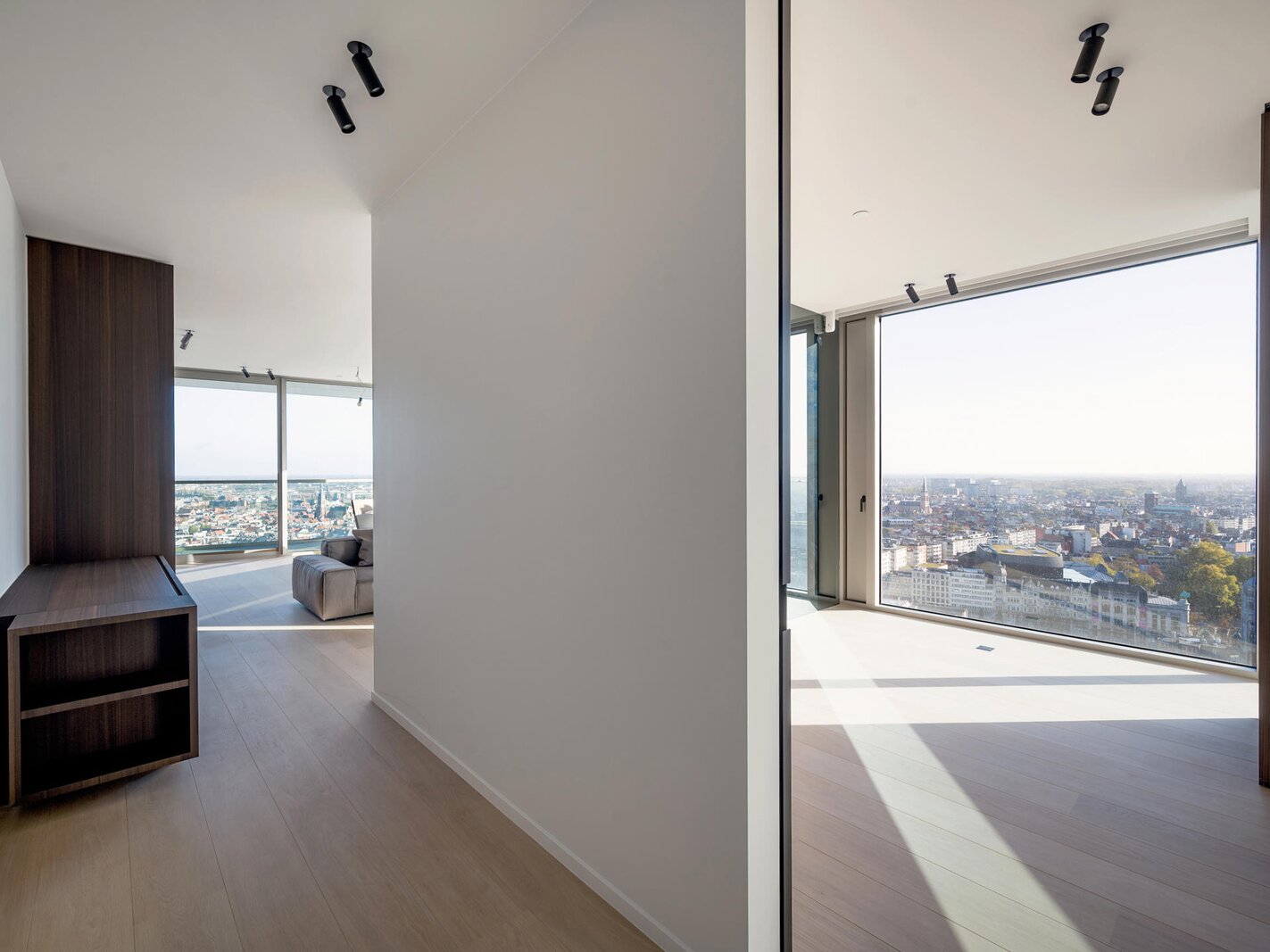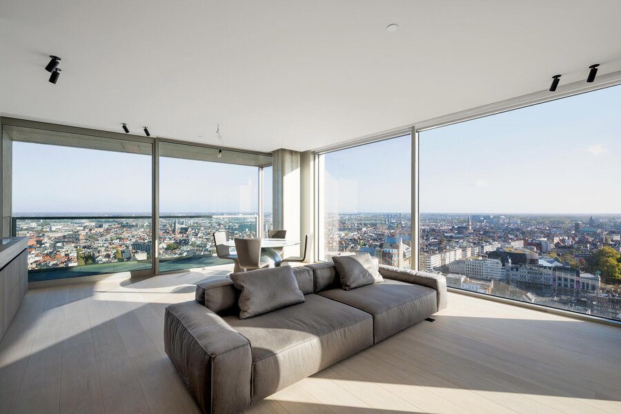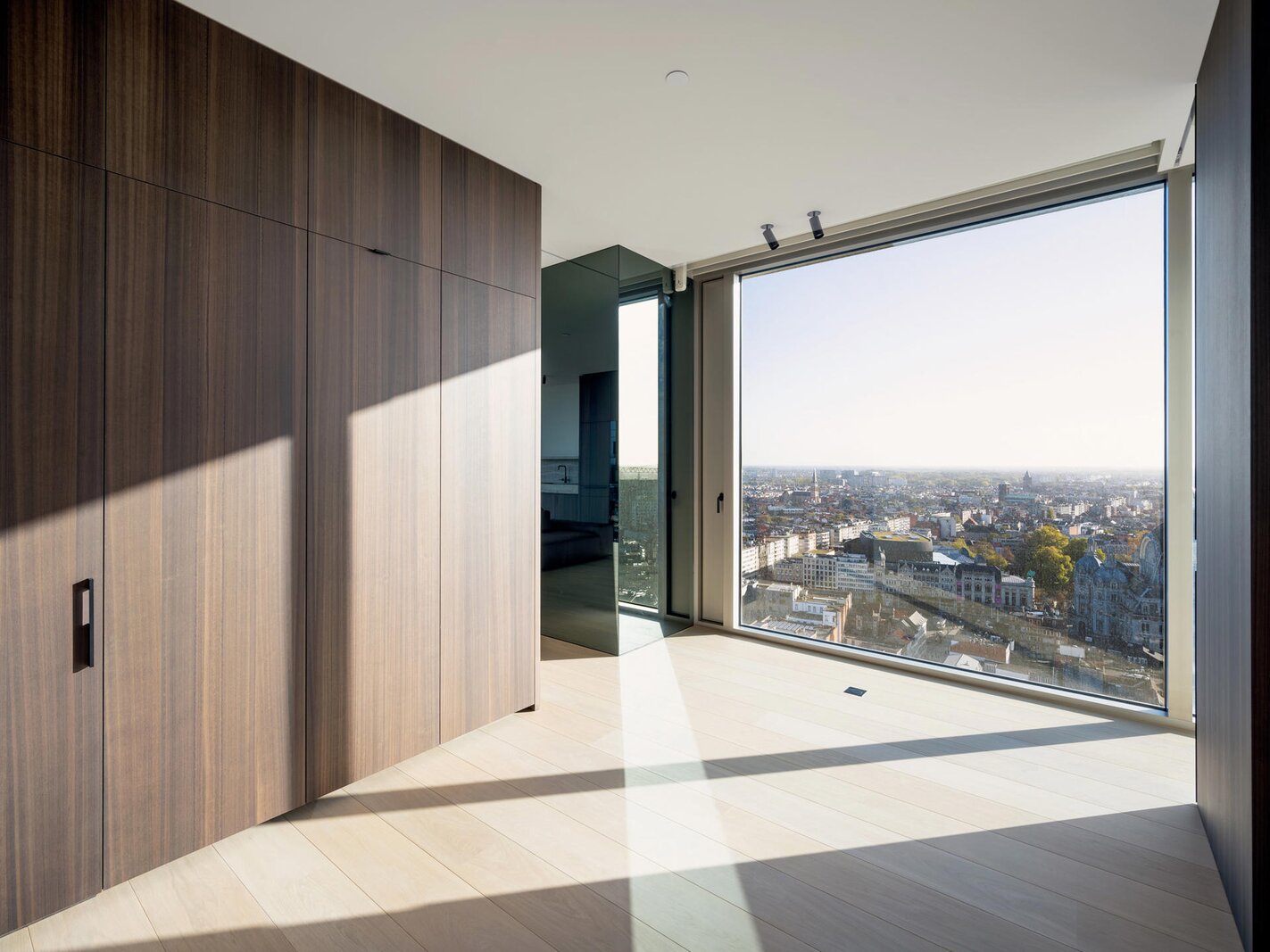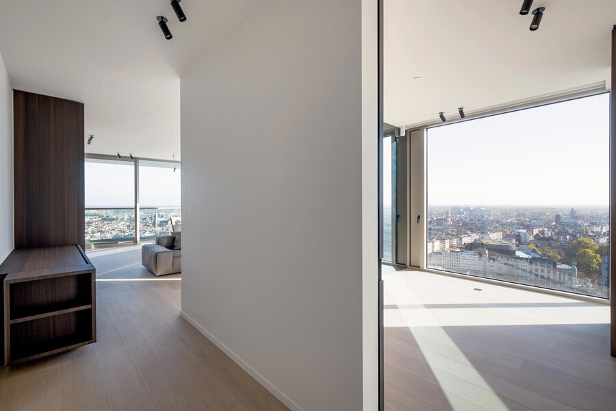 Appartement Serenity situé dans l’emblématique Antwerp Tower, au 22ᵉ étage, donnant sur la place de l’Opéra. Il offre une superficie habitable d’environ 110 m² ainsi qu’une terrasse d’environ 10 m² avec une vue panoramique sur la skyline d’Anvers.