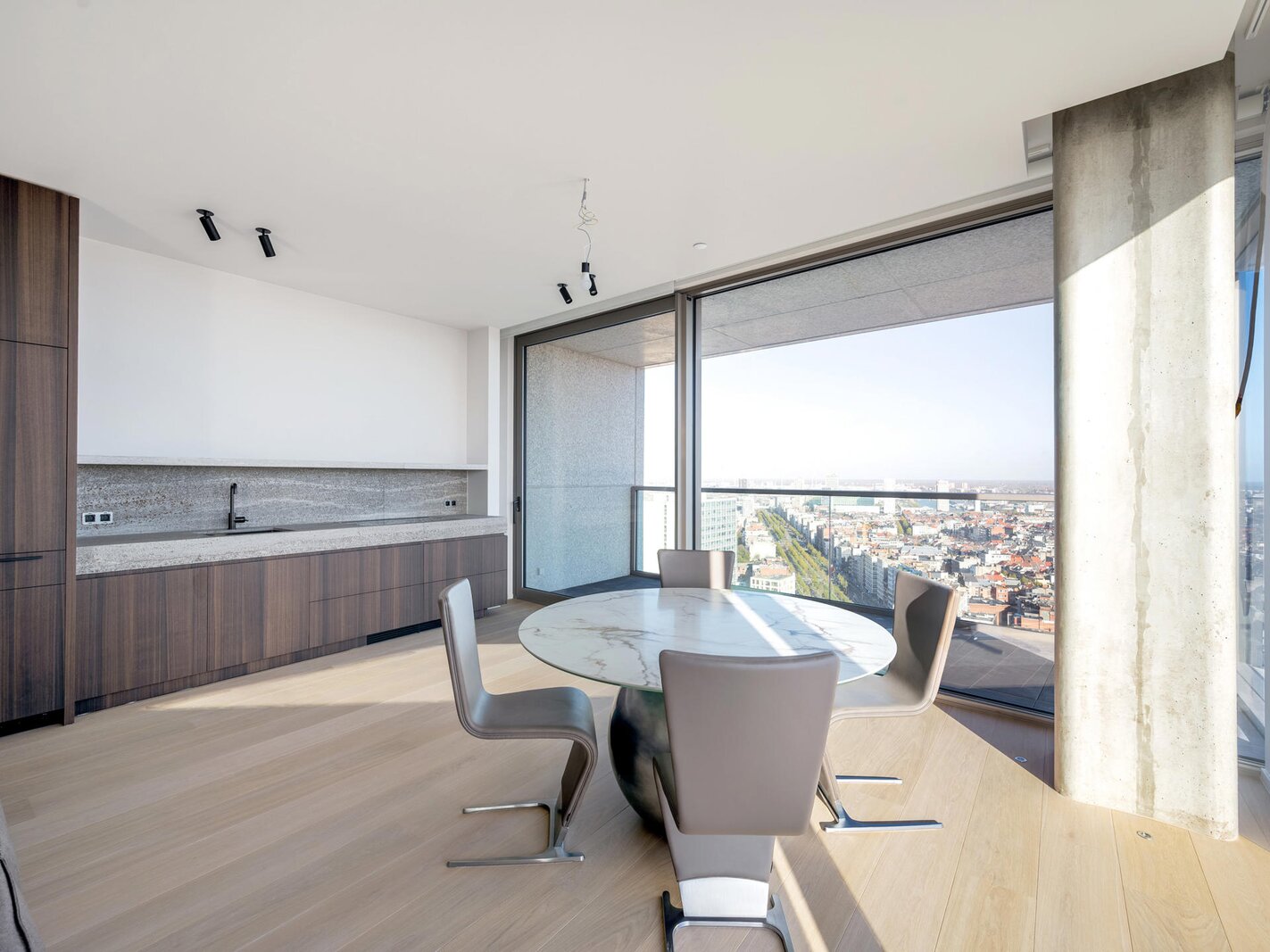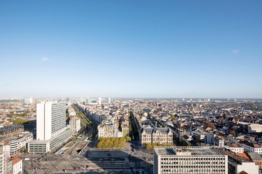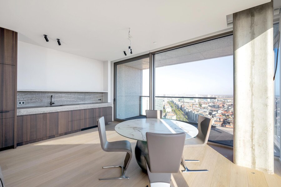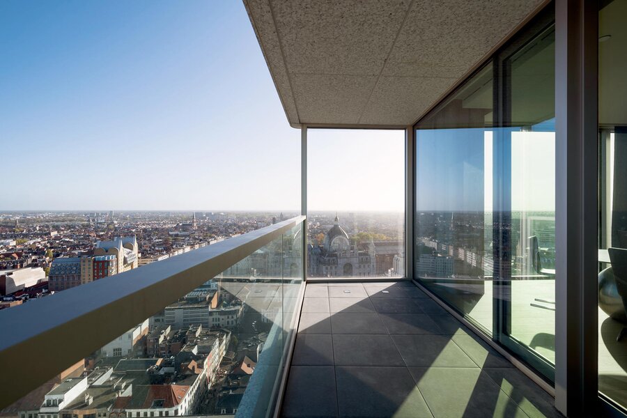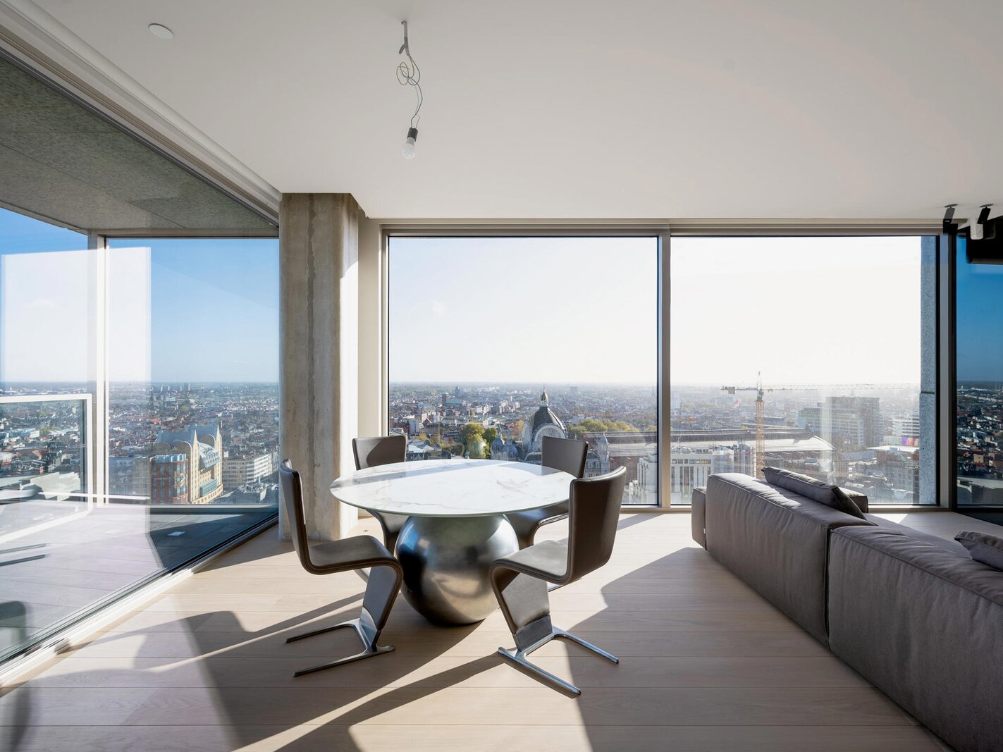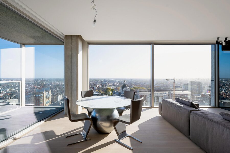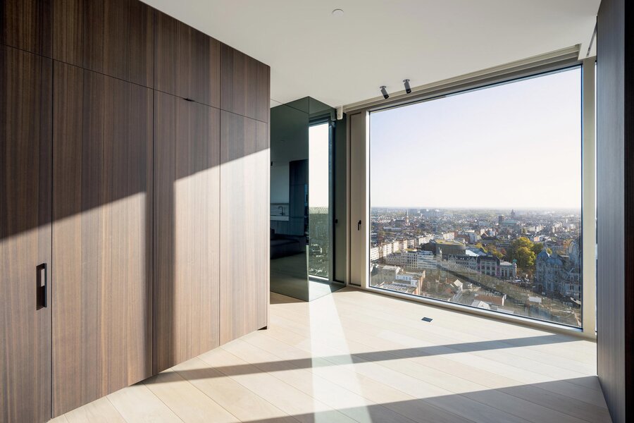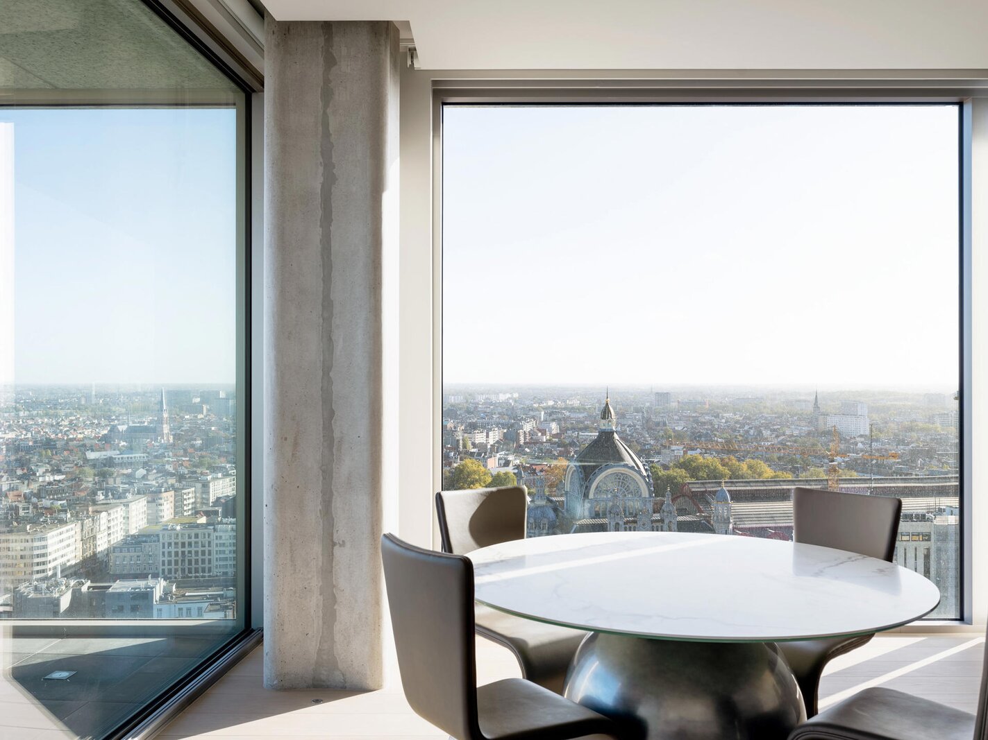 Appartement Serenity situé dans l’emblématique Antwerp Tower, au 22ᵉ étage, donnant sur la place de l’Opéra. Il offre une superficie habitable d’environ 110 m² ainsi qu’une terrasse d’environ 10 m² avec une vue panoramique sur la skyline d’Anvers.