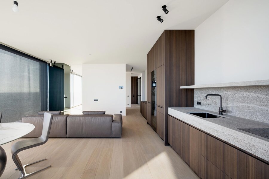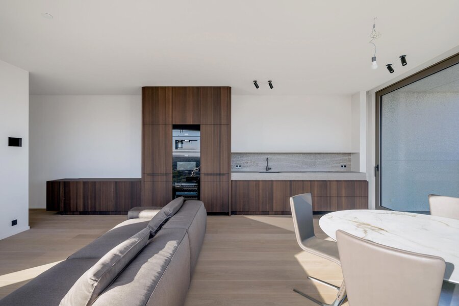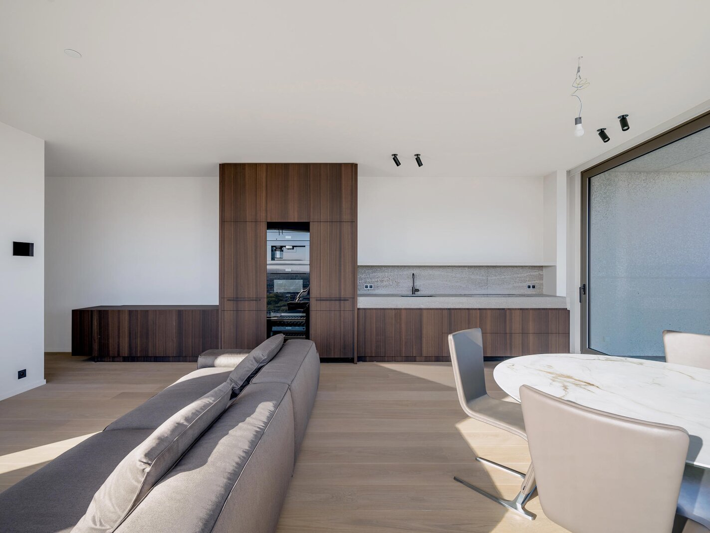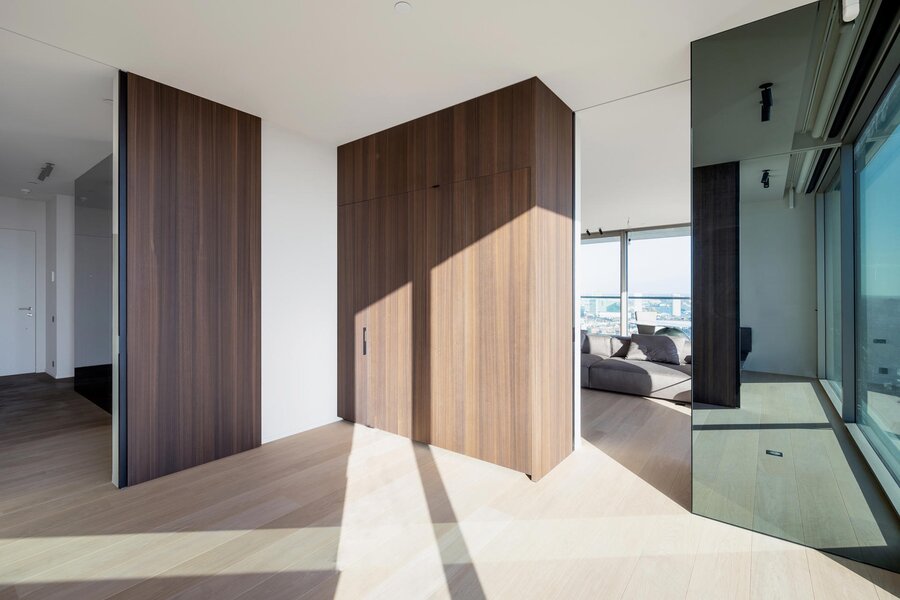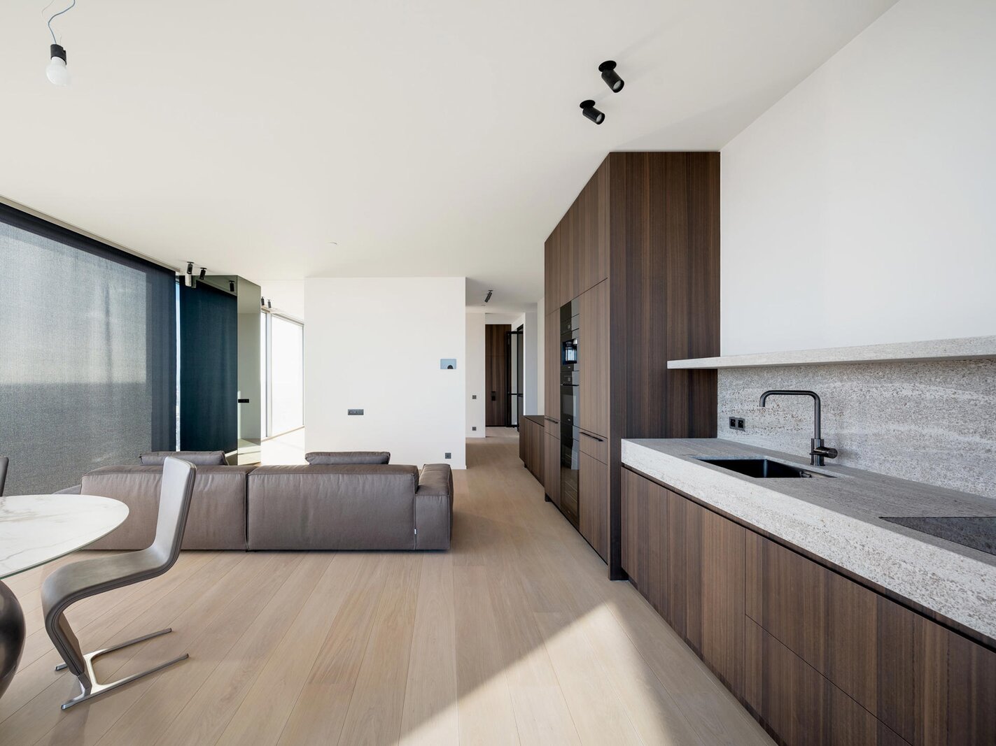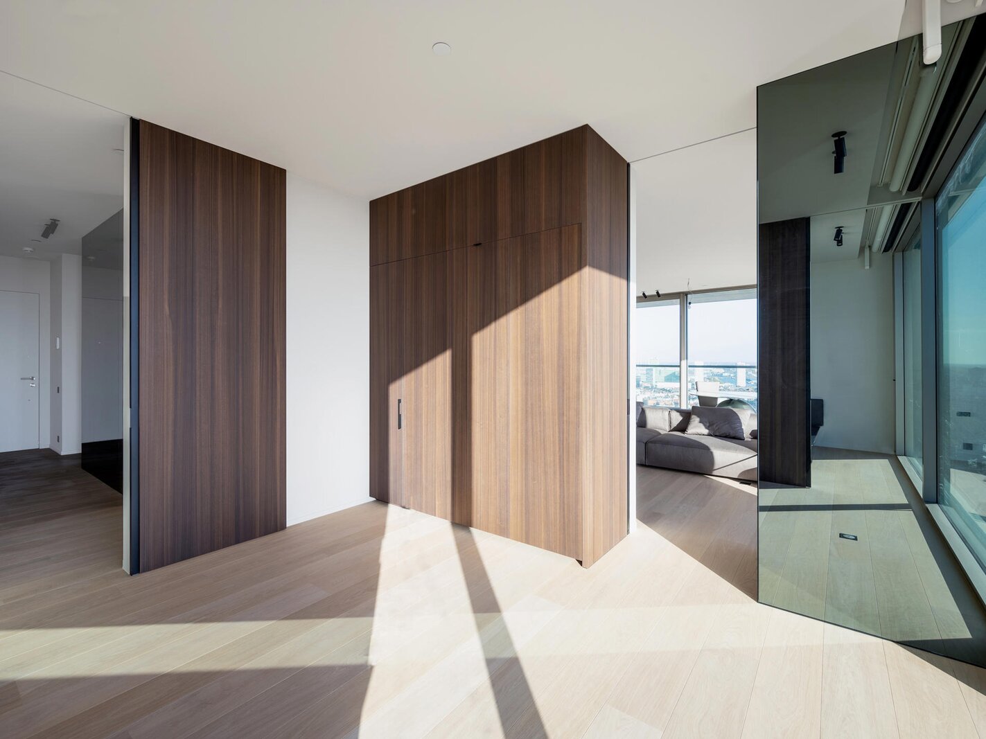 Appartement Serenity situé dans l’emblématique Antwerp Tower, au 22ᵉ étage, donnant sur la place de l’Opéra. Il offre une superficie habitable d’environ 110 m² ainsi qu’une terrasse d’environ 10 m² avec une vue panoramique sur la skyline d’Anvers.
