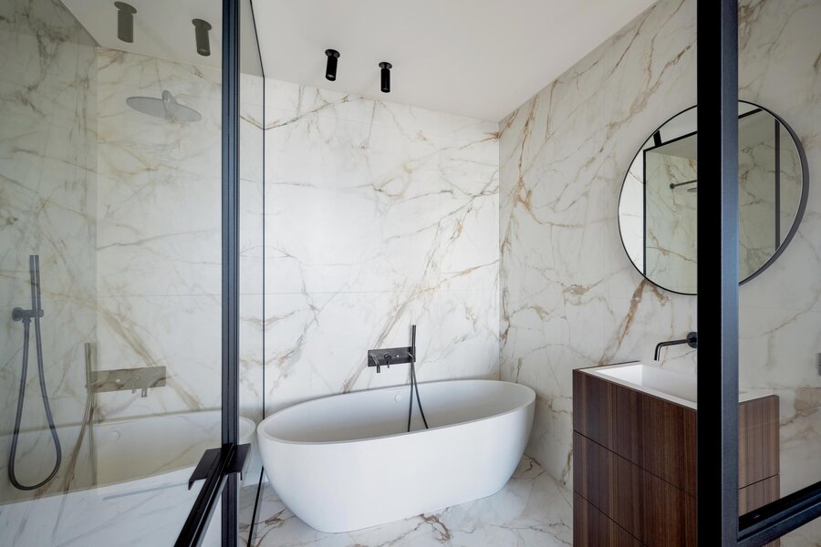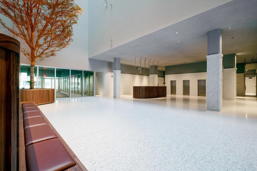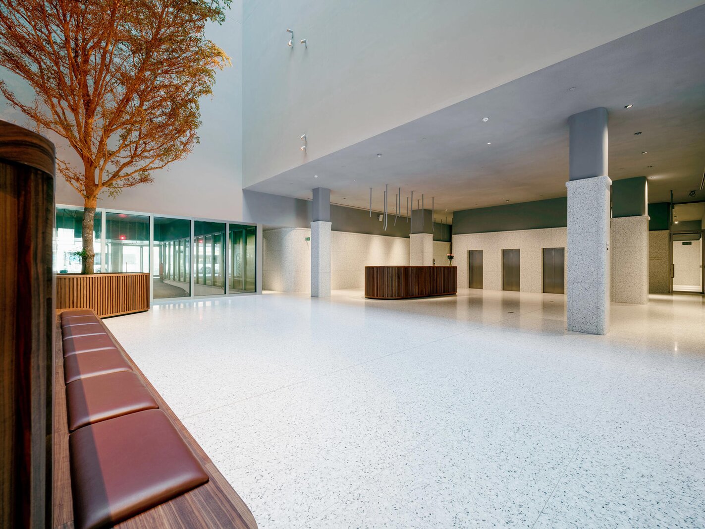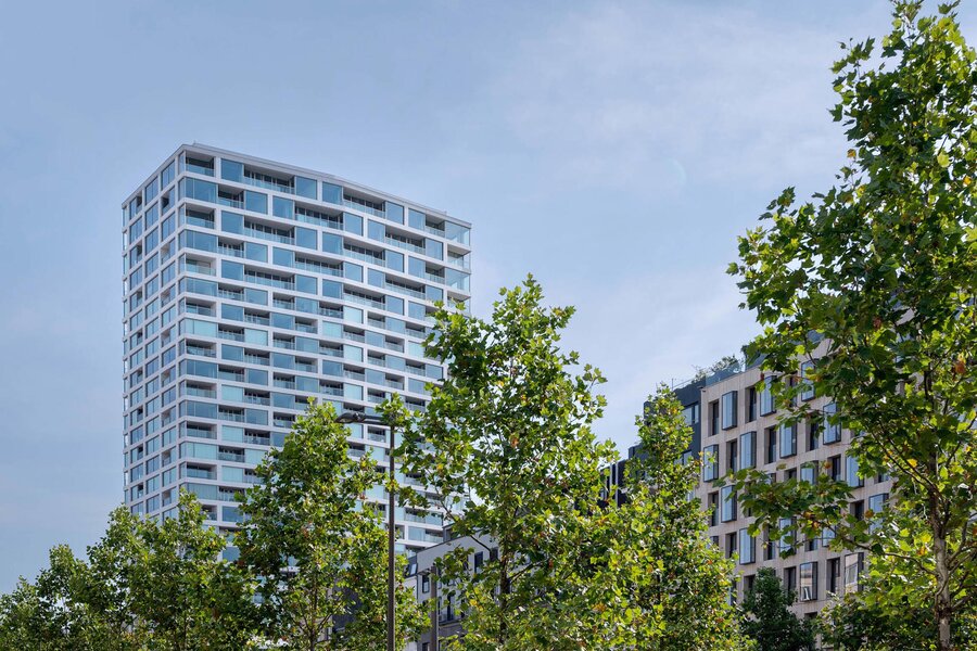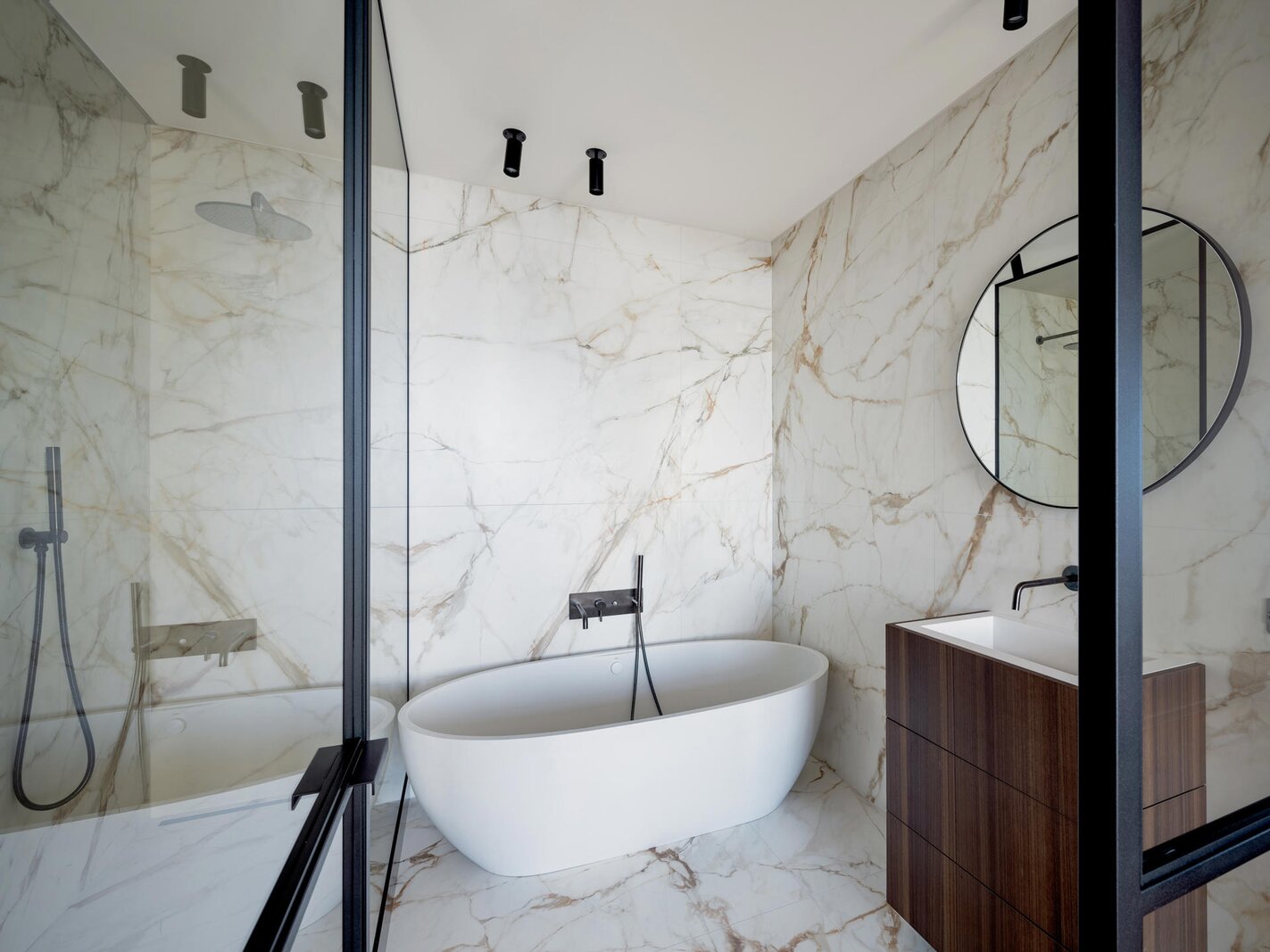 Un hall d’entrée spacieux vous mène vers les ascenseurs privés donnant accès aux Serenity penthouses situés aux étages supérieurs. L’entrée de l’appartement est équipée de placards vestiaires intégrés et d’un WC invités. Le lumineux séjour avec cuisine ouverte entièrement équipée bénéficie d’une vue à 180° sur la ville d’Anvers. L’appartement comprend deux chambres, dont une suite parentale avec salle de bains attenante comprenant une baignoire et une vaste douche à l’italienne. La deuxième chambre peut servir de dressing, bureau ou seconde chambre à coucher ; elle dispose d’une armoire intégrée pouvant se transformer en lit double et donne accès à la salle de douche.
