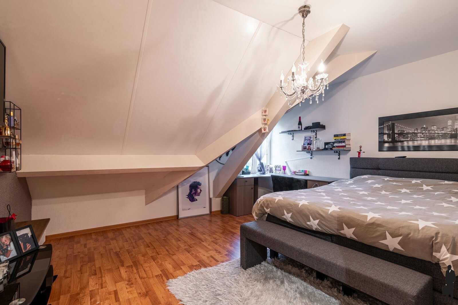 Op het gelijkvloers vindt u tevens een bureau of extra slaapkamer en een praktische voorraad wijnkelder van ca. 20 m² op stahoogte. De volledige benedenverdieping is uitgerust met vloerverwarming (met uitzondering van het bureau).