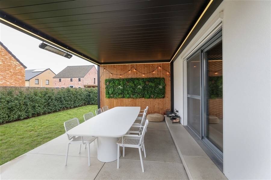 + Sfeervol gedeeltelijk overdekt terras voorzien van verwarming en verlichting - lamellen automatisch te bedienen
