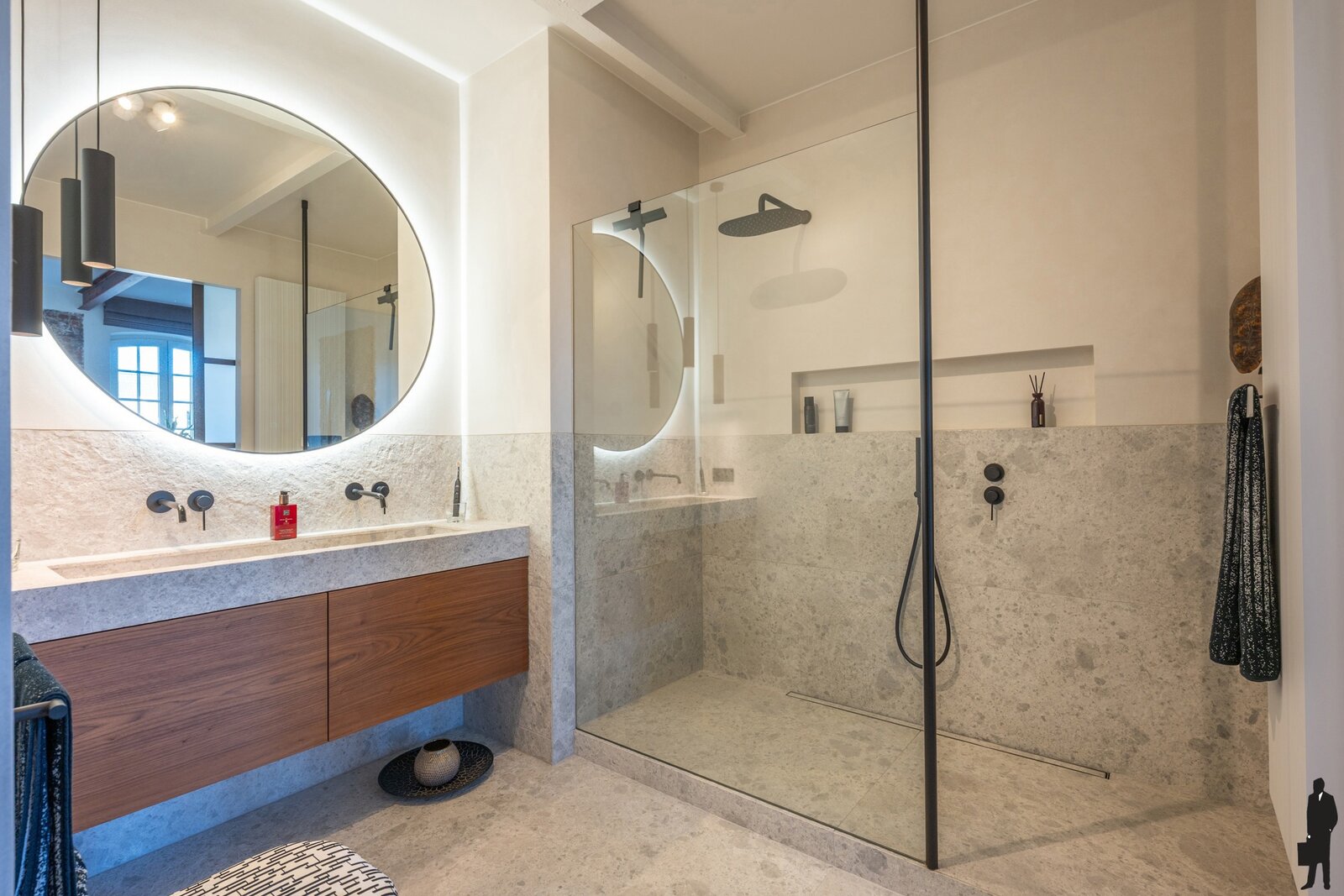 - Master bedroom met ensuite dressing en badkamer met ruime inloopdouche en dubbele lavabo, Italiaanse natuursteen en Mortex