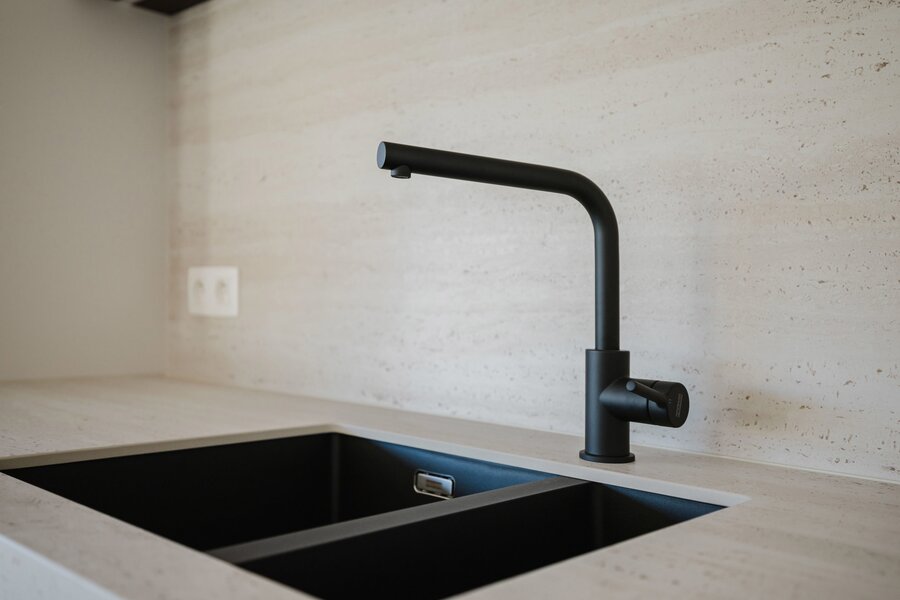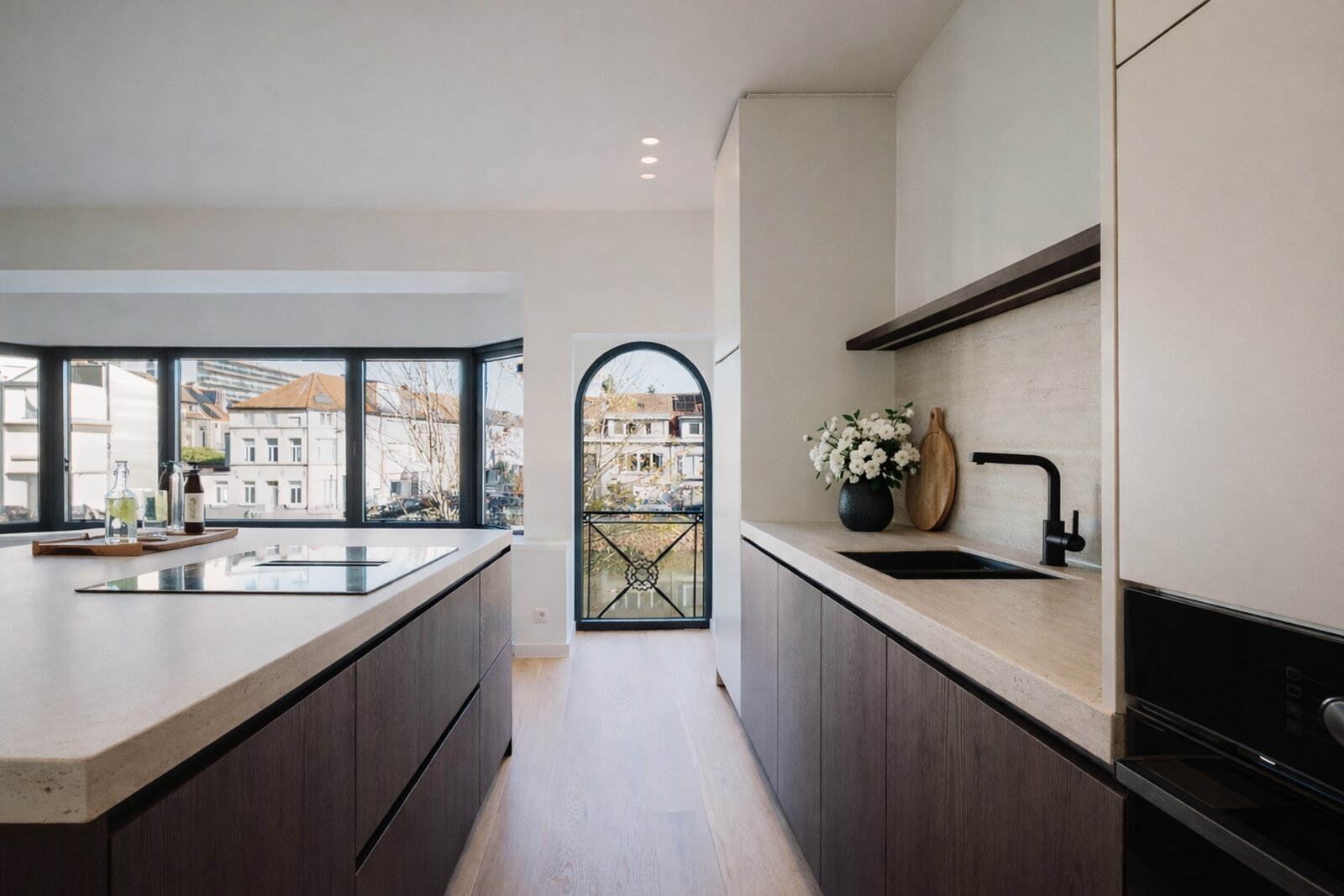 De designkeuken is volledig uitgerust met moderne toestellen en hoogwaardige afwerking.
