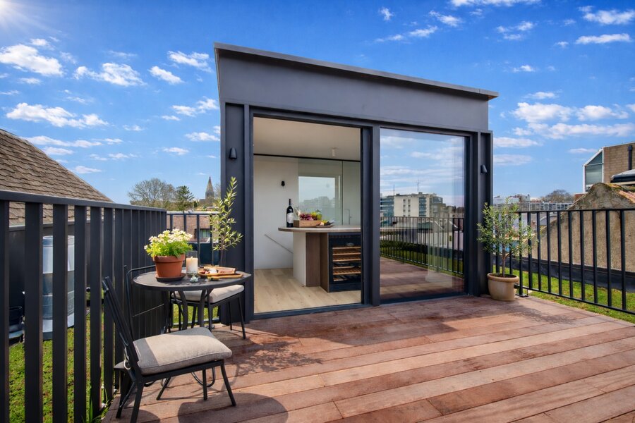 - Toegang tot een ruim zonneterras met panoramisch zicht over het water en de stad