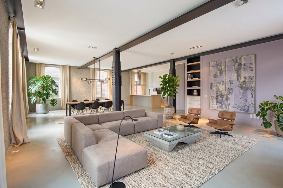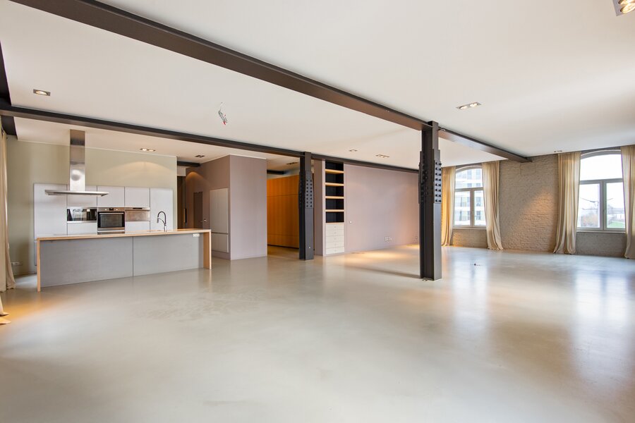 De oorspronkelijke, industriële bloemmolens Rypens dateren uit 1897. Door de eeuwen heen onderging het bakstenen complex in sobere neorenaissancestijl heel wat upgrades en transformaties. Deze loft op de tweede verdieping is goed voor 254 m² bewoonbare oppervlakte en biedt frontaal zicht op het water. Op de zevende en achtste verdieping (in de “toren”) vinden we bovendien nog twee (privatieve) polyvalente ruimtes met schitterende vergezichten.