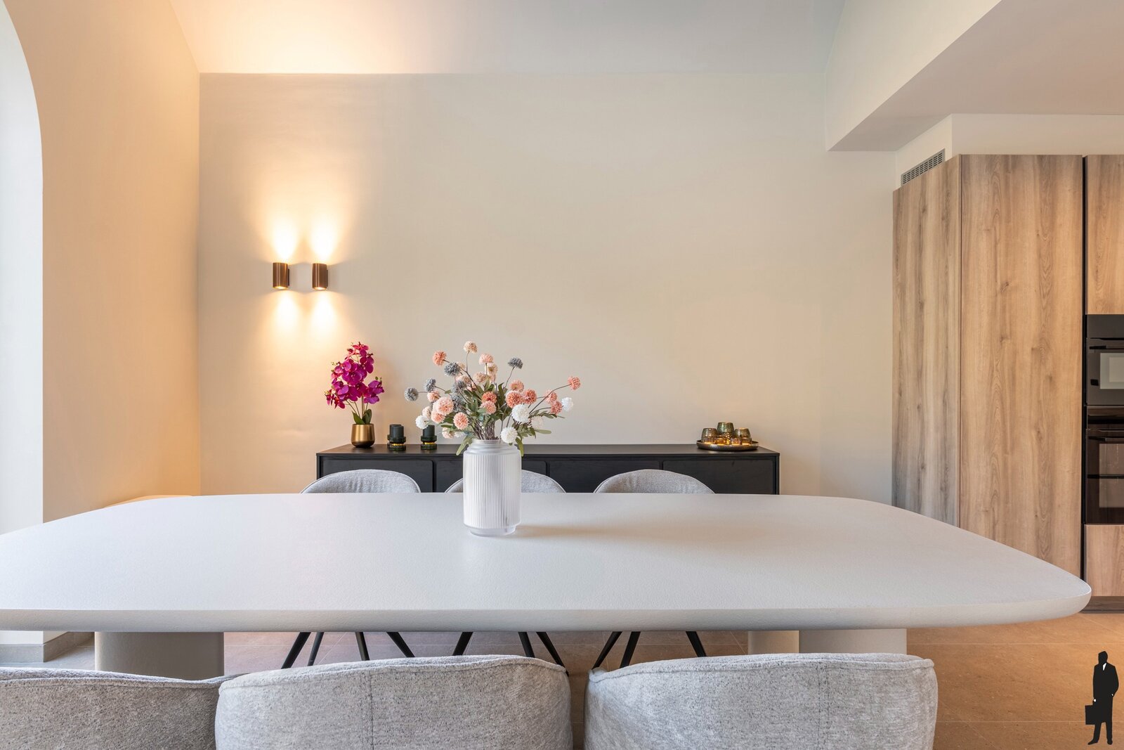 Aan de keuken bevindt zich een open eetkamerlounge met hoge raampartijen en schuifraam met toegang tot het buitenterras.
