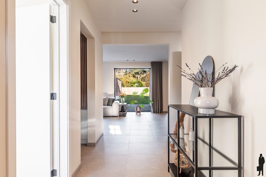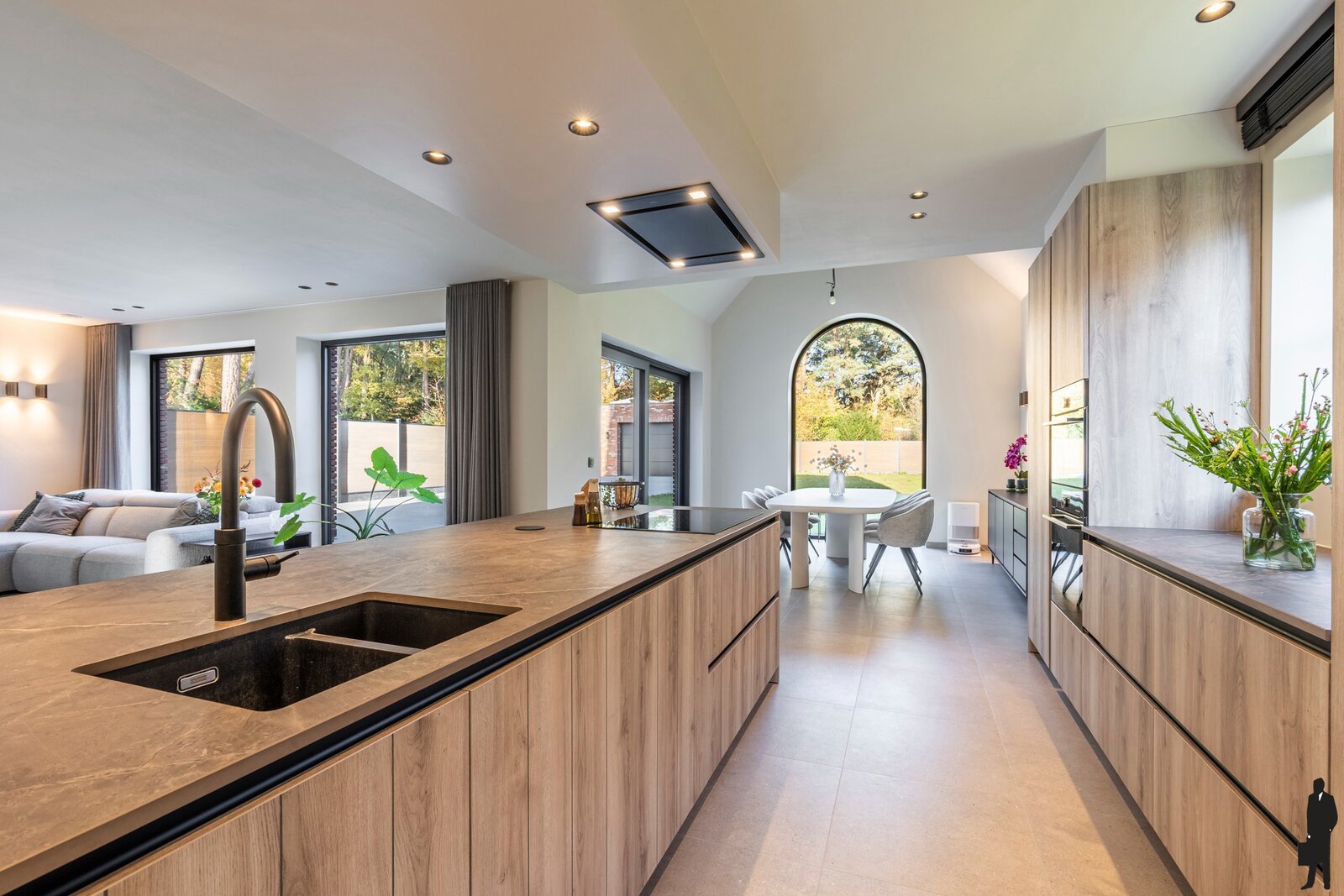Via de inkomhal met gastentoilet en vestiairegedeelte (inbouwkasten), heeft u toegang tot de afzonderlijke bureauruimte (werk- of studieruimte) en de woonkamer. De riante en lichtrijke woonkamer is verdeeld in een zitgedeelte (links), een open leefkeuken (rechts vooraan) en eetkamerdeel (rechts achteraan). De leefruimte op meerlagige kwaliteitstegel is voorzien van vloerverwarming, inbouwspots en wandverlichting. Vanuit deze leefruimte heeft u toegang tot open de keuken met verder toegang tot de bijkeuken / wasplaats. De keuken zelf is luxueus afgewerkt en geïnstalleerd met volgende kwaliteitstoestellen (allen AEG): inductiekookplaat, vaatwas, combi-(microgolf)oven en combi-stoomoven, legio kastruimte en een ruime ijskast. Er is ook een Quooker voorzien (ingebouwd aan/onder de watersteen in het kookeiland).