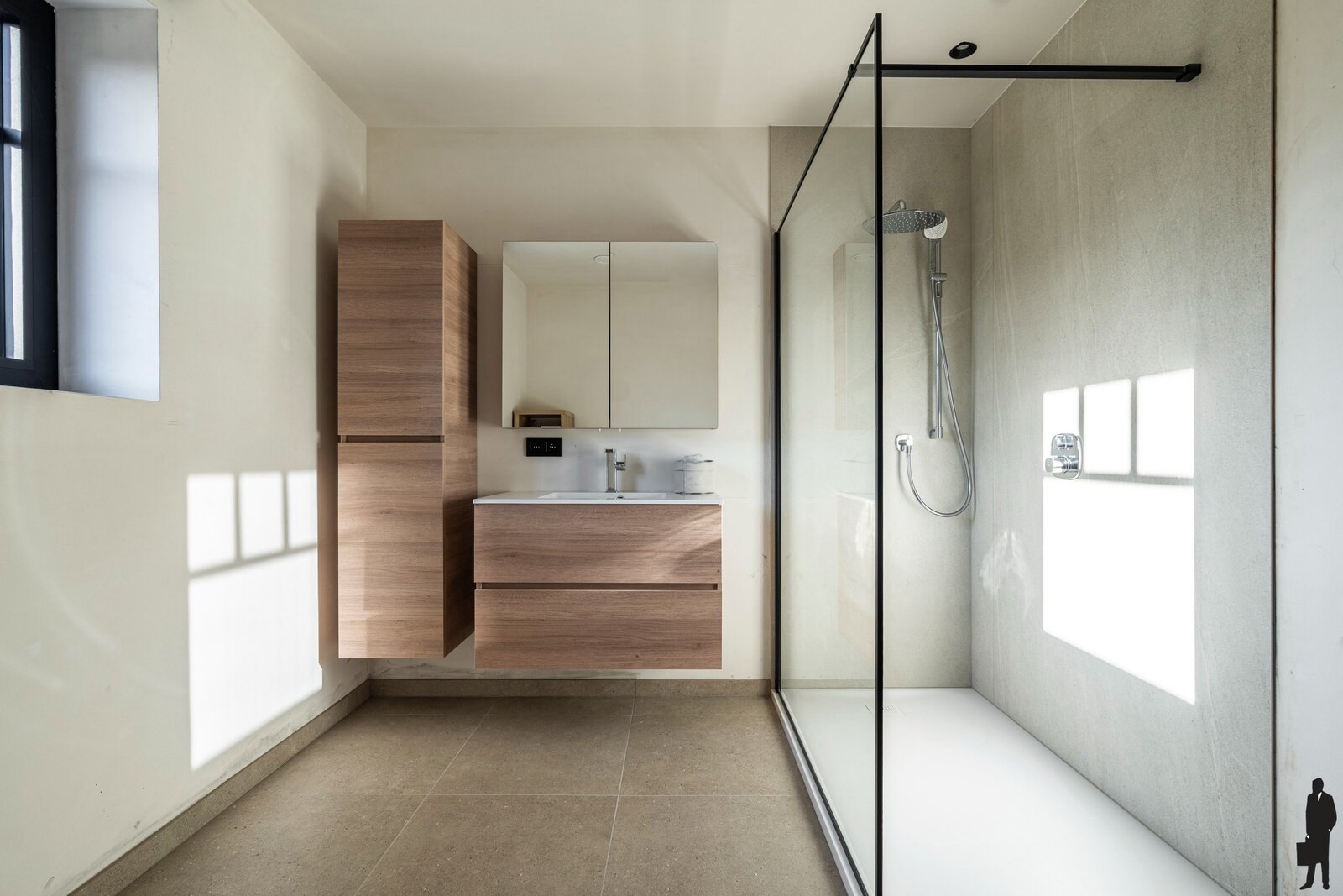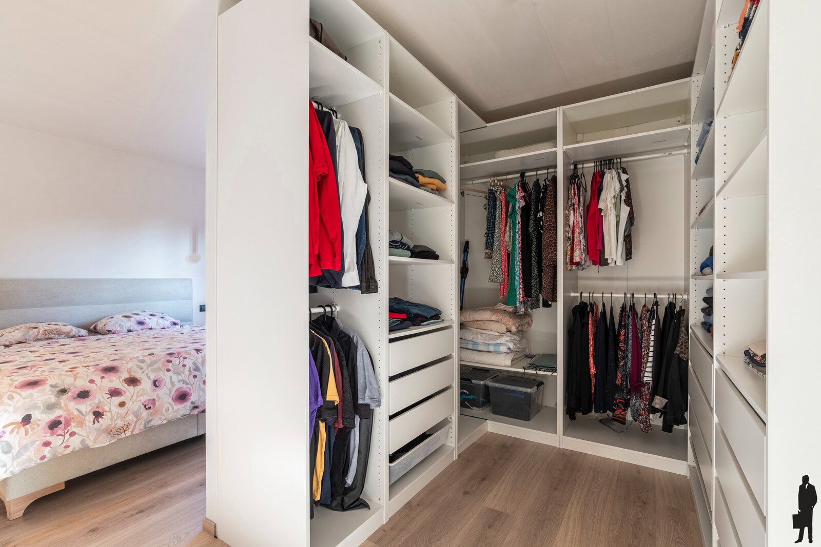 De vaste trap in de inkomhal leidt tot de eerste verdieping. Hier bevinden zich 3 ruime slaapkamers en 2 uitgeruste badkamers (waarvan 1 met ligbad en inloopdouche en 1 met inloopdouche). De hoofdslaapkamer beschikt over een eigen dressing. 1 slaapkamer doet thans dienst als fitnessruimte.