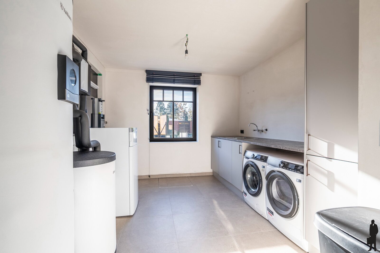 De keuken geeft tot slot toegang tot de wasplaats. Deze ruimte is eveneens volledig voorzien van inbouwkastruimte. Verder bevinden zich in deze ruimte ook alle sanitair-technische installaties (o.a. warmtepompsysteem) en is er plaats voor een extra diepvriezer of berging.