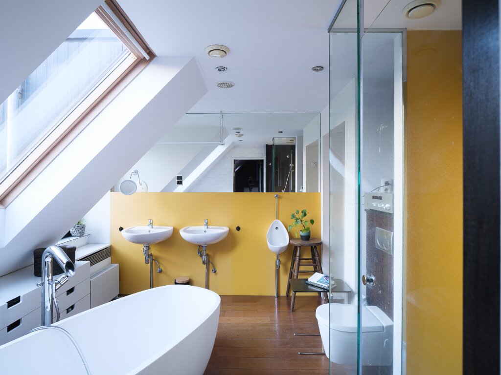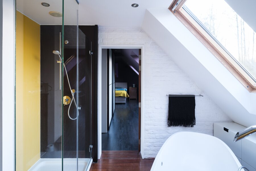 Op dit niveau bevindt zich tevens een ruime badkamer, uitgerust met ligbad, inloopdouche, toilet en dubbele wastafel. Aansluitend ligt de hoofdslaapkamer, met ruimte voor een dressing, evenals een aparte polyvalente ruimte, momenteel ingericht als bureau.