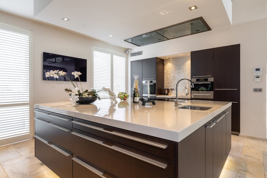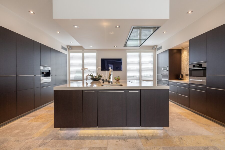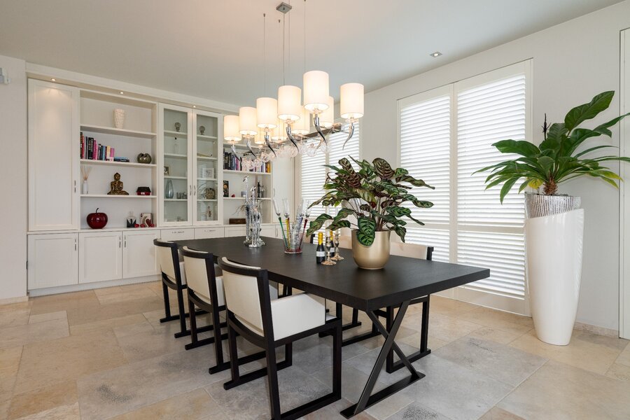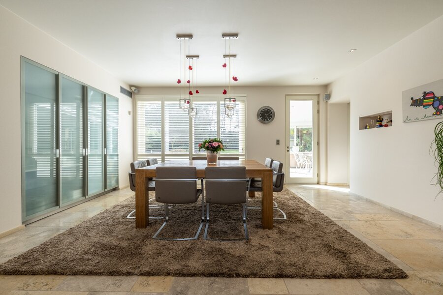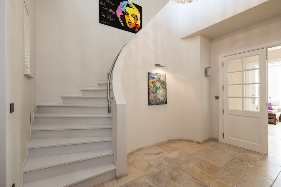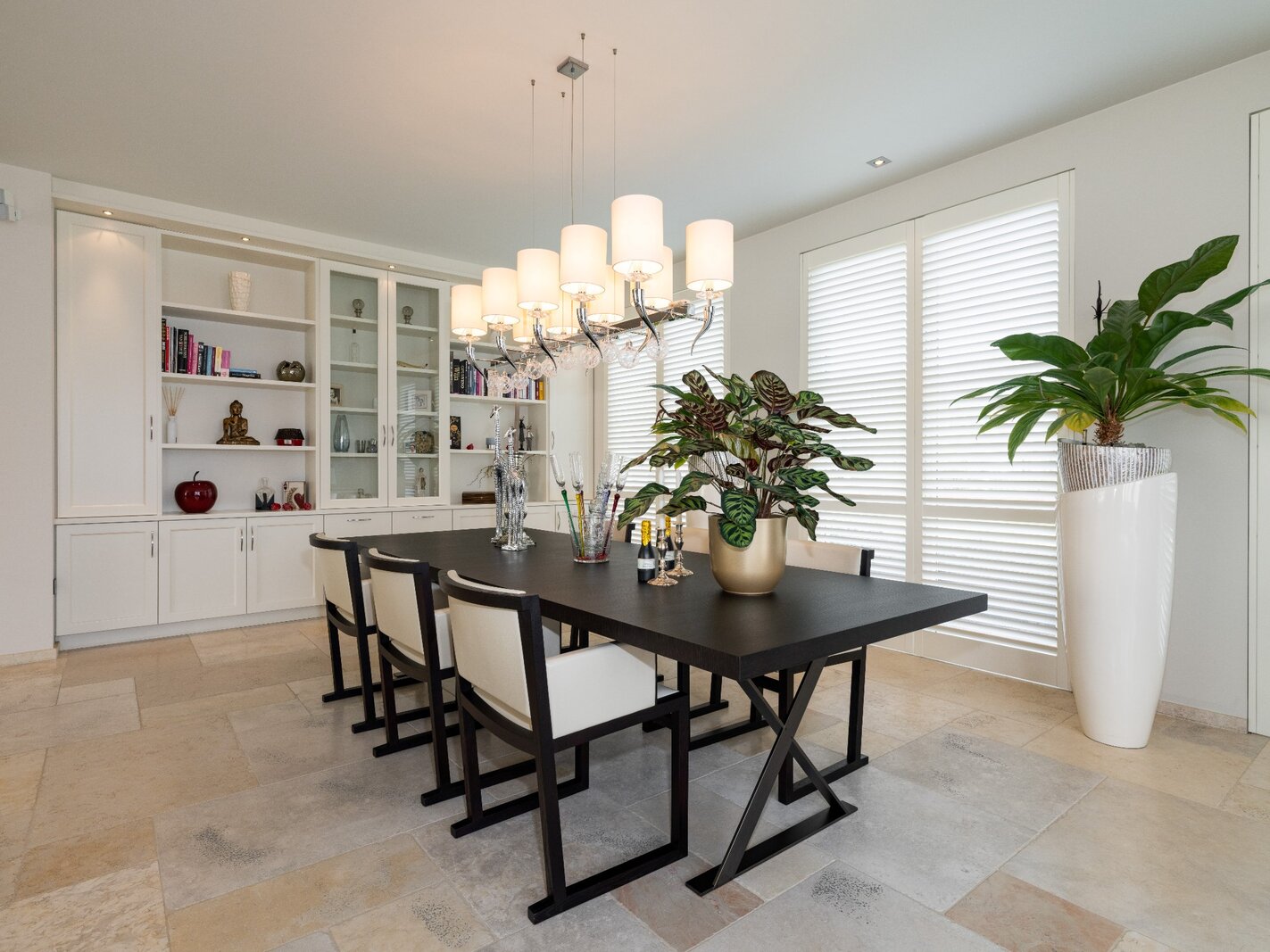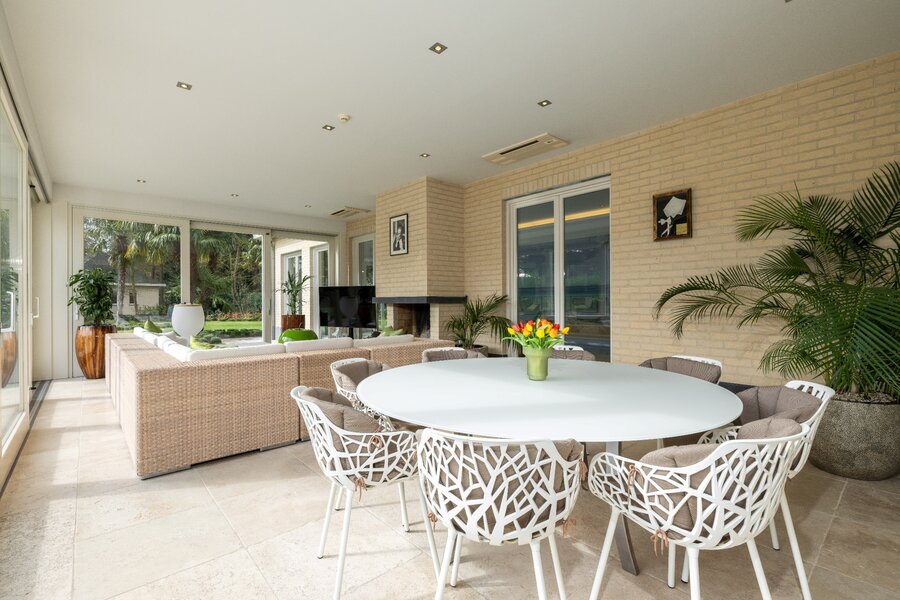 De ruime inkomhal op natuursteen biedt d.m.v. dubbel openslaande glazen deuren toegang tot de prachtige lichte leefruimte van waaruit u een mooi uitzicht heeft op de tuin achteraan. De leefruimte omvat een ruime woonkamer (ca. 100m²) op natuursteen opgedeeld in een gezellig salon met gashaard en een eetkamer, een aparte TV-hoek/kantoor en de schitterende woonkeuken die werkelijk compleet uitgerust is met koelkast, diepvriezer, afwasmachine, 2 heteluchtovens, combi-oven, inductiekookplaat, koffiemachine, 2 bordenverwarmers,... Aansluitende koele berging met ingemaakte kasten voorzien van airco voor koeling.