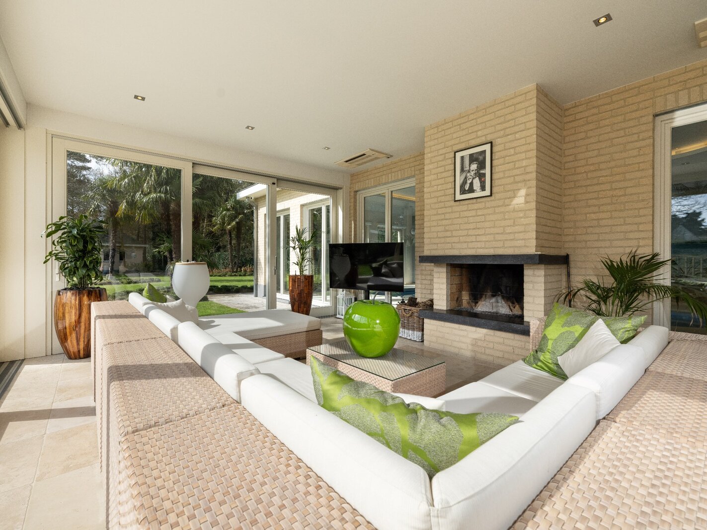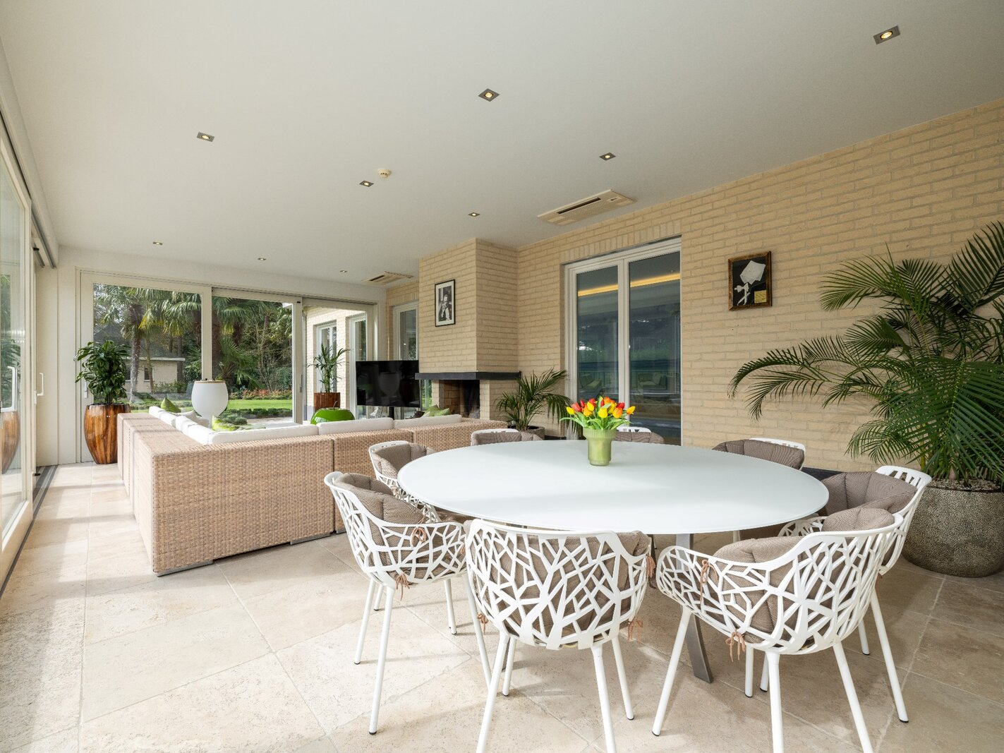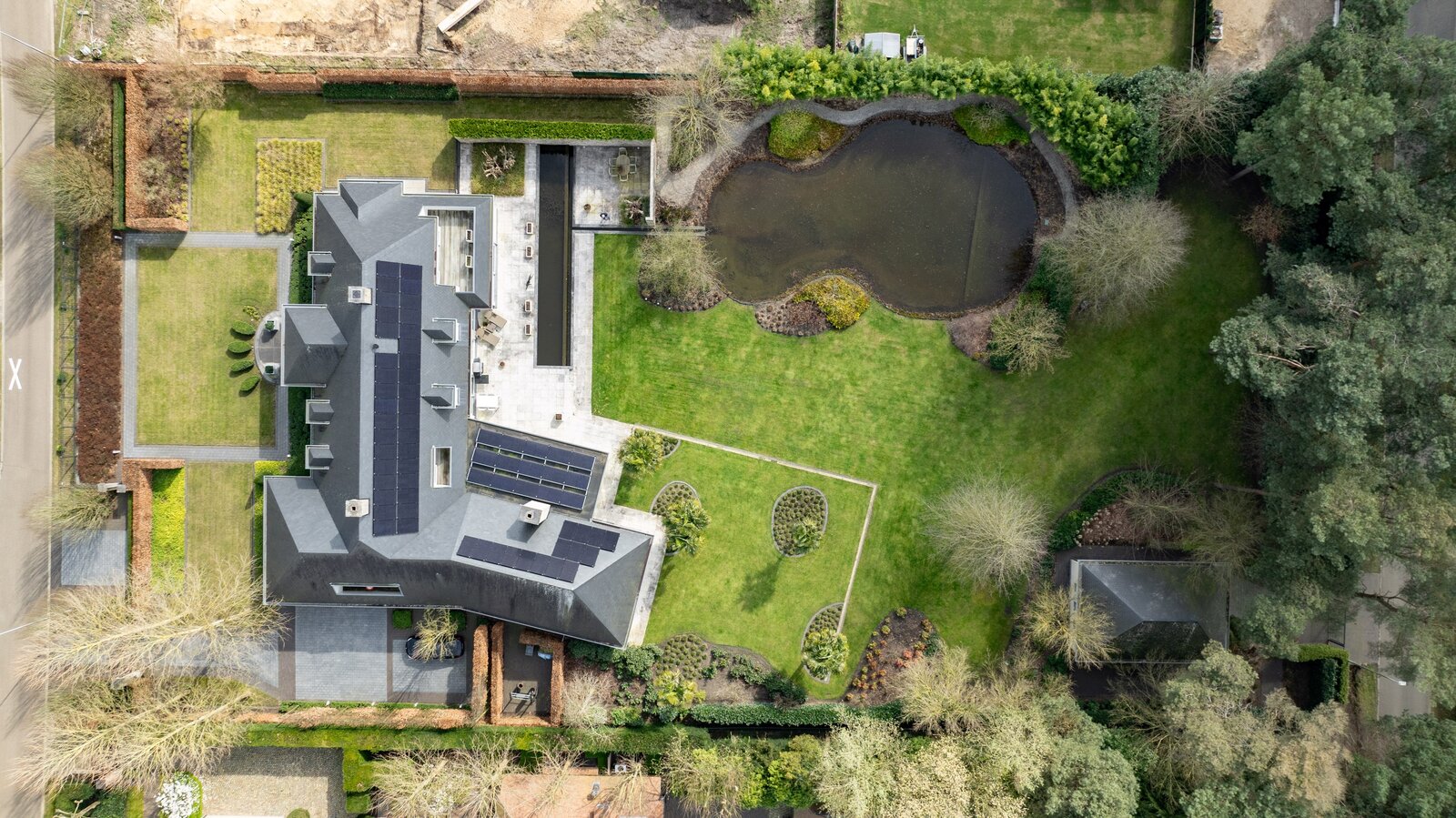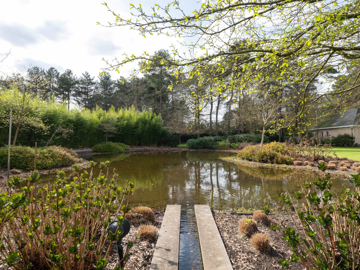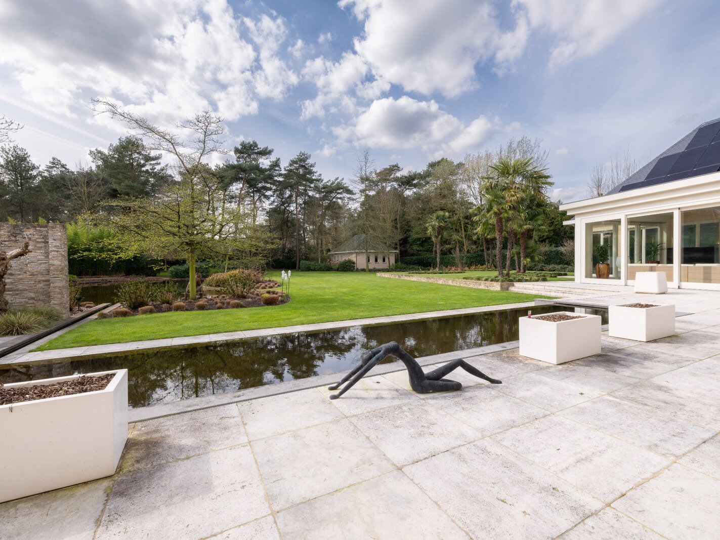 Onder architectuur (Koen Cox) aangelegde tuin. Het geheel heeft een open en net karakter waarbij water een voorname plek inneemt in het concept. De statige sterke groenomgeving is absoluut passend bij het majestueuze karakter van de woning.