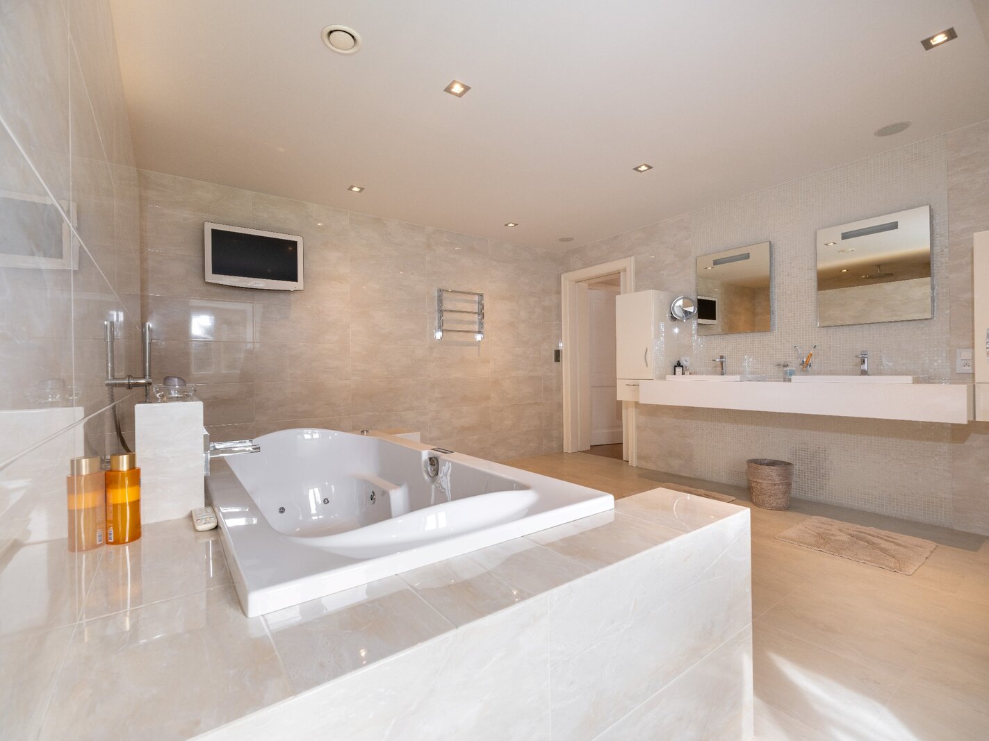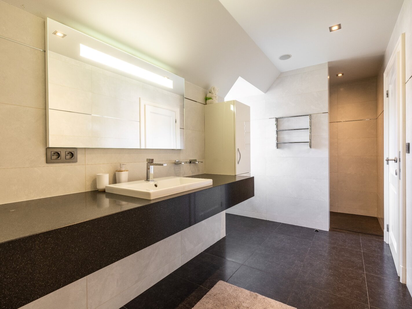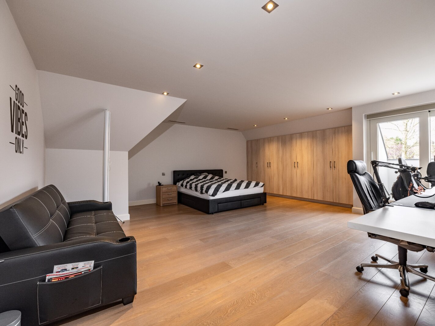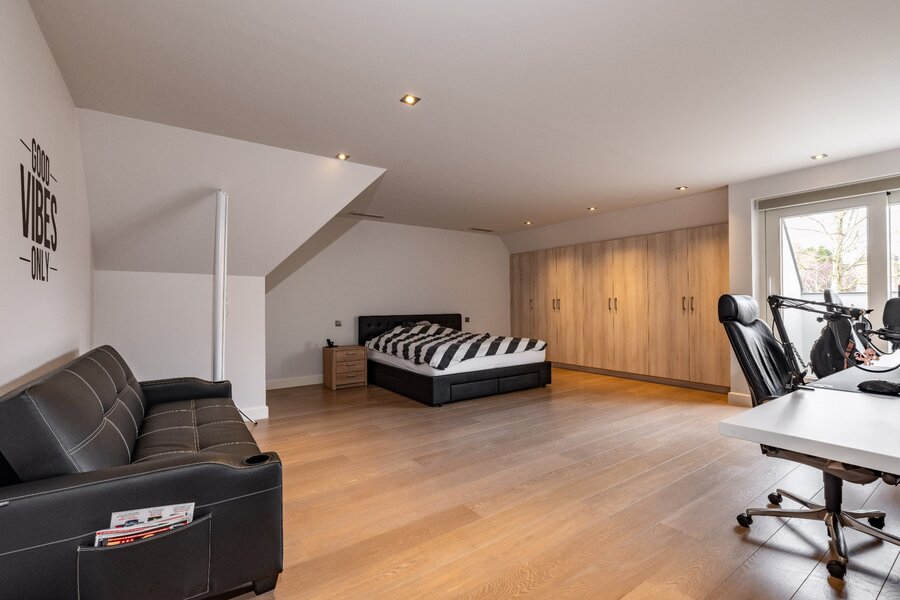 Op de verdieping treffen we de masterbedroom op parket met aansluitende dressing en volledig ingerichte badkamer voorzien van ligbad, douche (met ingebouwde zonnebank), toilet en dubbele wastafel. Via het schuifraam heeft u toegang tot een prachtig terras. Verder nog 3 bijkomende slaapkamers met ingemaakte kasten en waarvan 1 met aanpalende badkamer voorzien van toilet, lavabo en douche. Wasplaats/linnenkamer voorzien van aansluitingen voor wasmachine/droogkast en uitgietbak.