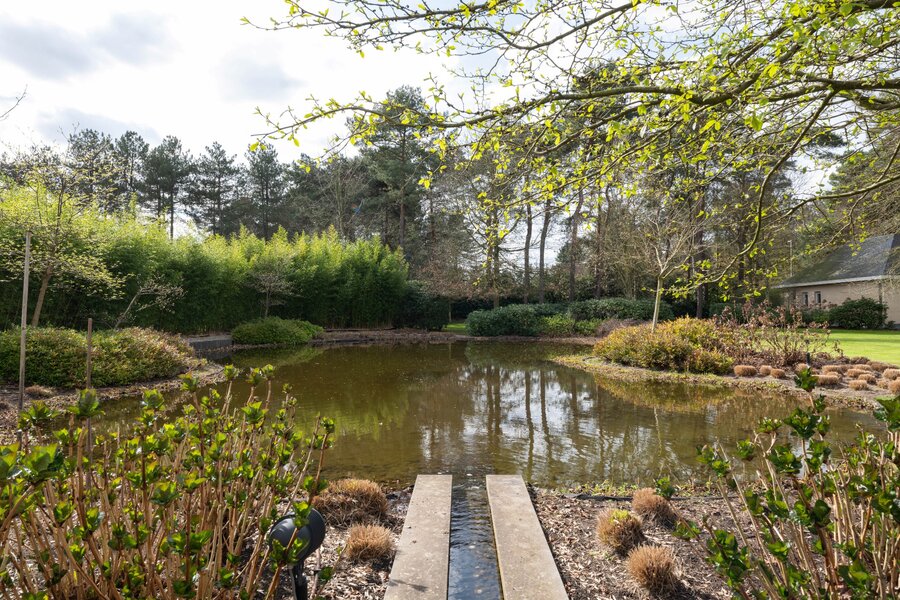 Het eigendom omvat een sfeervolle villa met inpandige wellnessruimte, een magnifieke tuin met vijverpartijen en een apart bijgebouw (volledig geïsoleerd en afgewerkt) dat momenteel dienst doet als garage.