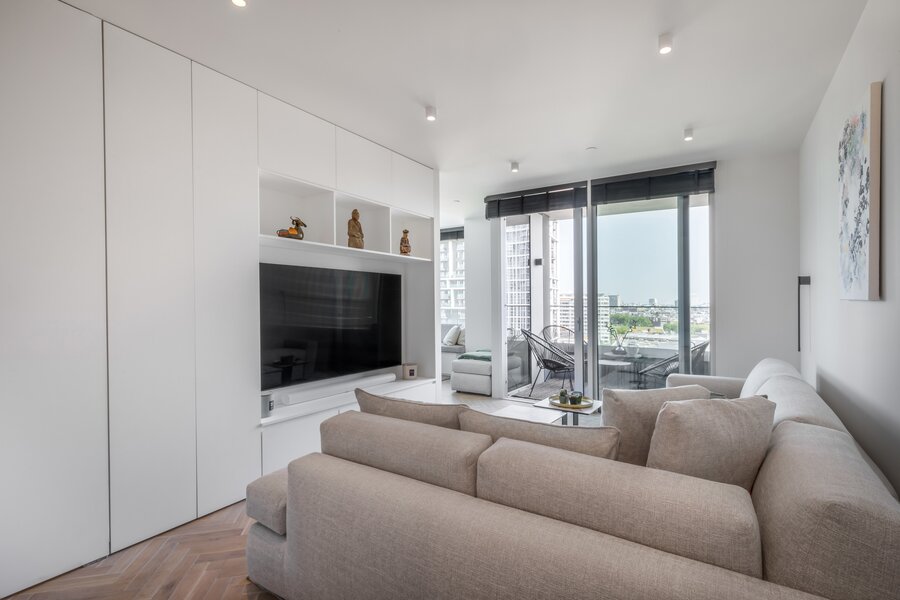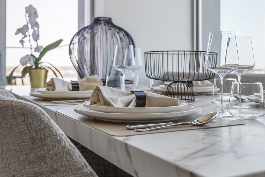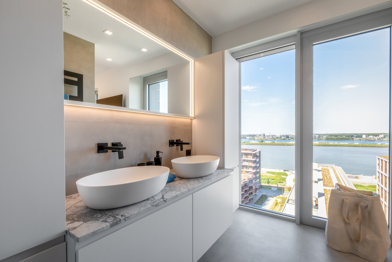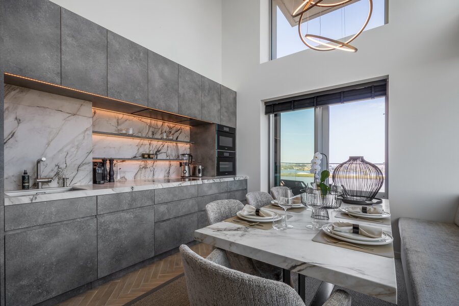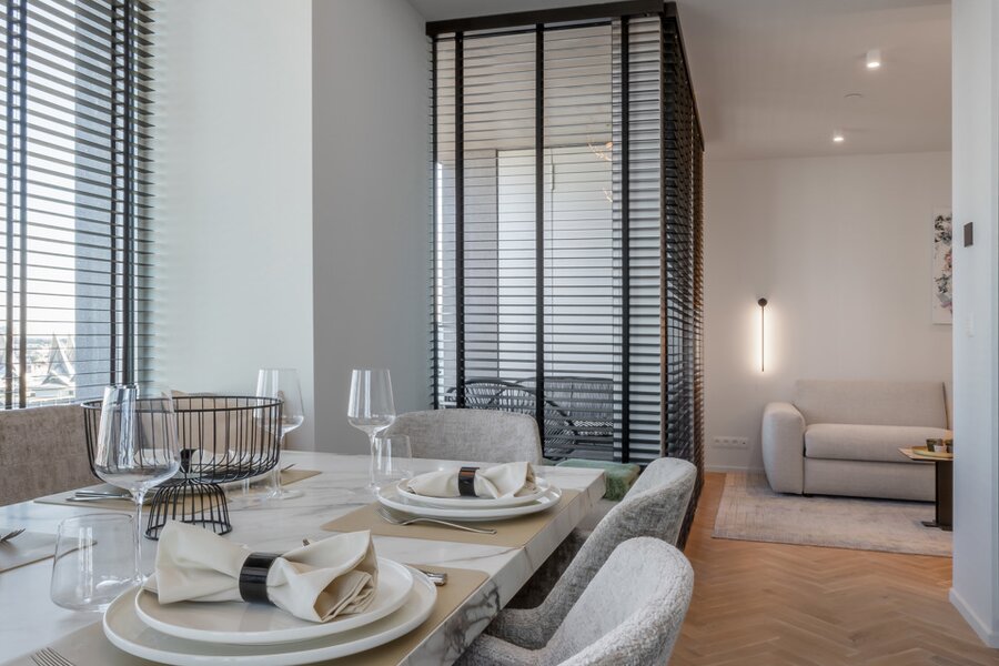 Dit uitzonderlijke appartement is hoogwaardige afgewerkt. Overal is er maatwerk voorzien, waaronder luxueuze ingebouwde kasten, zelfs onder de bedden en zitbanken. De keuken is volledig op maat gemaakt, waarbij het design van de eettafel en salontafel naadloos aansluit op het keukenblad. De dubbele hoge plafonds in de keuken en eetkamer zorgen voor een ruimtelijk gevoel en geven een extra vleugje grandeur.