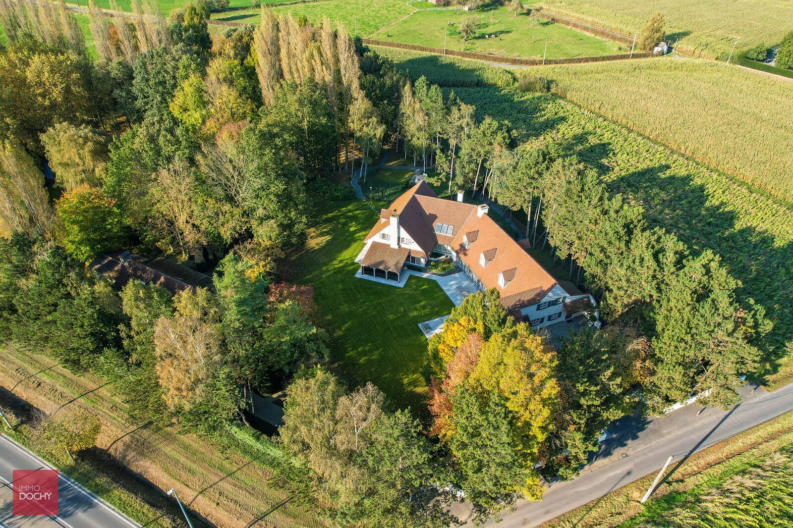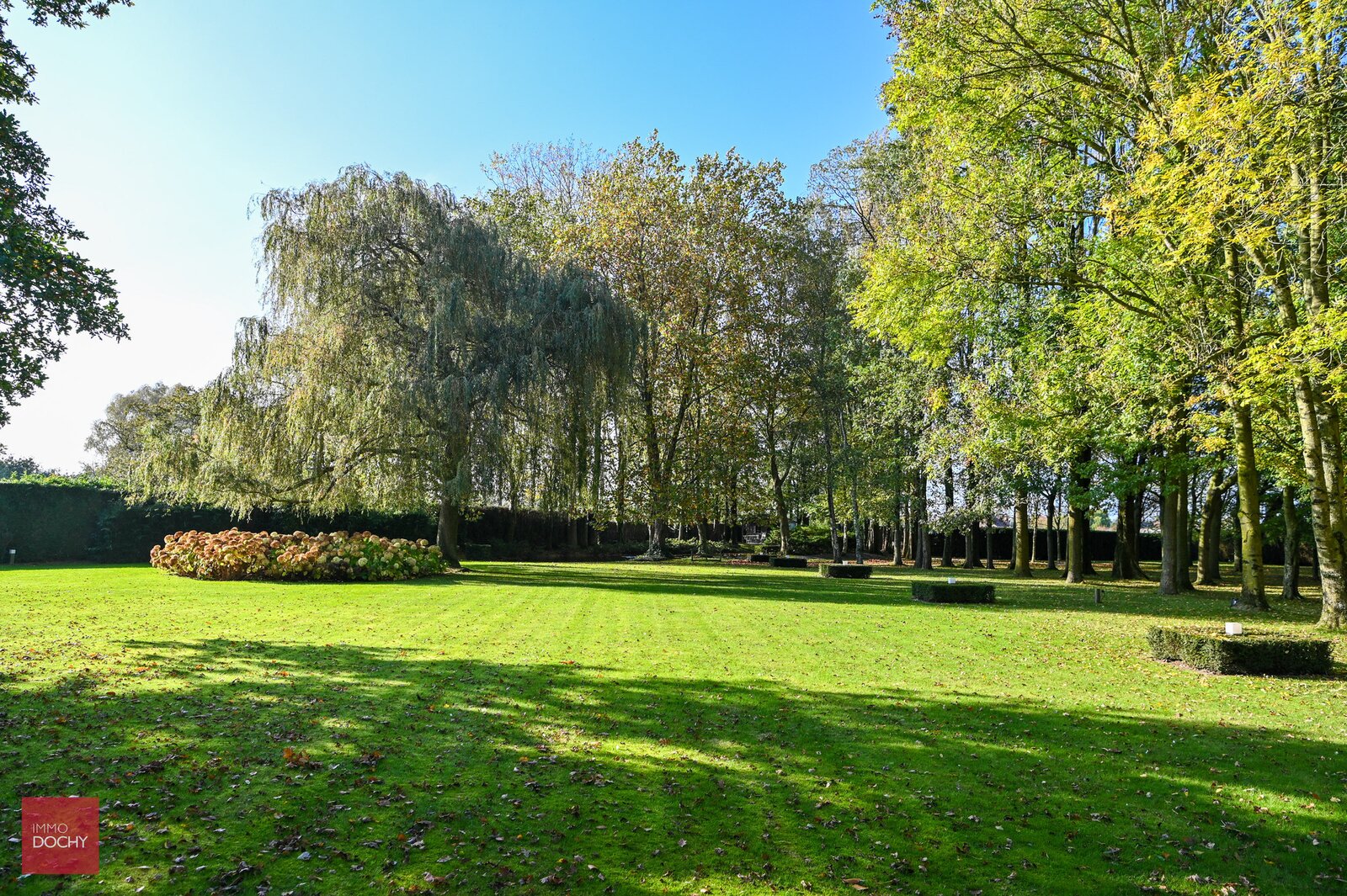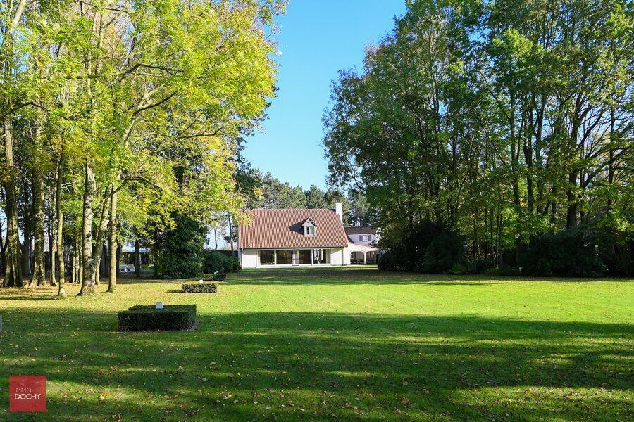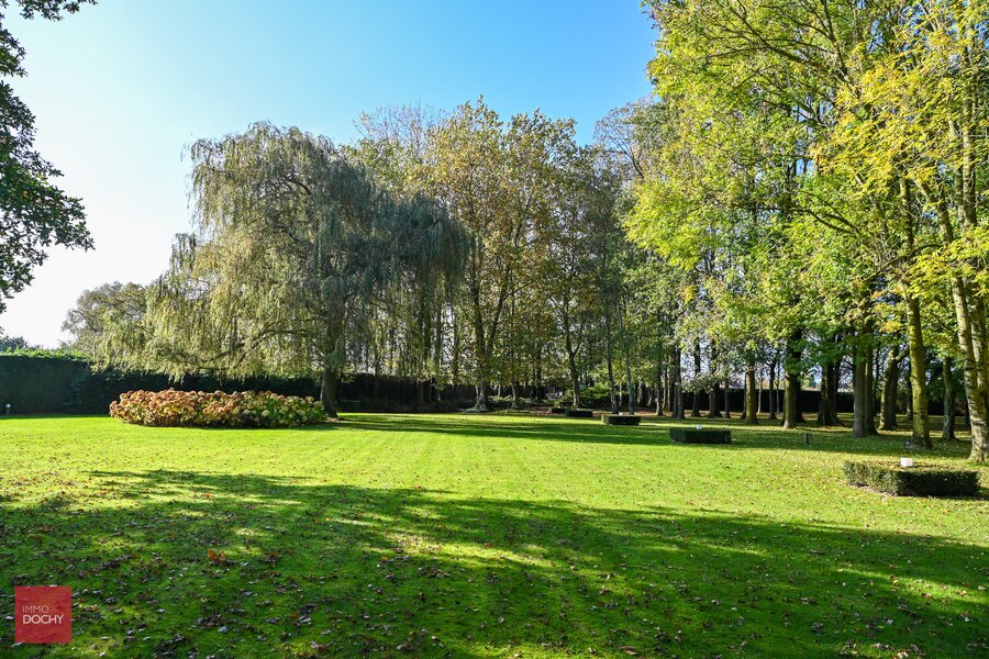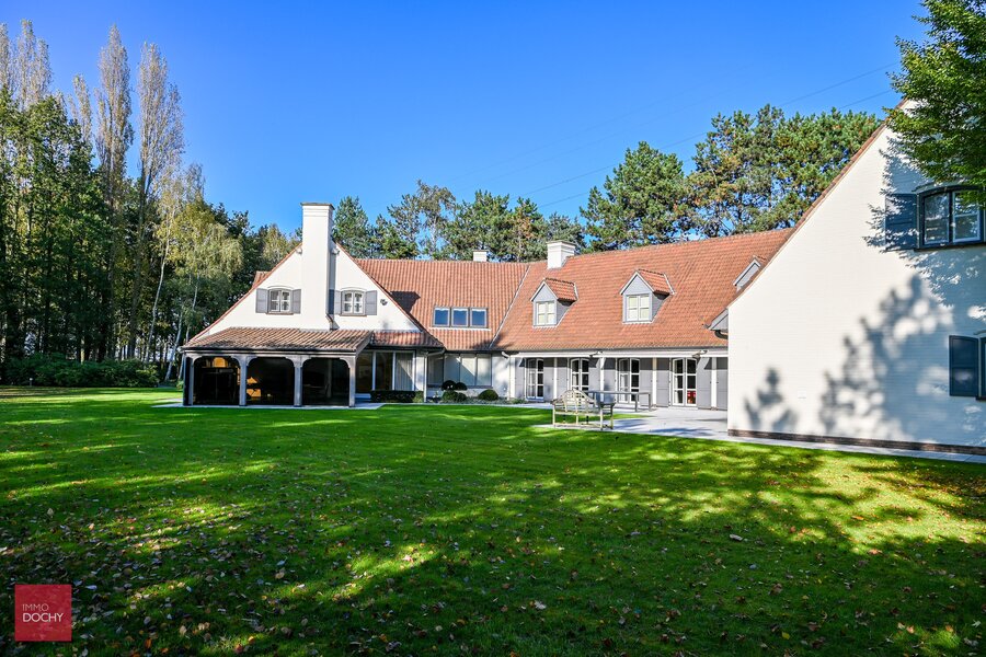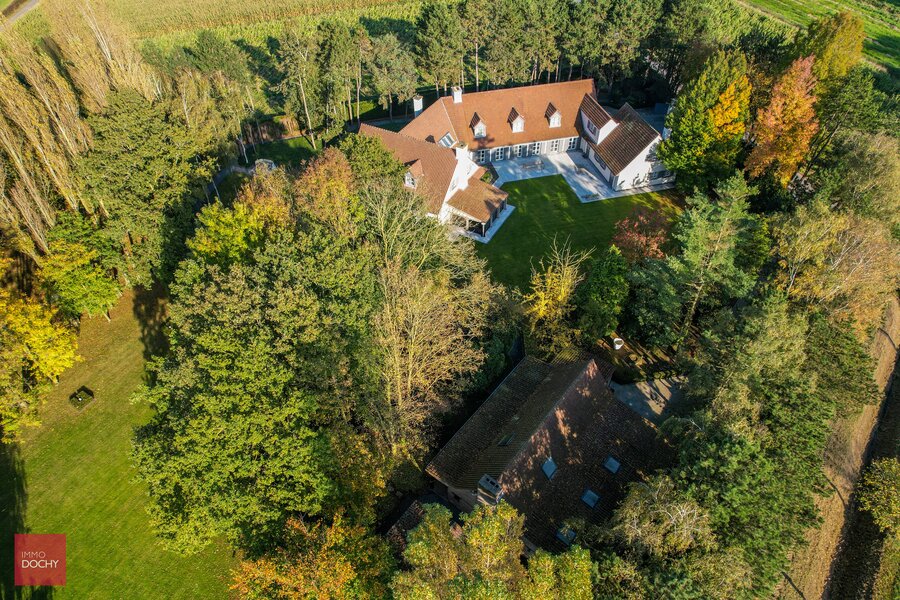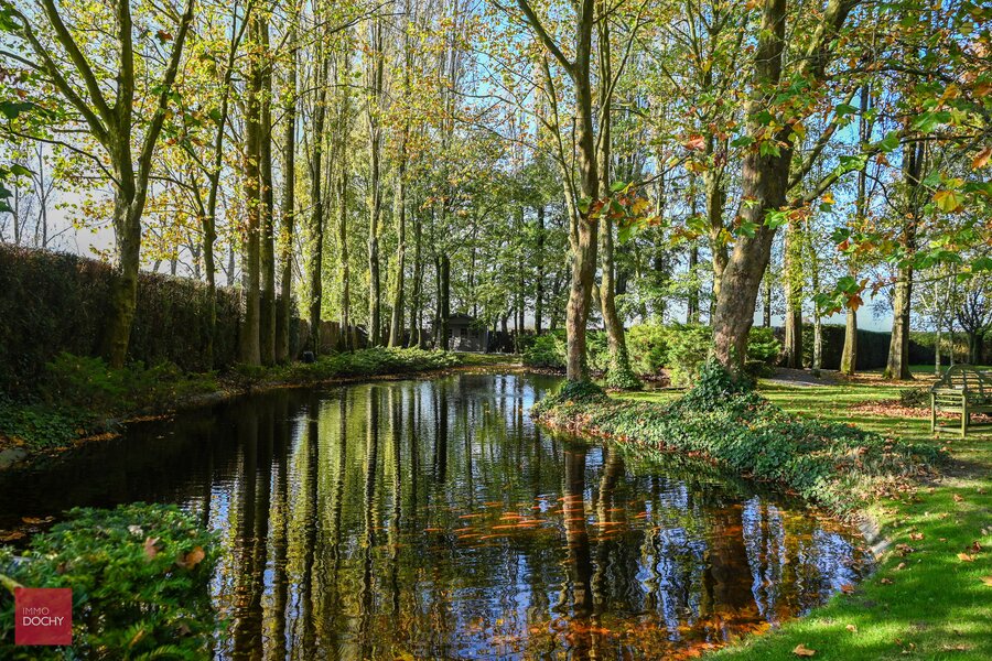 Prachtig domein met ruim landhuis bestaande uit inkomhal, living met open haard en eetplaats, ingerichte keuken met ontbijthoek, bijkeuken (wasplaats), tv-hoek, binnenzwembad, jaccuzzi, 2 burelen, 5 slaapkamers, 3 badkamers, kelders (wijn-en voorraadkelder), grote garage en carport. Conciërgerie (bijgebouw) met ruime living (mancave), bar, keuken, slaapkamers, berging en garage. Prachtige tuin met tuinberging, vijver en overdekt terras met barbecue. Domein van ca. 1,5ha.