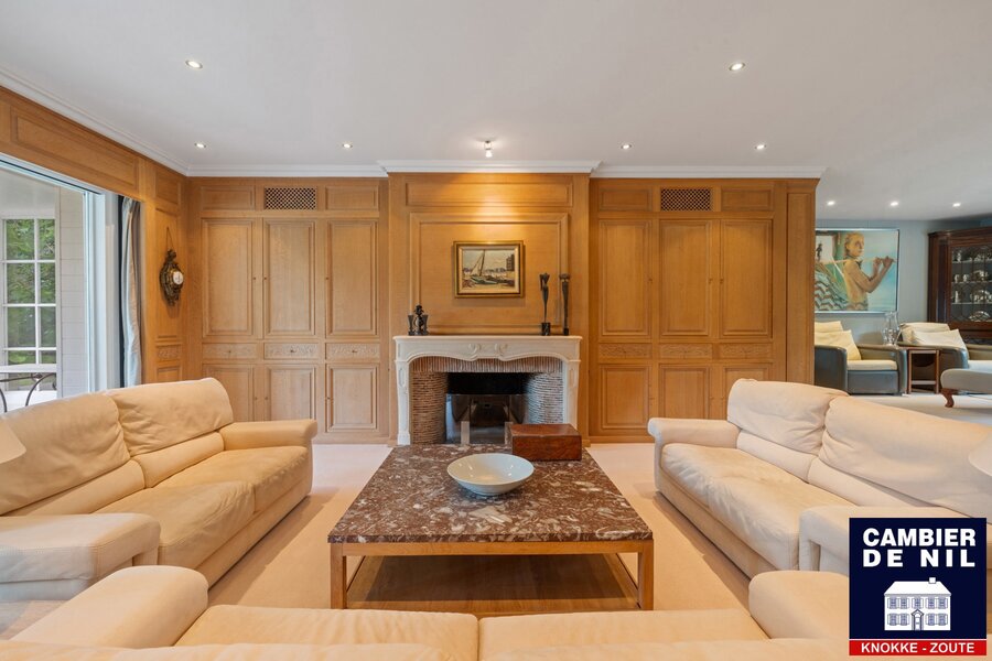 Ruime villa rustig gelegen nabij de Royal Zoute Golf Club en het Dominicanenkerkje. Indeling : Grote inkomhal met gastentoilet en vestiaire. Lichtrijke living uitgevend op terras en zonovergoten zuidgerichte tuin met charmante vijver. TV-hoek, eetkamer, volledig ingerichte leefkeuken.