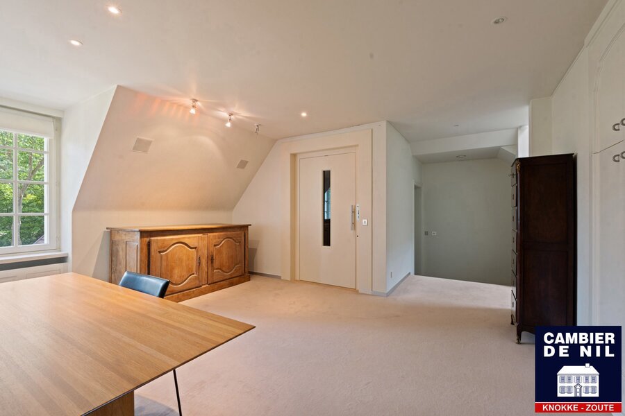 Garage voor 2 wagens met wasplaats en douche. Personenlift aanwezig van niveau 0 tot +1. Meerdere buitenparkings. Eerste verdieping : grote masterbedroom uitgevend op terras met uitzicht op de tuin, voorzien van dressing en een ensuite badkamer. Tweede slaapkamer met badkamer en buitenterras. Studio met leefruimte, badkamer en keuken (ideaal voor conciërgerie of nanny). Tweede verdieping : grote polyvalente ruimte, technische ruimte en een apart toilet. Wijnkelder.