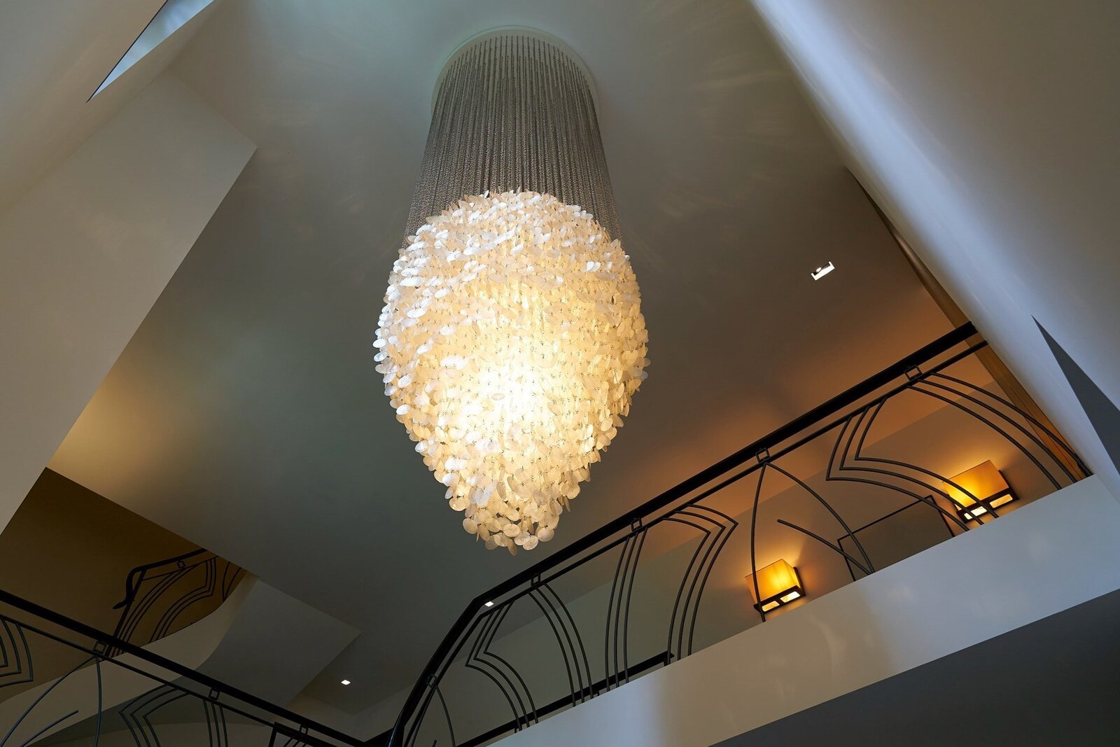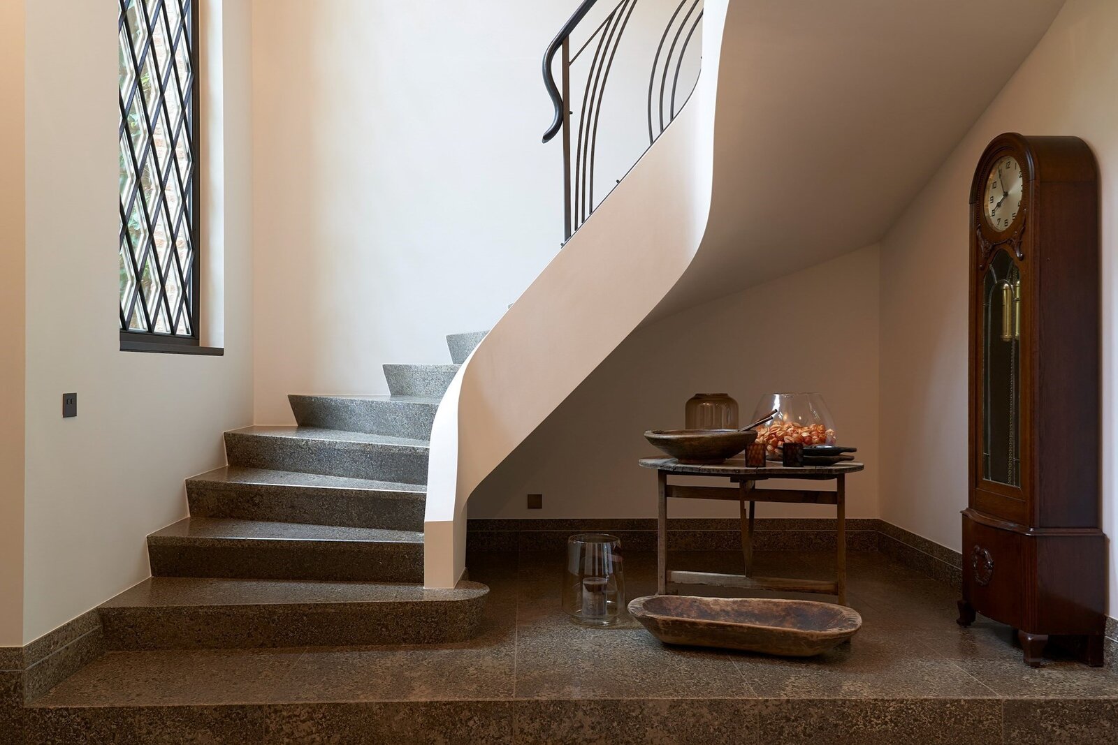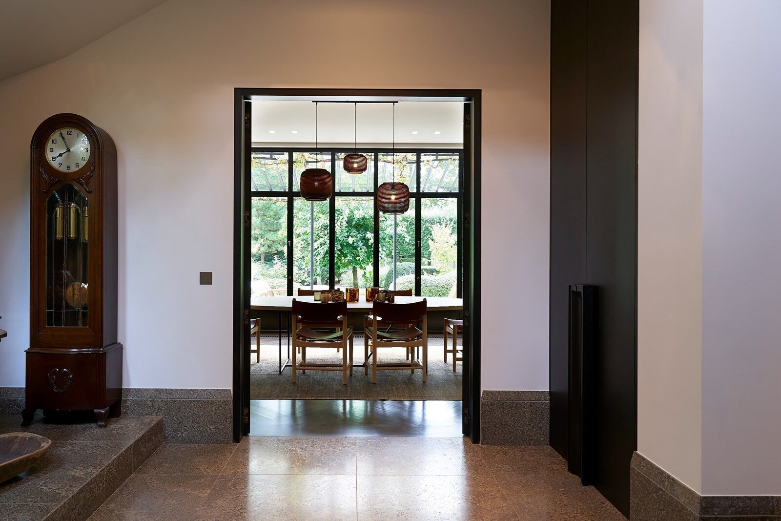 Royale inkomhal met unieke marmer tegel in groot formaat, prachtige traphal met marmeren trap en smeedijzeren balustrade met vide naar verdieping, lift met stopplaatsen op gelijkvloers, 1ste en 2de verdieping, ruime ingemaakte vestiairekast, gastentoilet en toegang naar garage voor 2 wagens (met automatische poorten ), centrale eetkamer met donker gebeitste Hongaarse punt met grote openslaande smeedijzeren deuren naar het glazen overdekt terras in smeedwerk, prachtige woonkamer met grote op hout gestookte open haard en grote raampartijen, ruim huiskantoor met eigen ingang met toilet, ruime ingerichte leef keuken (51,7 m²) met ontbijthoek en open haard, aansluitend een aparte keukenberging, sauna en doucheruimte voor het zwembad, dienstinkom