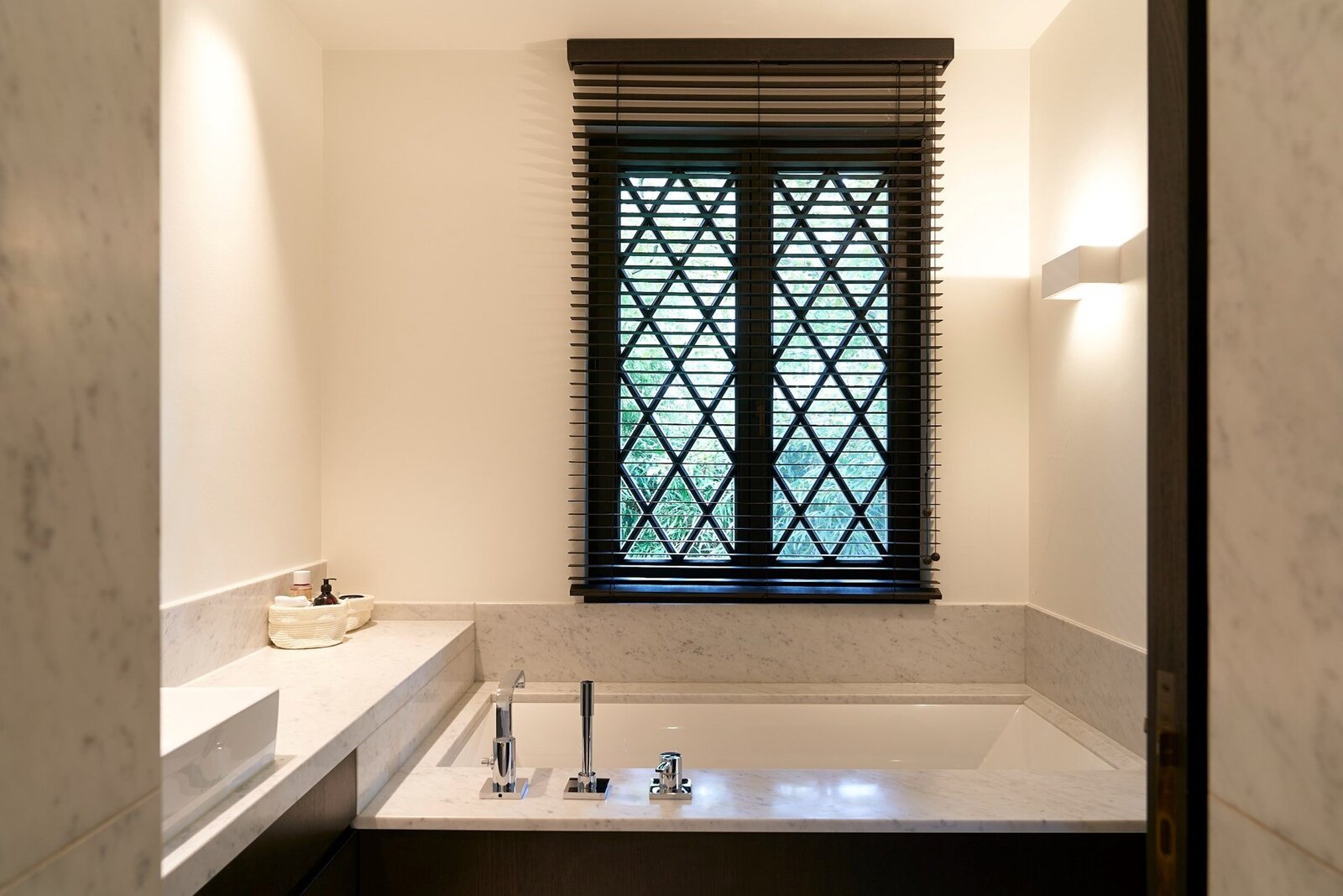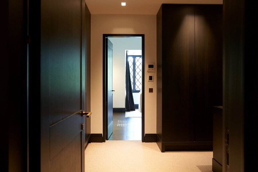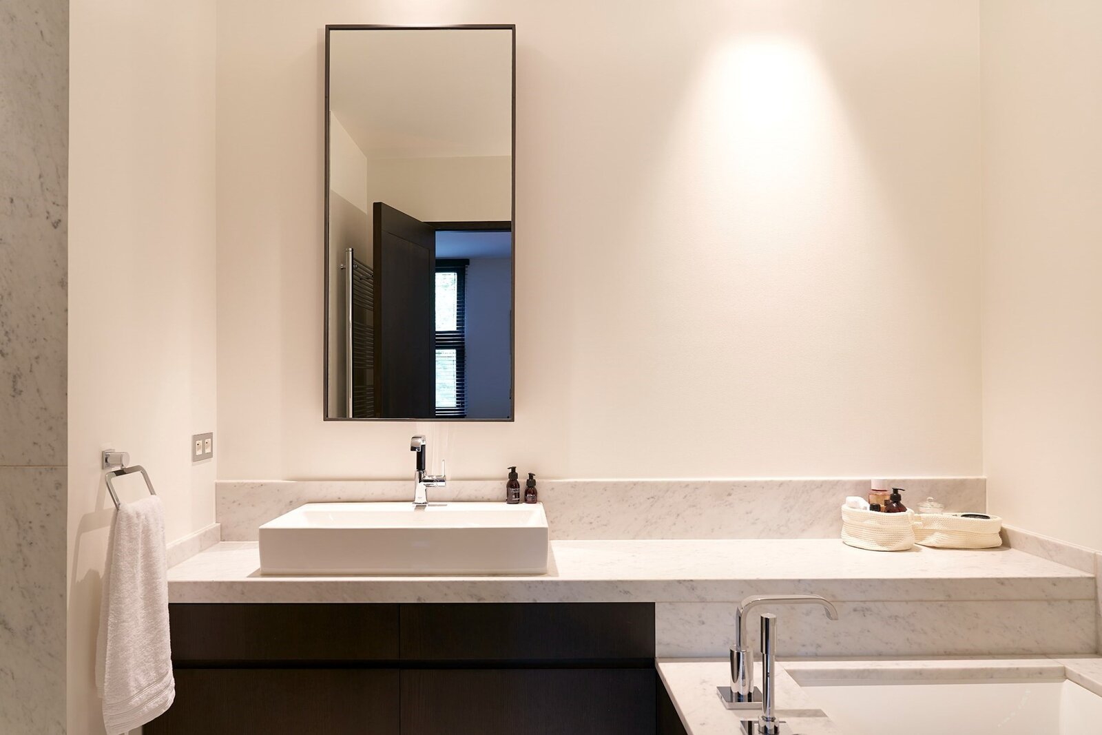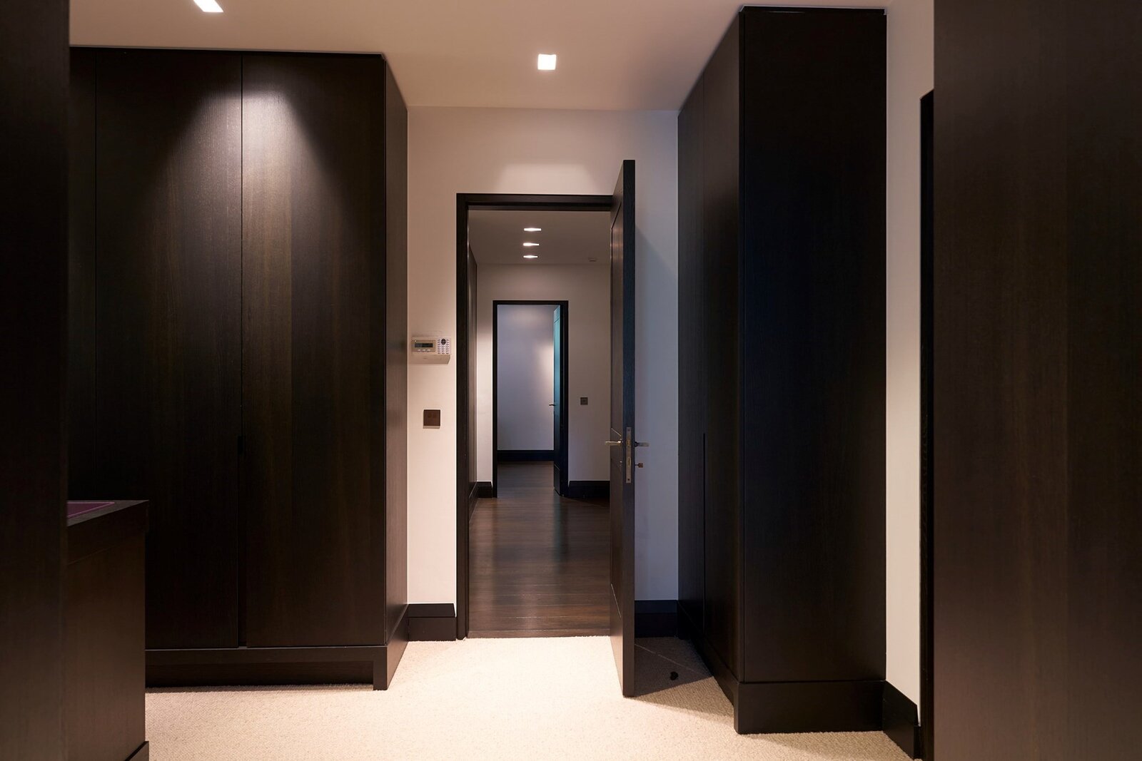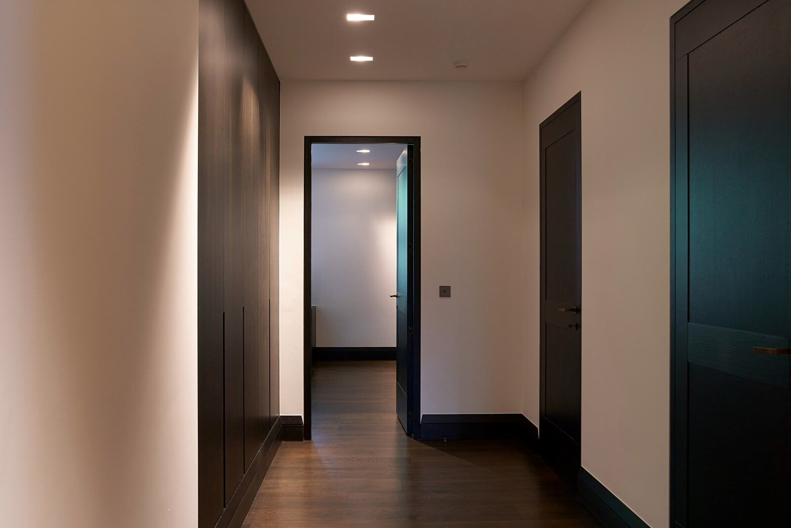 Indeling eerste verdieping: ruime overloop met eiken planken, lift en linnenkamer, supermooie ouderslaapkamer met erker, prachtige dressing met midden een ladenblok en rondom ingemaakte kasten op vast tapijt, zeer luxueuze badkamer volledig in Emperador marmer (dubbele wastafel met kastjes, apart toilet, groot ligbad en een dubbele inloopdouche. Tweede ruime slaapkamer (28,2 m²) met ingemaakte kasten en een tweede luxe marmeren (witte carrara) badkamer. Derde ruime slaapkamer (30 m²) met ingemaakte kasten, vierde ruime slaapkamer en een derde luxe marmeren (witte carrara) douchekamer, apart toilet, ruime wasplaats met ingemaakte kasten.