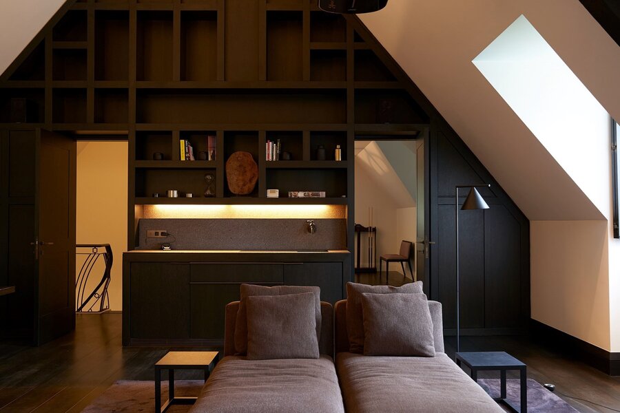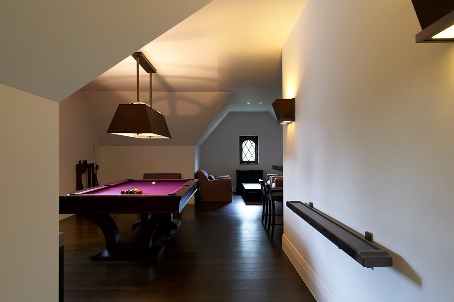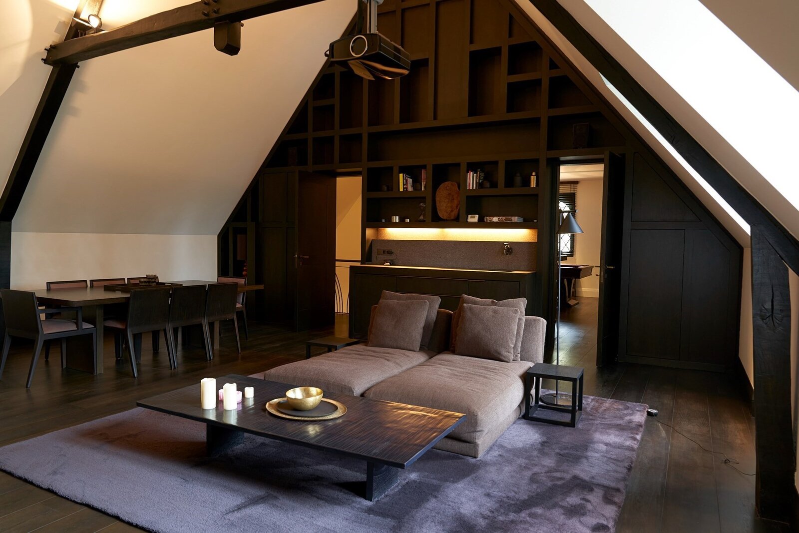 Indeling tweede verdieping: ruime extra leefruimte met home theater en prachtige ingemaakte kast, biljartkamer met fraaie bar, lift, fitnessruimte en technische ruimte en machinekamer voor de lift.