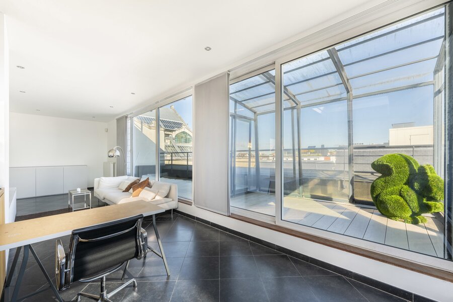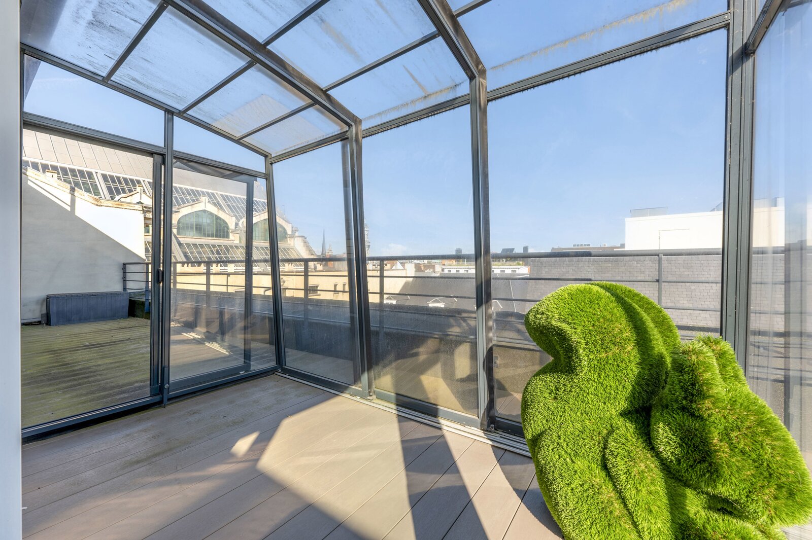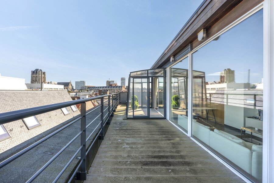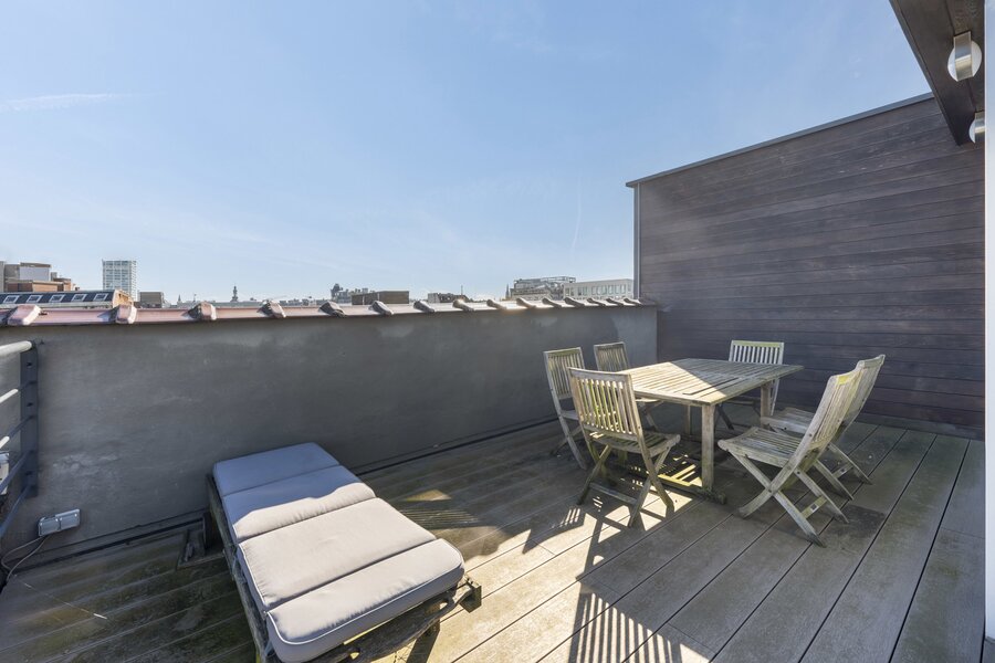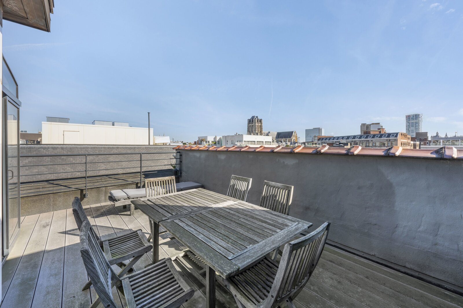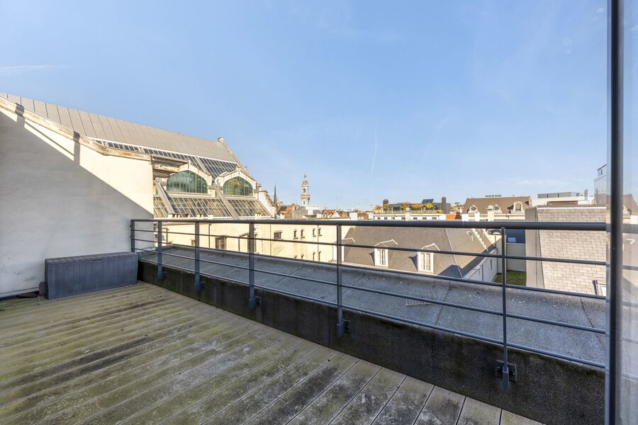 Ruim duplex dakappartement met panoramisch zonneterras van ca. 50m² gelegen op absolute toplocatie in het centrum van Antwerpen nabij tal van winkels, restaurants, de Meir en de gezellige Vogelmarkt.