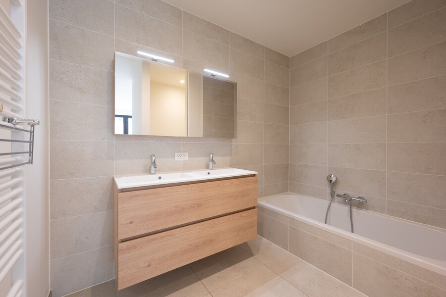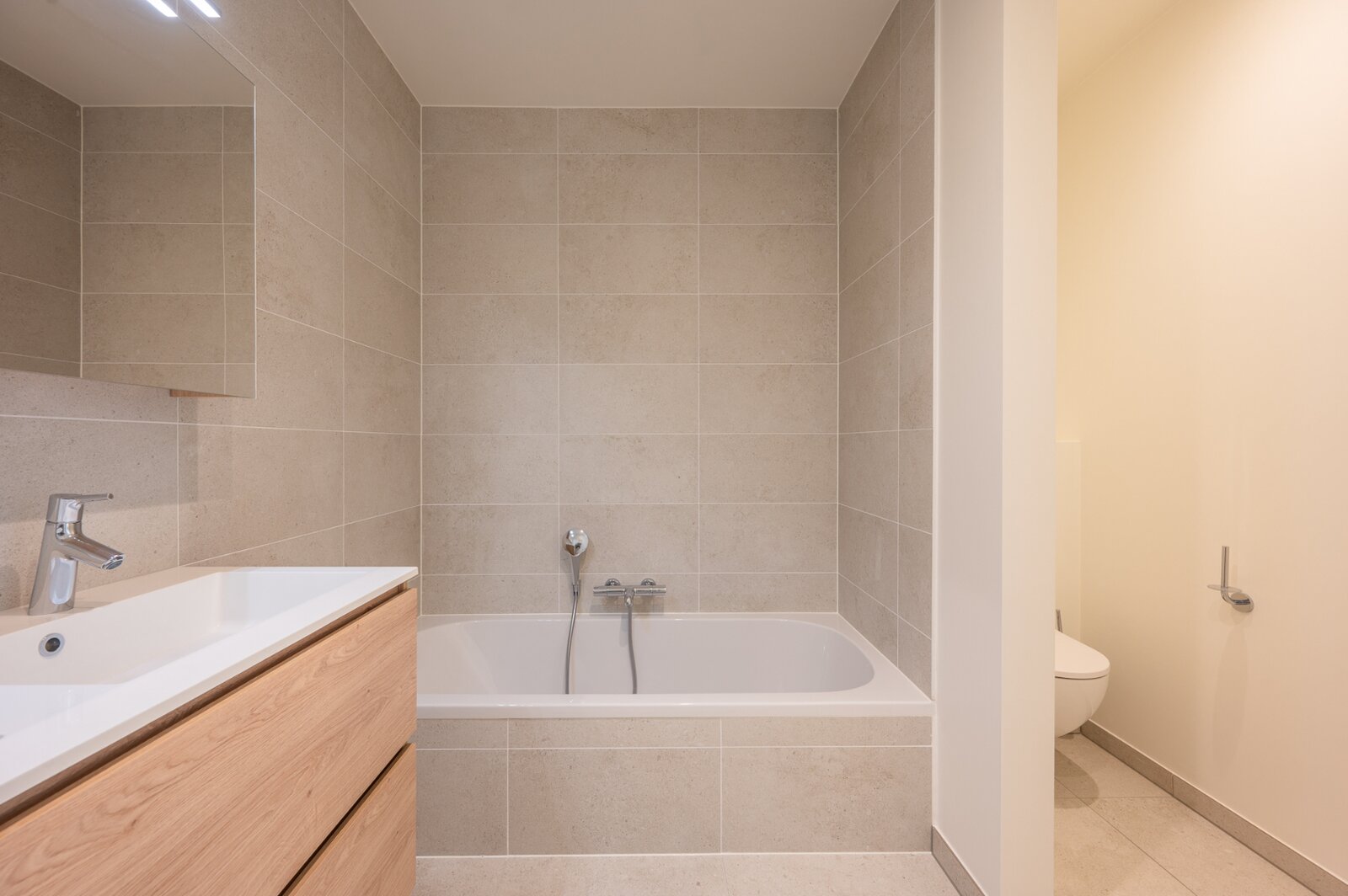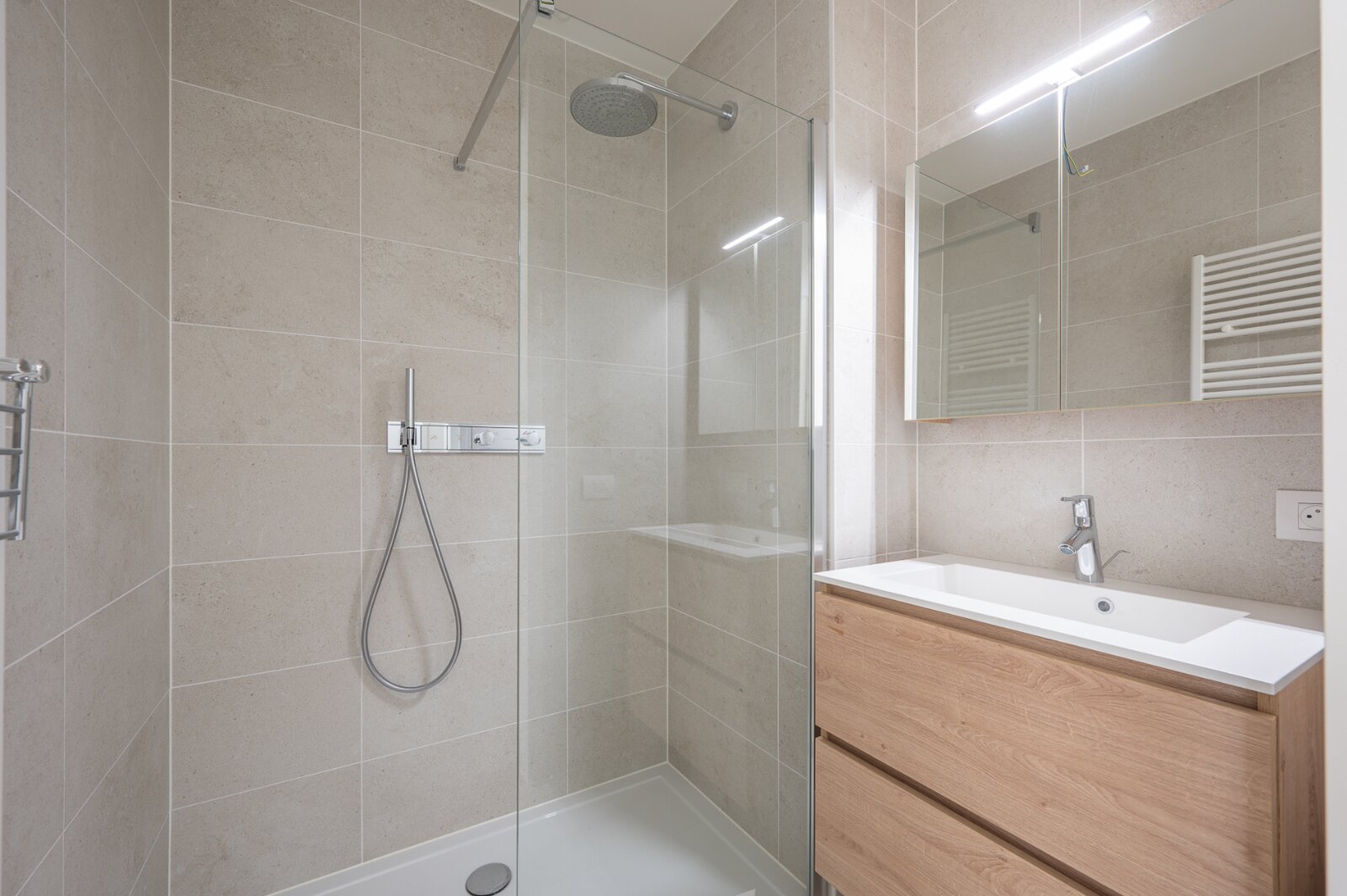 Indeling: Inkom, gastentoilet, ruime berging met aansluitingen voor wasmachine en droogkast, hyper-uitgeruste keuken met prachtig granieten werkblad en ingemaakte kasten, open leefruimte met lichtrijk terras aan de voorzijde. Slaapkamer 1 is voorzien van diepe ingemaakte kasten, slaapkamer 2 bevindt zich achteraan met ingemaakte kasten en een ensuite badkamer voorzien van een dubbele lavabo, bad en apart toilet. Slaapkamer 3 heeft toegang tot het terras achteraan en is ook voorzien van ingemaakte kasten. Daarnaast is er een aparte badkamer met douche toegankelijk voor slaapkamer 1 en 3.